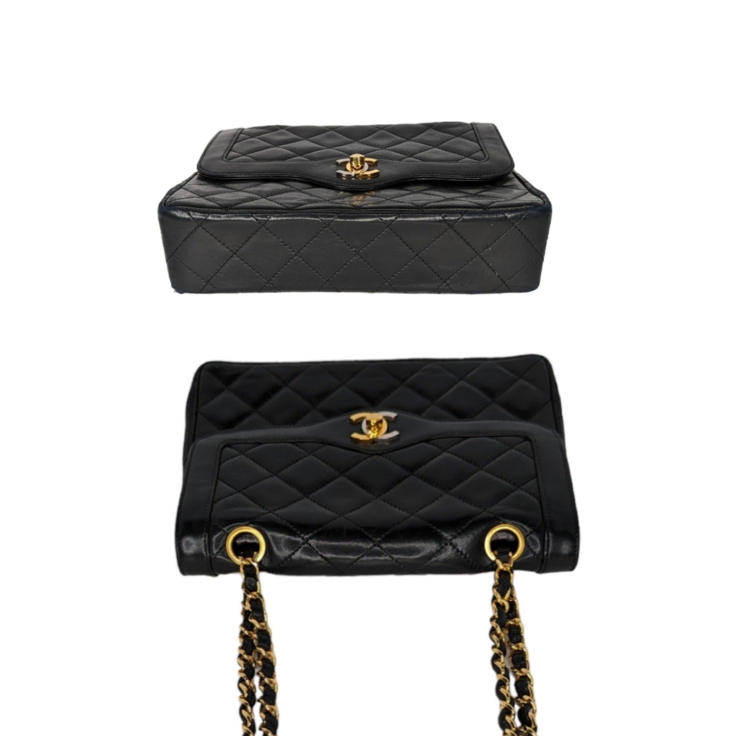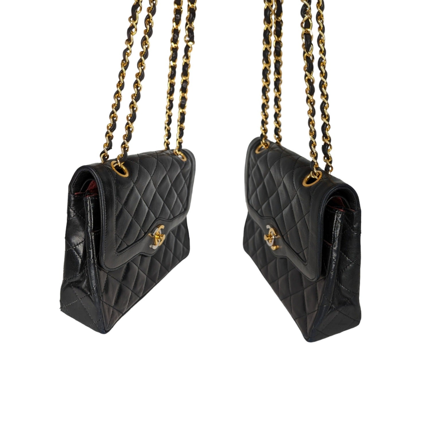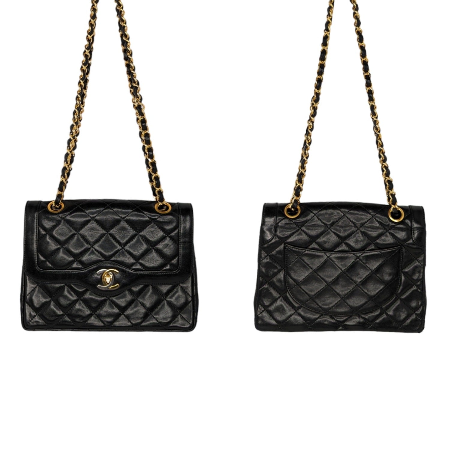 From the 1996-1997 Collection by Karl Lagerfeld. Chanel Bag Coco Paris Double Flap shoulder Bag rendered in black quilted lambskin leather, featuring a border trim and accented with a multi-tone 'CC' turn-lock closure on the front flap.