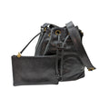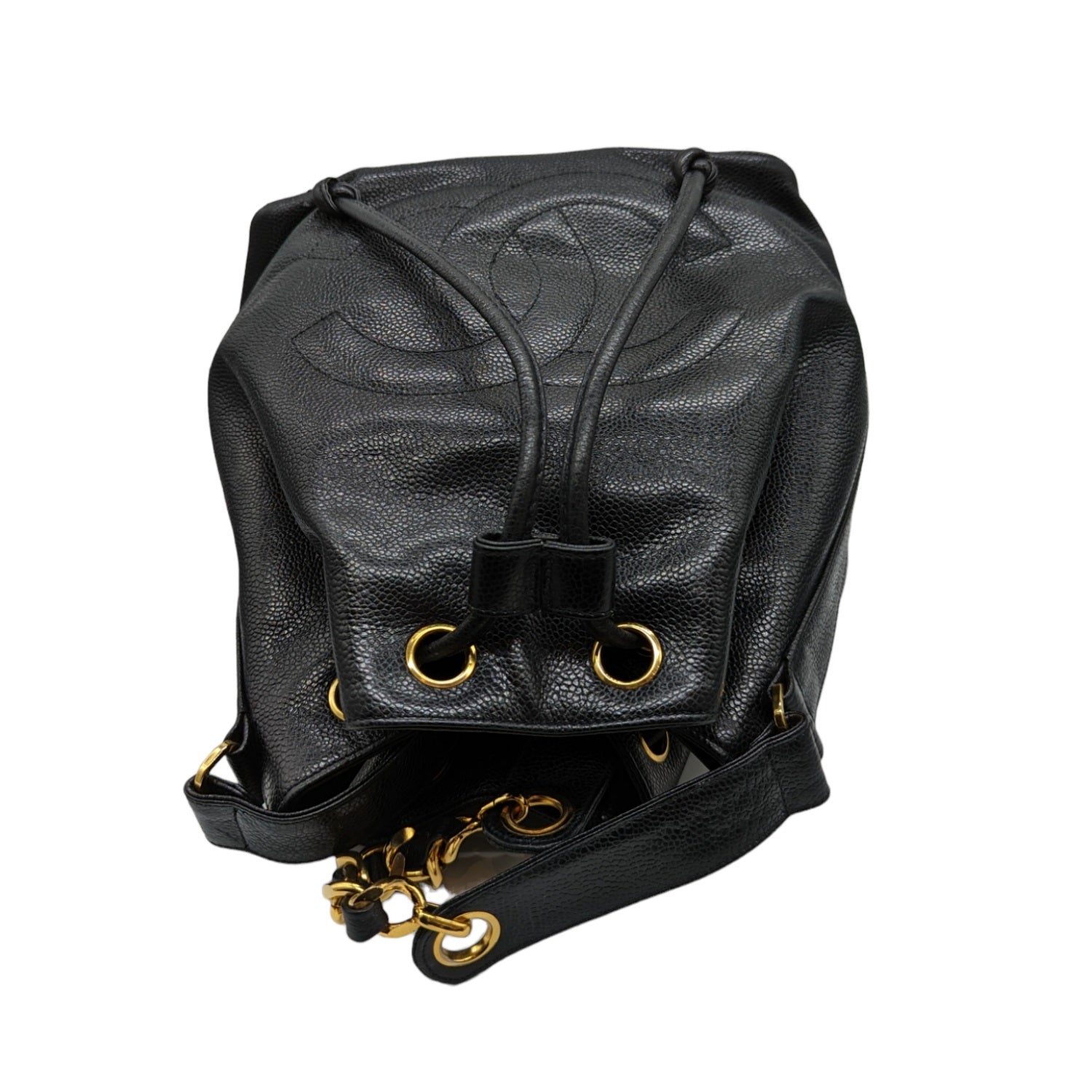 Chanel Bag Vintage Grained Calfskin CC Drawstring Bucket Bag in Black. This stylish bucket-style shoulder Bag is crafted of grained calfskin leather. The Bag features a large leather Chanel Bag CC logo patch and a gold chain link and leather shoulder strap with a cinch cord closure. The top opens to a supple leather lining with an attached zipper pouch.