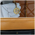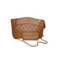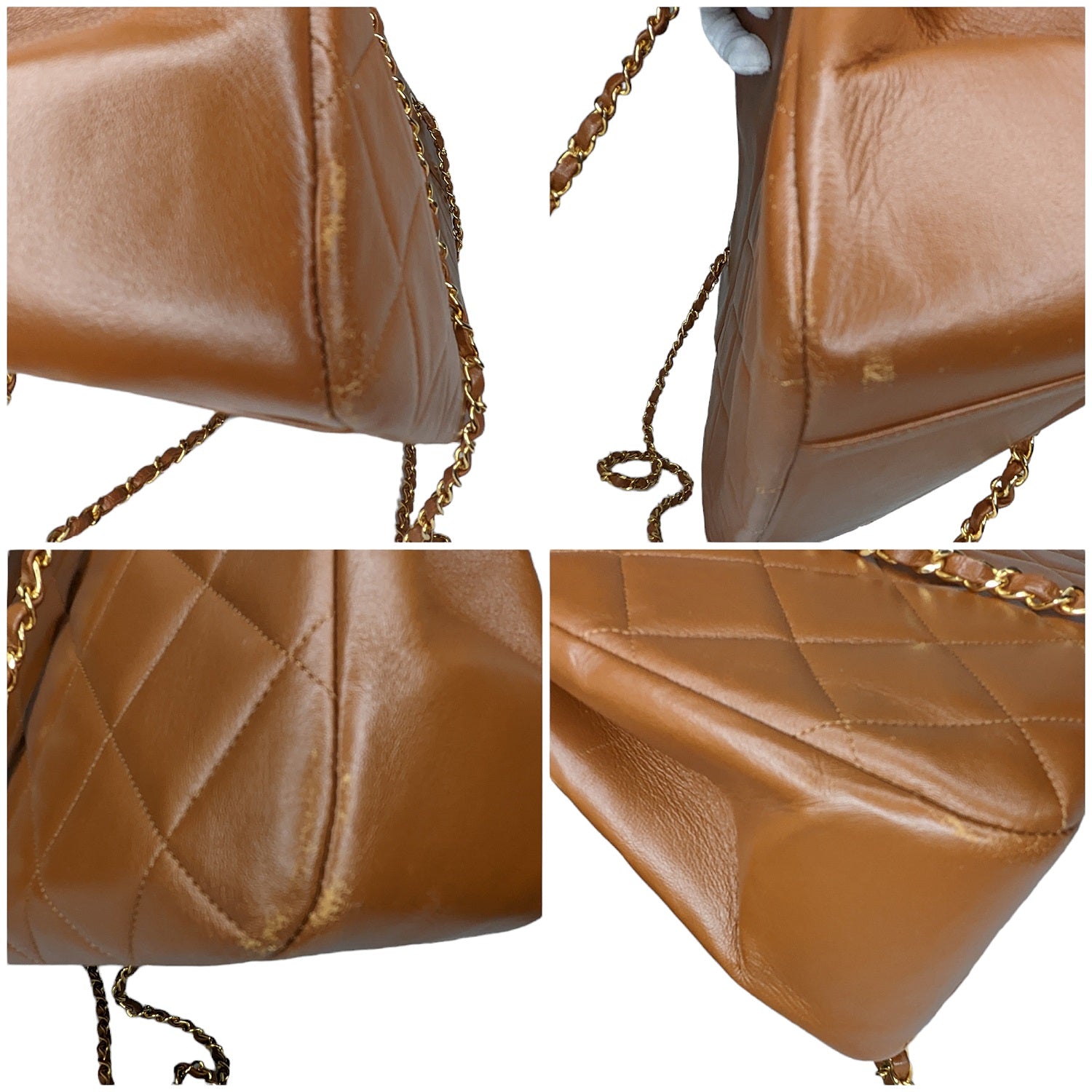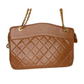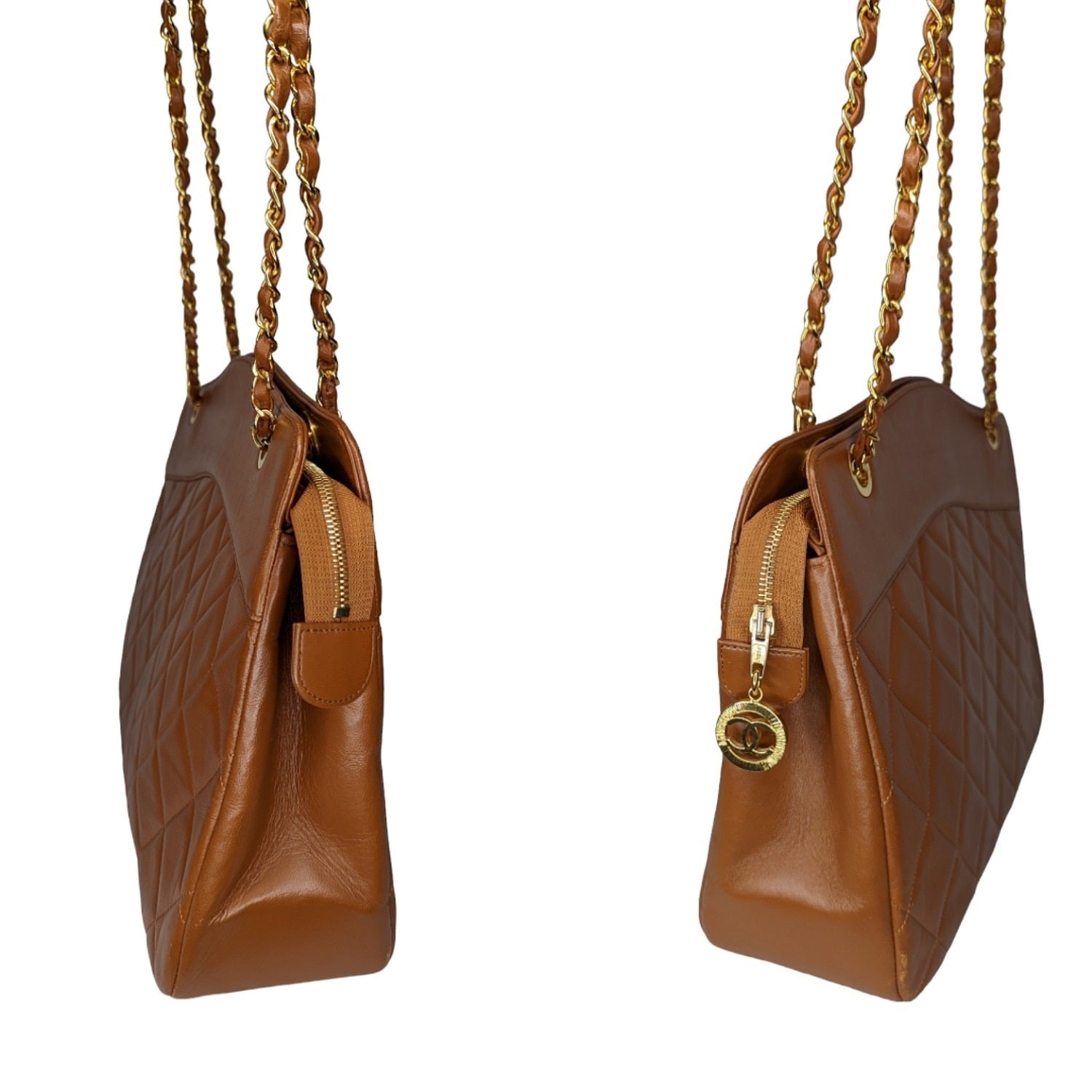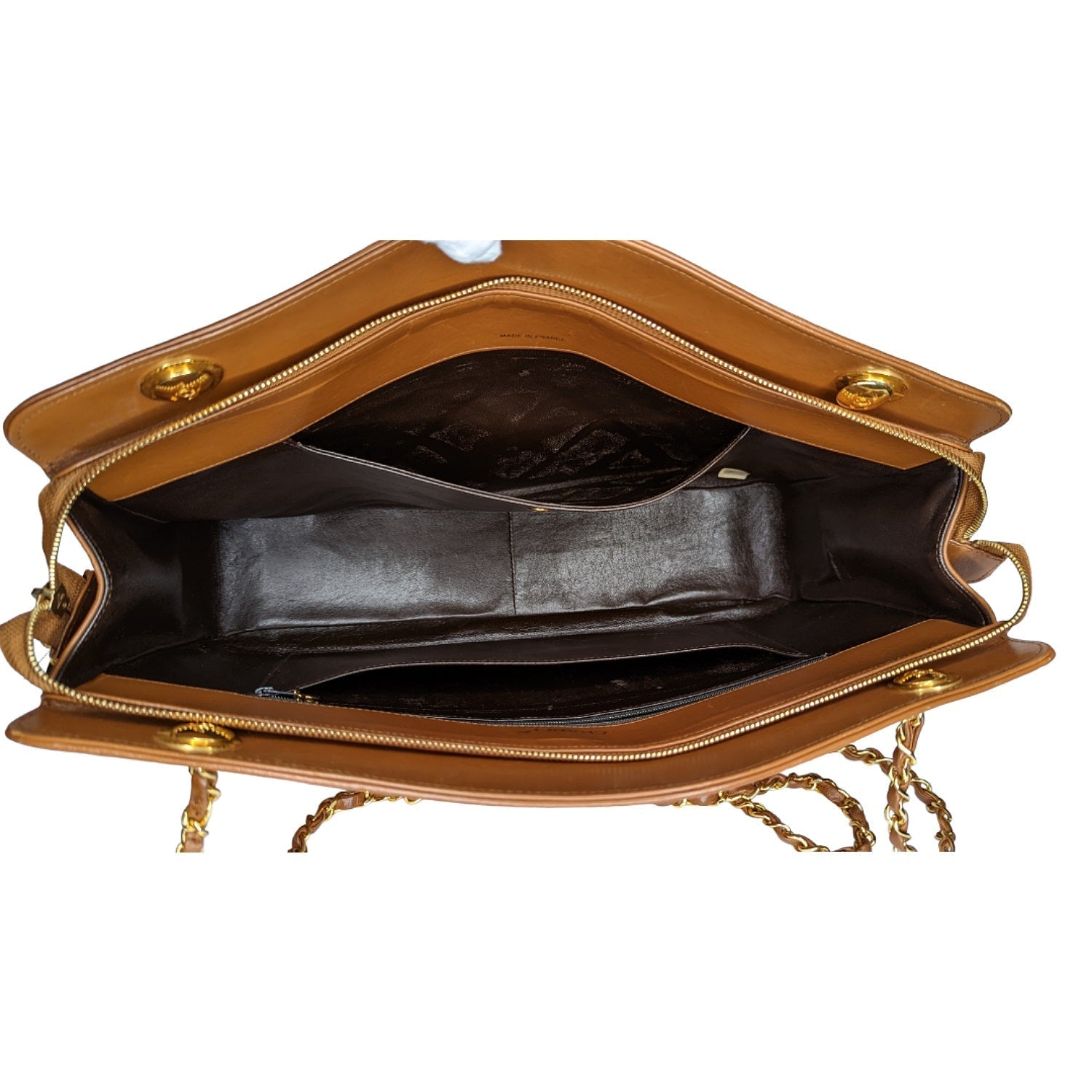 Chanel Bag Vintage Camel colored diamond Lambskin leather tote with gold-tone hardware, leather woven chain shoulder straps, spacious interior lined in leather with three pockets and a single zipper CC medallion pull. Comes with a matching 7.5" x 4" wallet.
