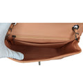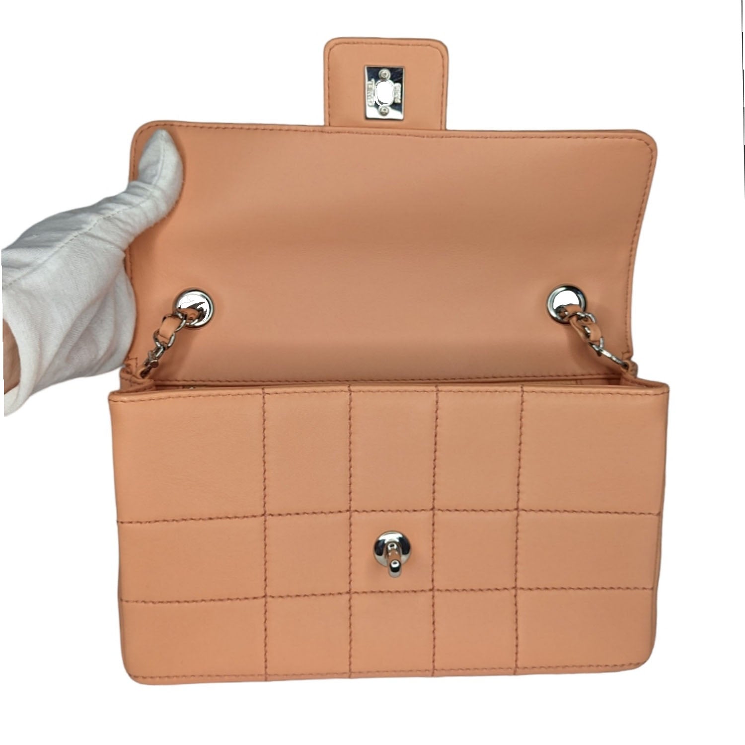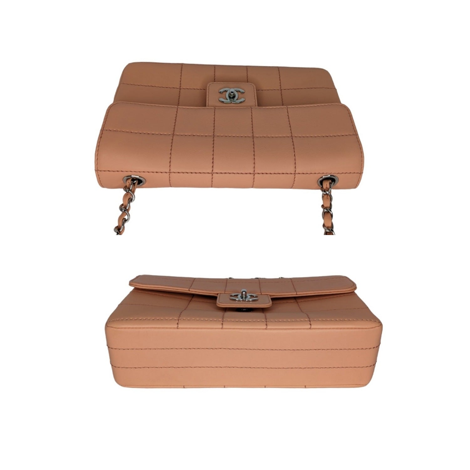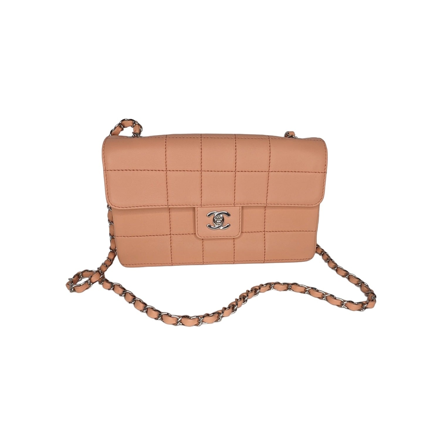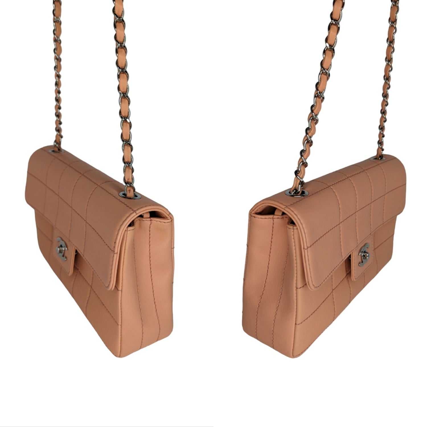 Peach square quilted lambskin leather with polished silver-tone hardware, chain-link shoulder strap, an exterior rear patch pocket, tonal leather lining, two pockets at interior wall, the front flap secured with a CC turn-lock closure. Made in France.