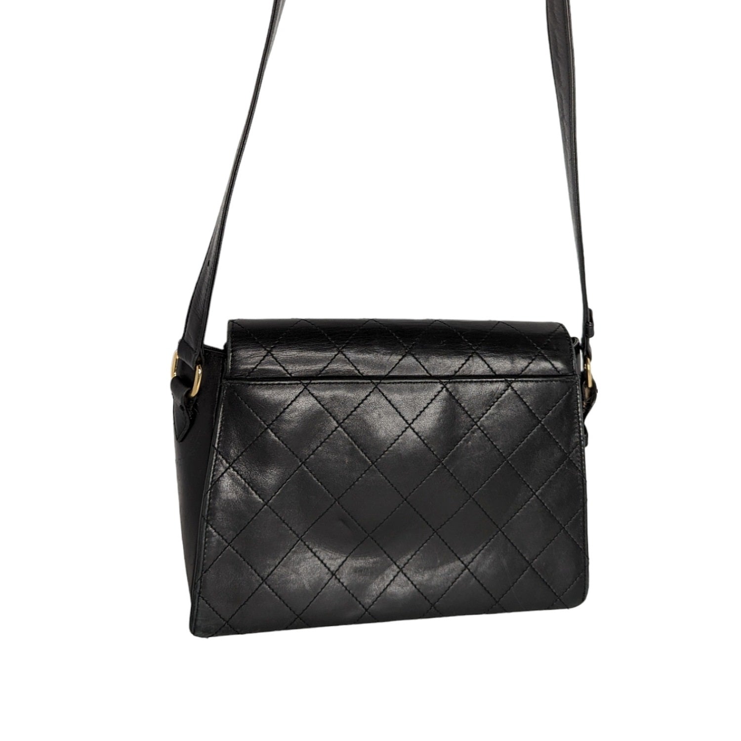 This stylish messenger Bag is crafted of diamond quilted lambskin leather in black. The Bag features an adjustable leather shoulder strap. The front flap has a gold plated Mademoiselle turn-lock and opens to a black leather interior with zipper and patch pockets.