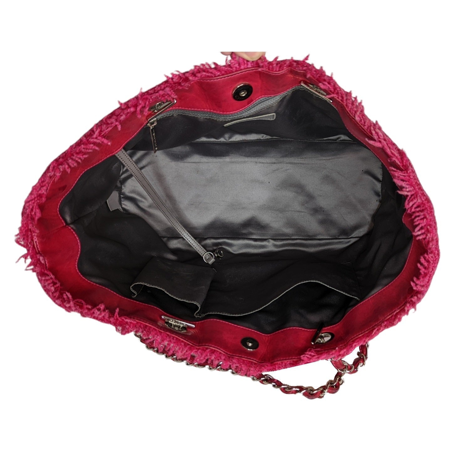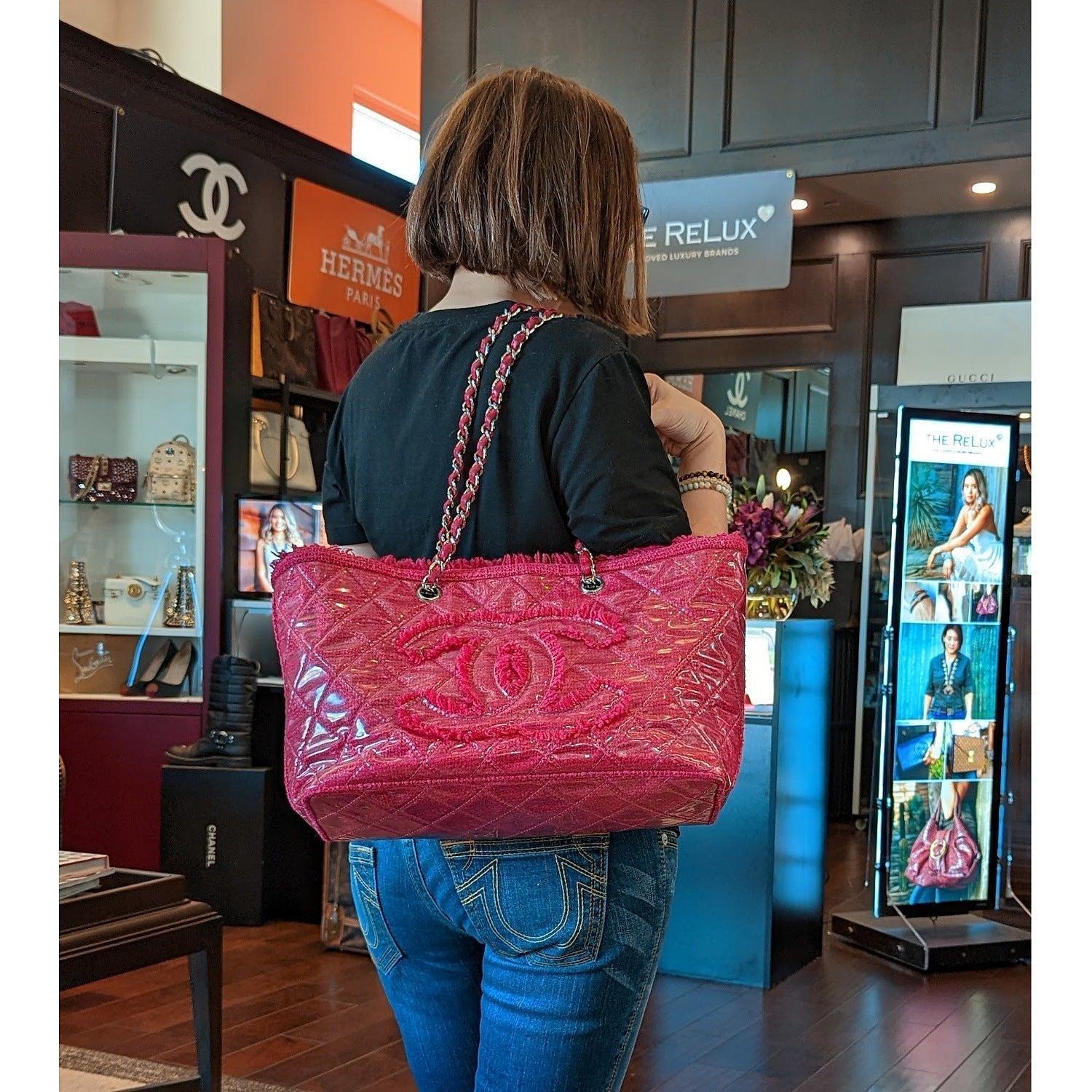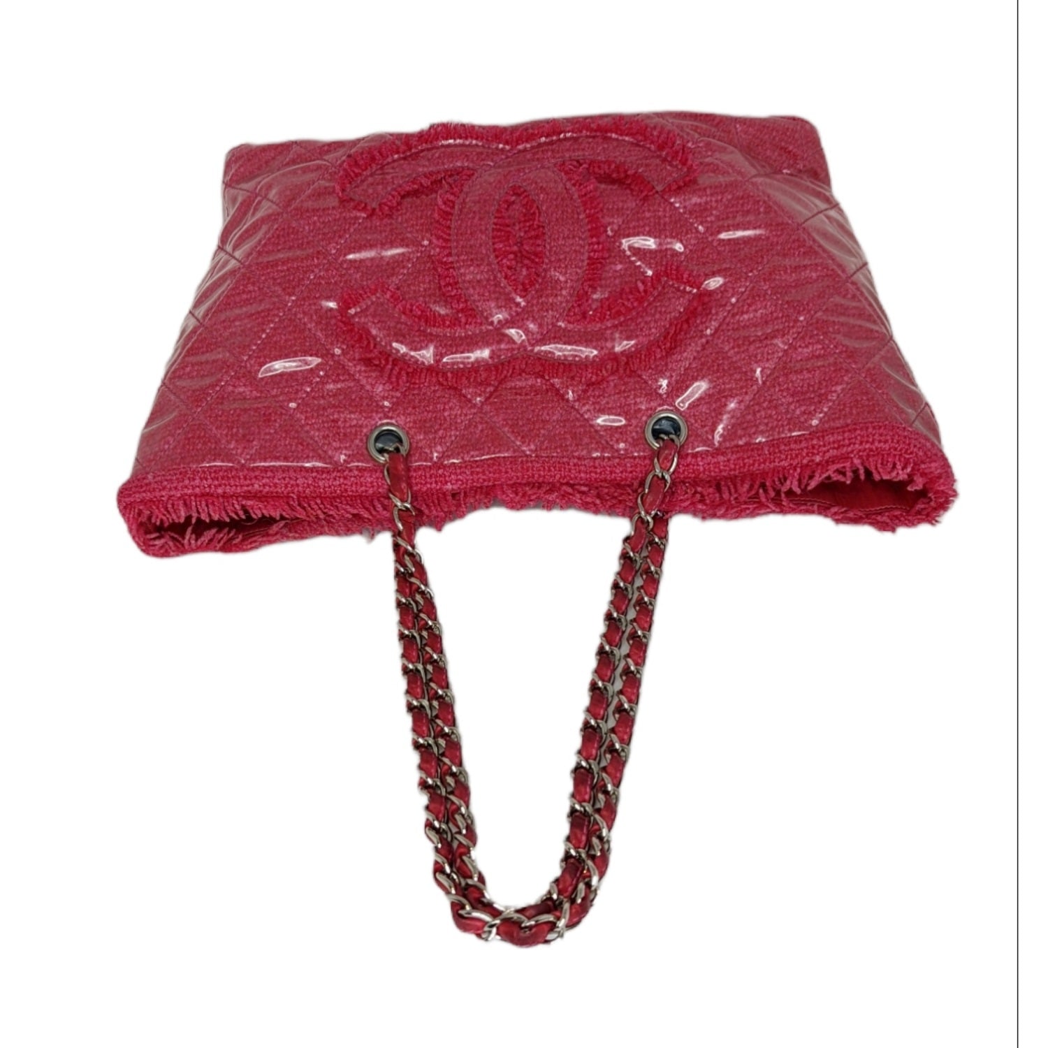 From the Pre-Fall 2009 Collection by Karl Lagerfeld. This chic tote is crafted of pink tweed with frayed edges layered with clear diamond quilted vinyl. There is a large embroidered Chanel Bag CC, and silver chain shoulder straps threaded with pink leather. The top is open to a satin interior with zippered and patch pockets.