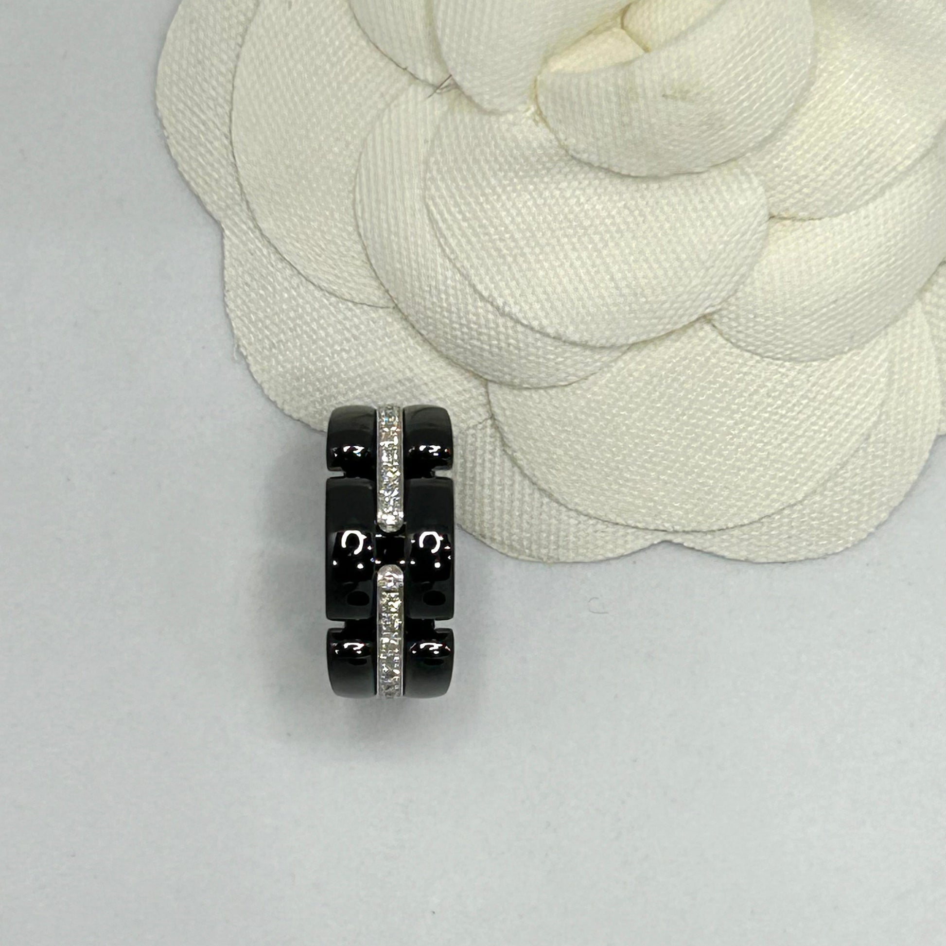La bague Ultra de la maison Chanel est un bijou élégant et contemporain, alliant la sophistication de la céramique noire et l’éclat des diamants. Son design minimaliste et épuré met en valeur la beauté intemporelle de la céramique, tandis que les diamants subtilement incrustés ajoutent une touche de luxe et de raffinement.
