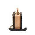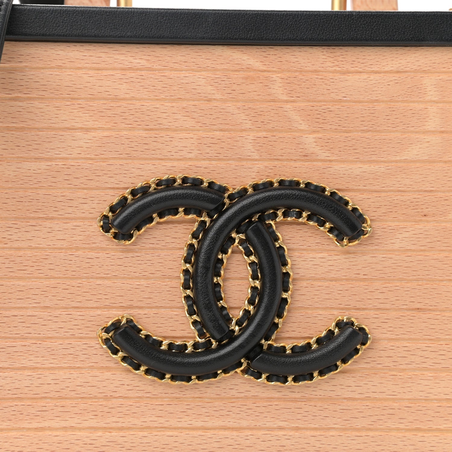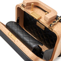 This luxurious shoulder bag is crafted of Beech wood and Black Lambskin leather trim. This elegant shoulder bag features a gold chain link black leather threaded shoulder strap, a wooden handle, and a large CC logo on the front. The top opens to a wood and black leather interior with a pocket.