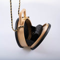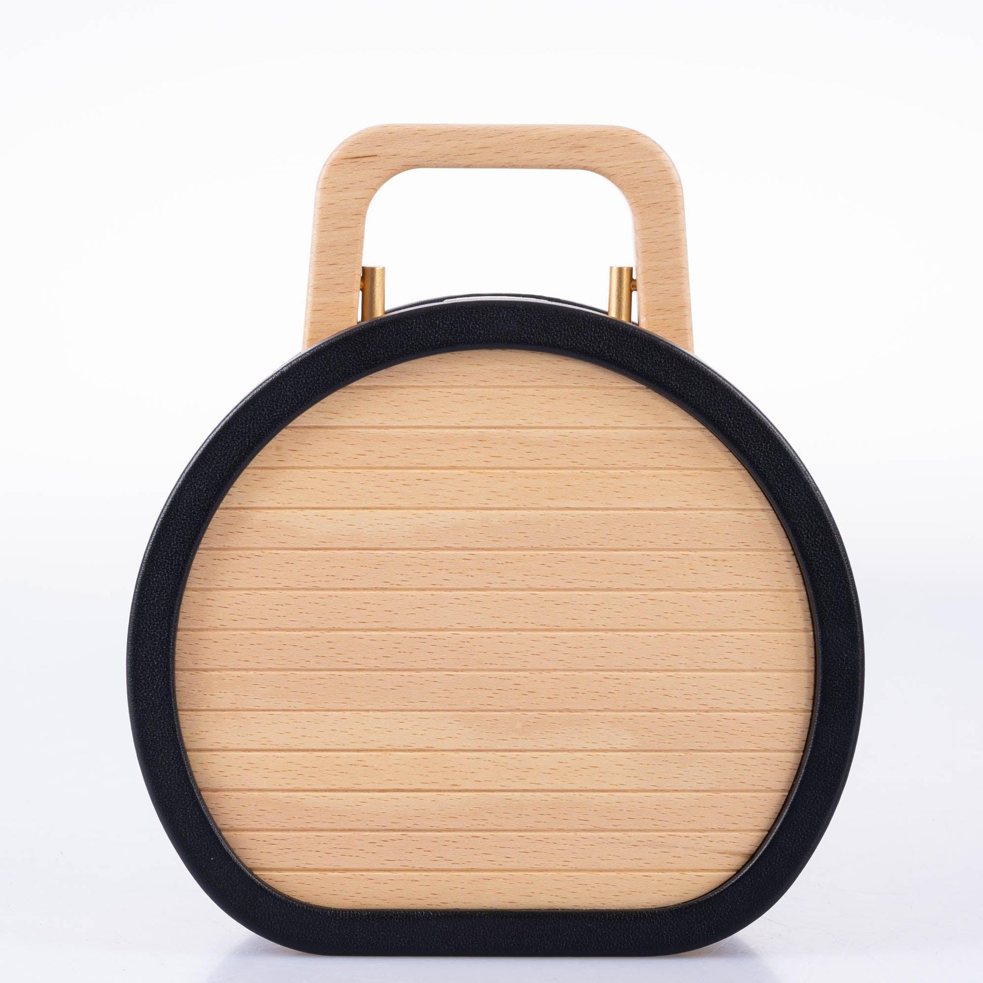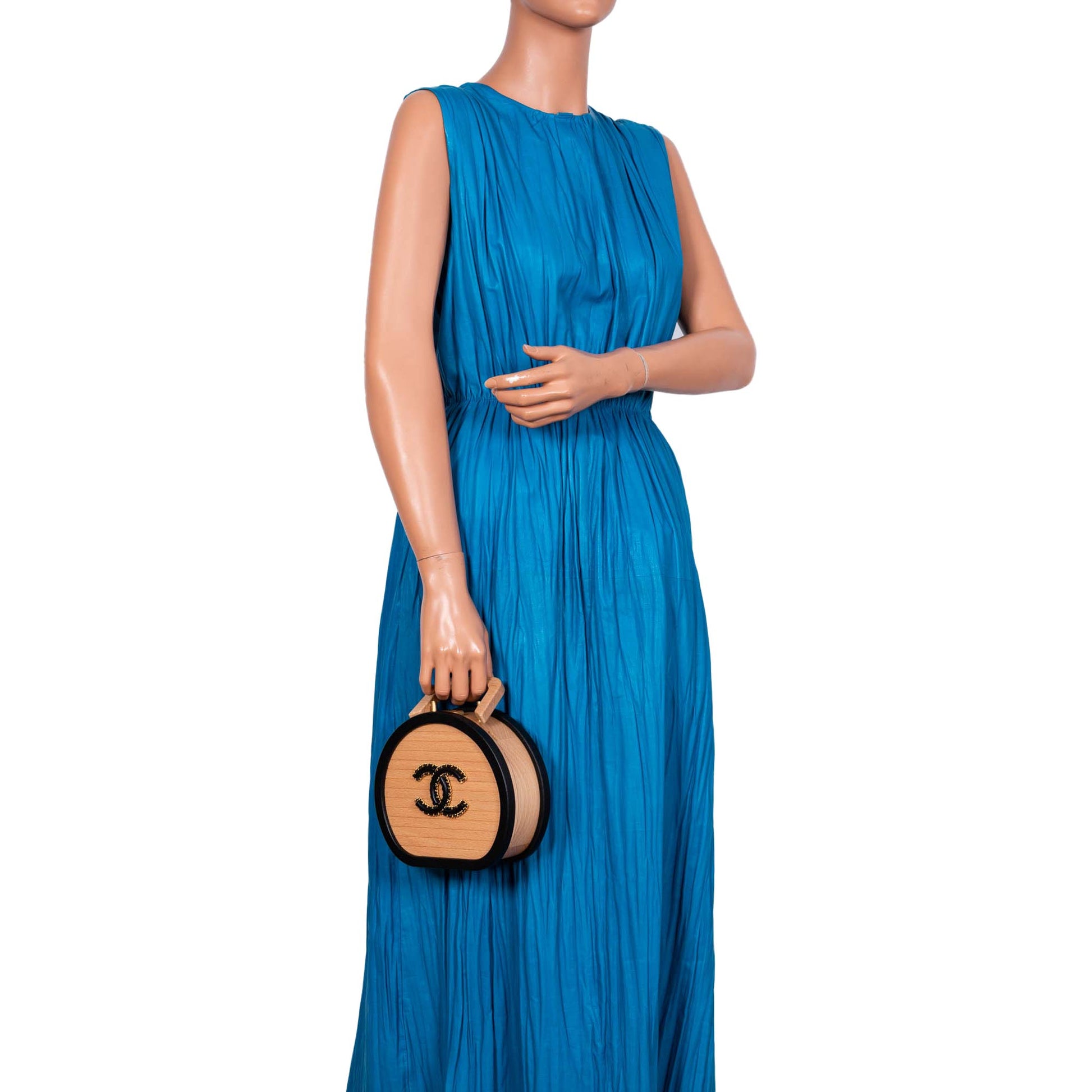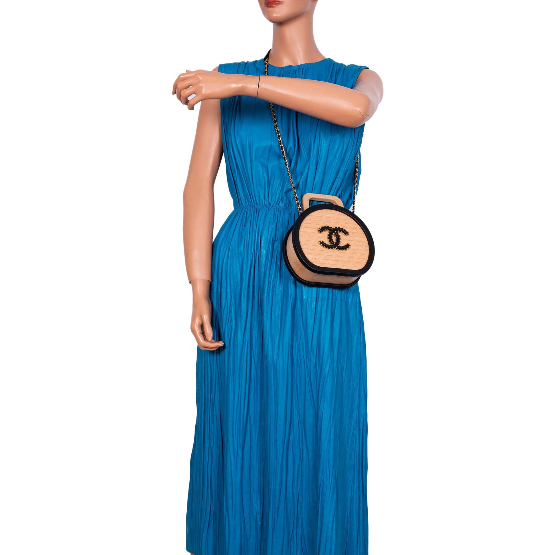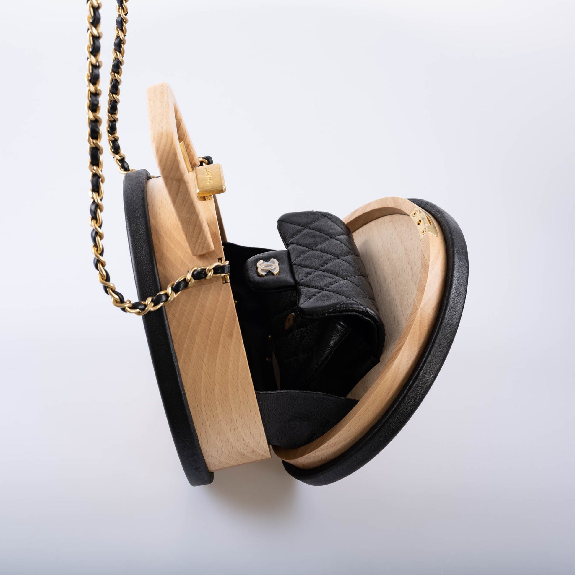 This Chanel Vanity Case is a testament to innovative design, blending the earthy robustness of beechwood with the sumptuous softness of black lambskin. The 2022 creation marries the rustic charm of the wood with the luxe quilted lambskin interior, revealing a classic flap pocket that pays homage to Chanel's storied past. Adorned with gold hardware that shines with an aura of timeless sophistication, this bag is an emblem of chic functionality. The round silhouette of the case offers a contemporary twist to the classic vanity form, while the black and gold color scheme exudes a classic Chanel finesse. It's not just a bag; it's a showcase of the wearer's impeccable taste and a nod to the art of travel with elegance and grace. The chain shoulder strap can be tucked inside the bag.