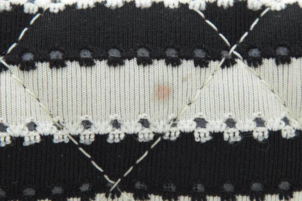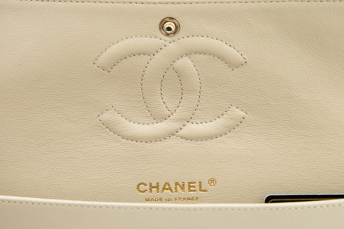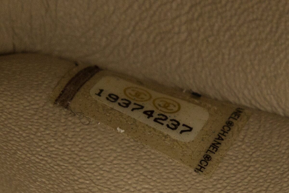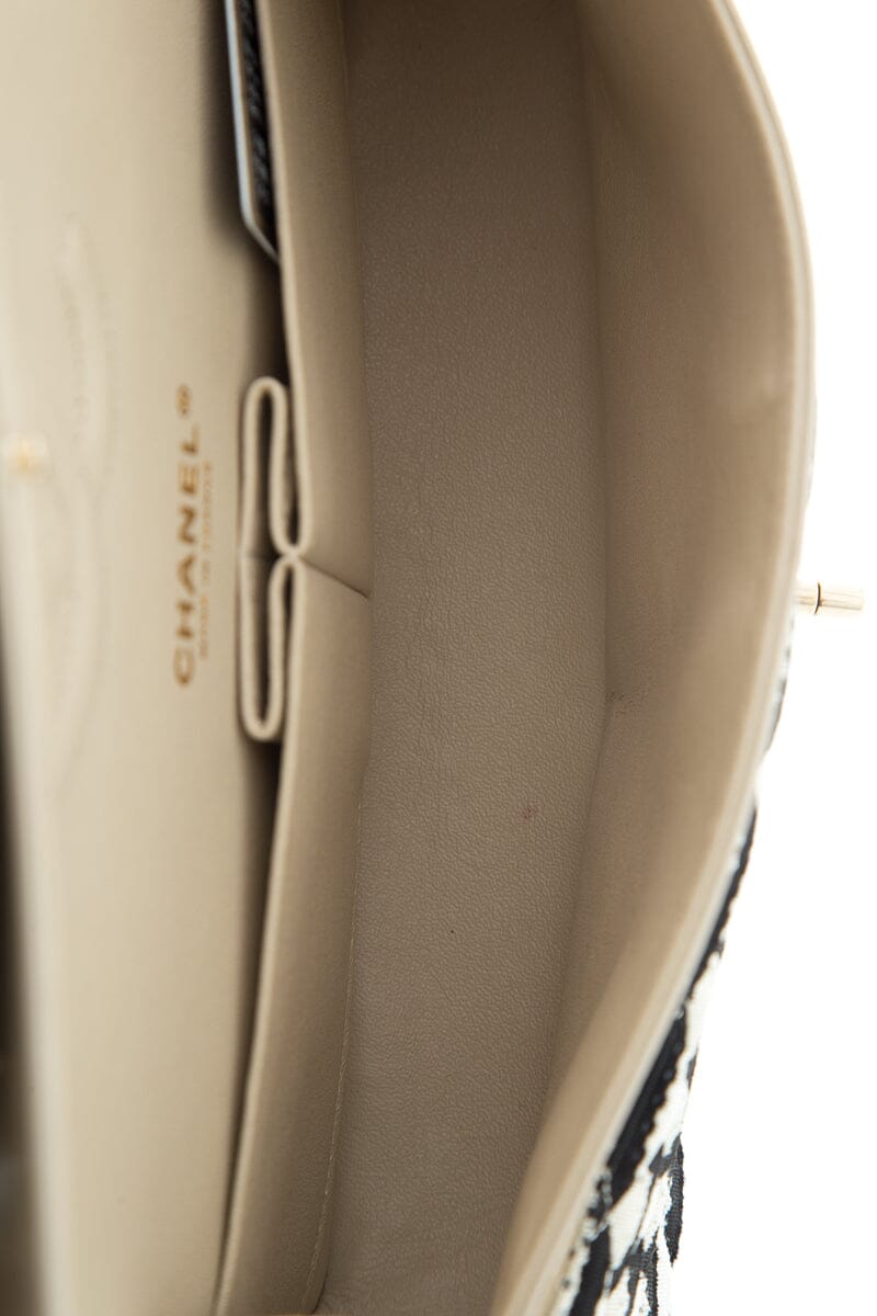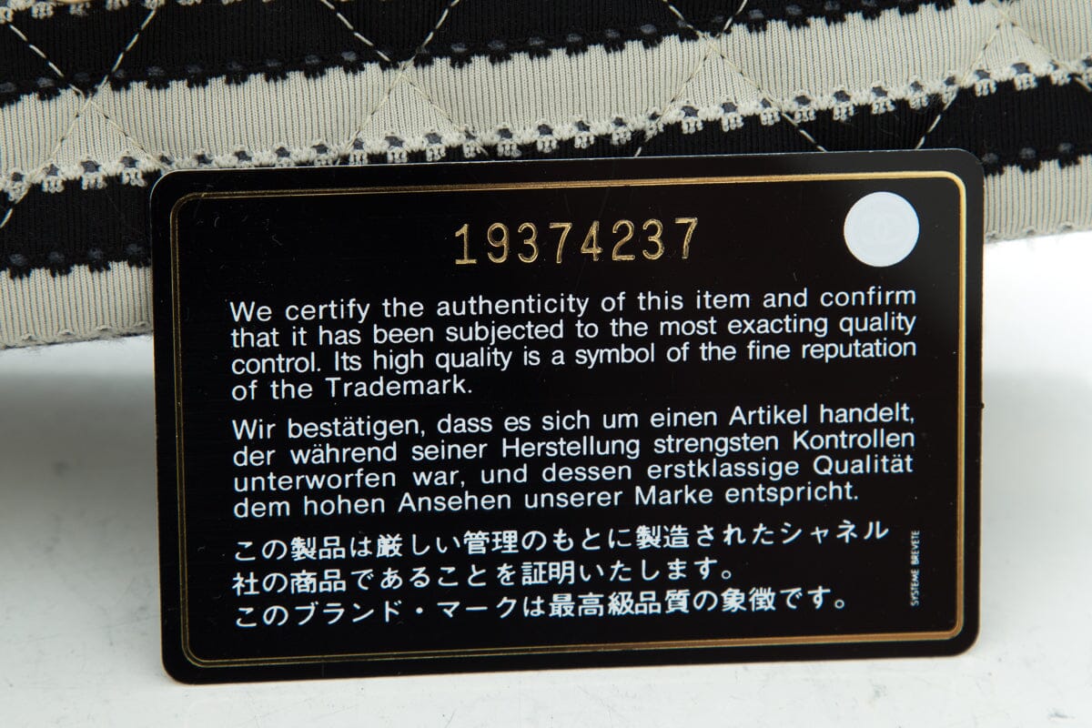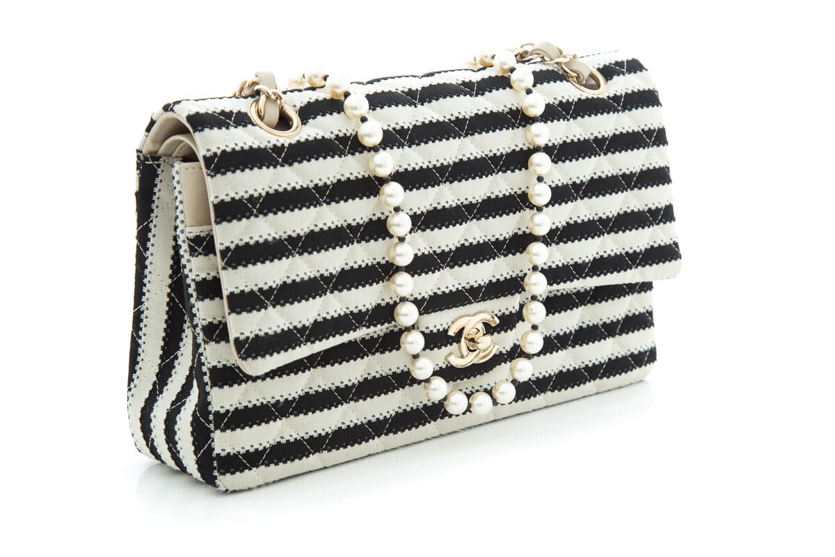 Chanel Beige & Black Classic Double Flap Quilted Striped Canvas Medium Cross-Body with Leather lining and three interior pockets. From the spring/ summer collection of 2014 featuring a faux pearl and chain link strap and cc turn lock. date code 19374237. This item is in very good condition; small mark on exterior.