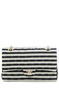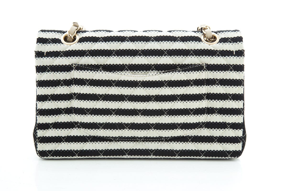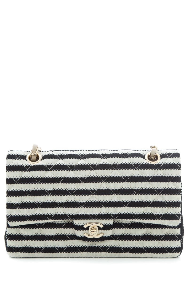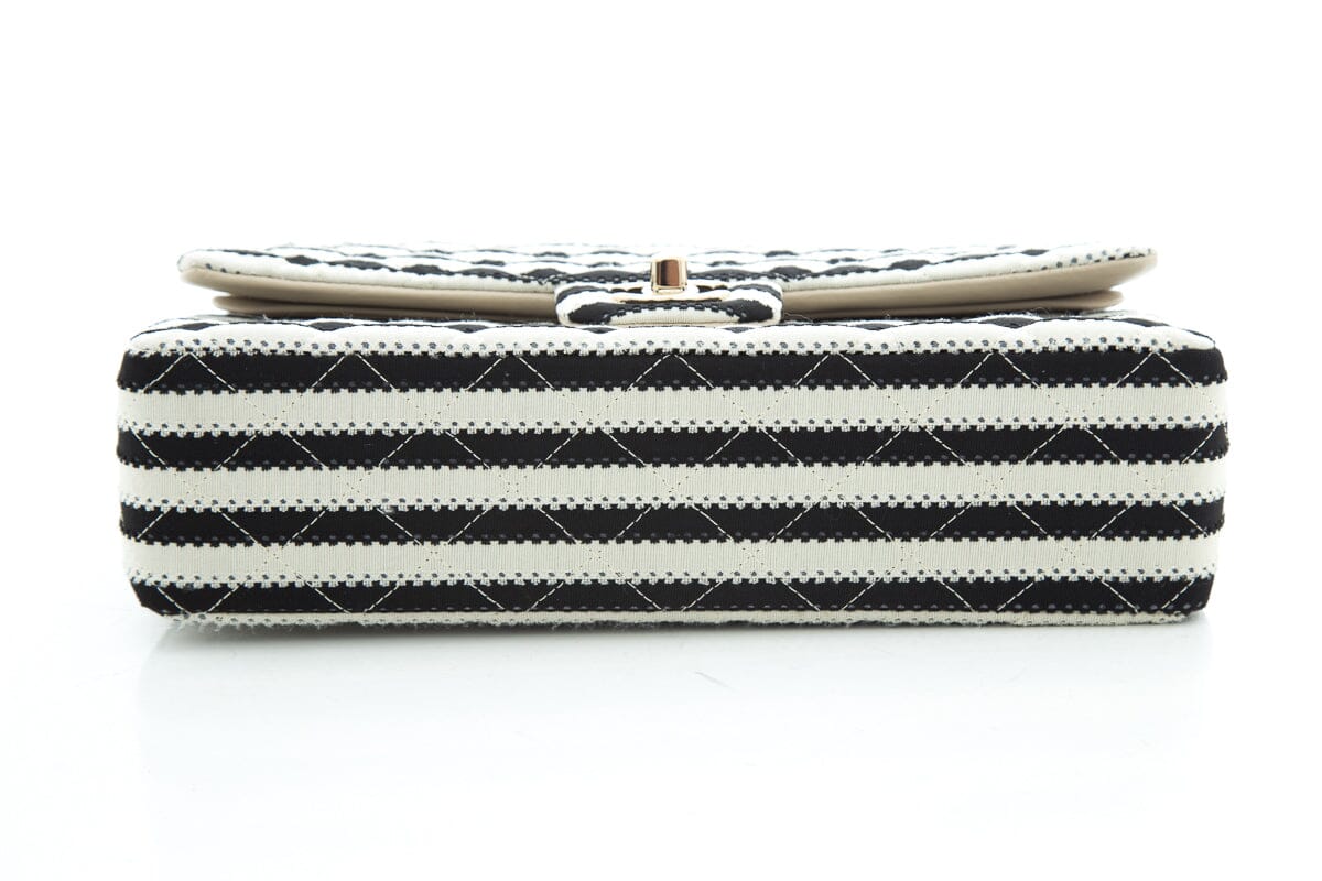 Chanel Beige & Black Classic Double Flap Quilted Striped Canvas Med Cross-Body