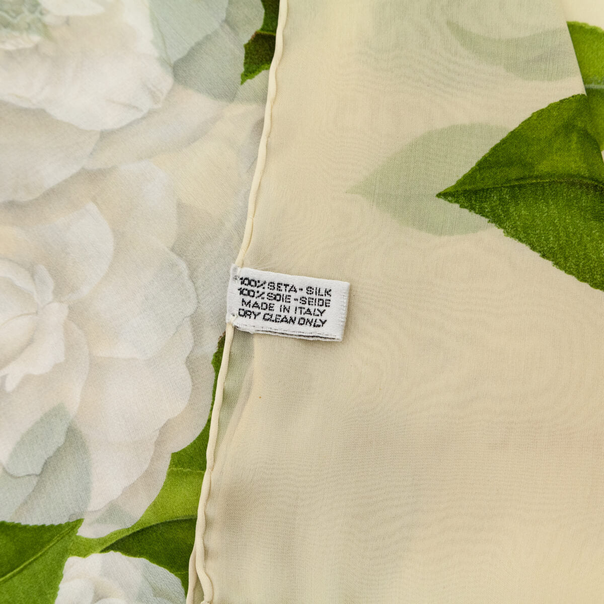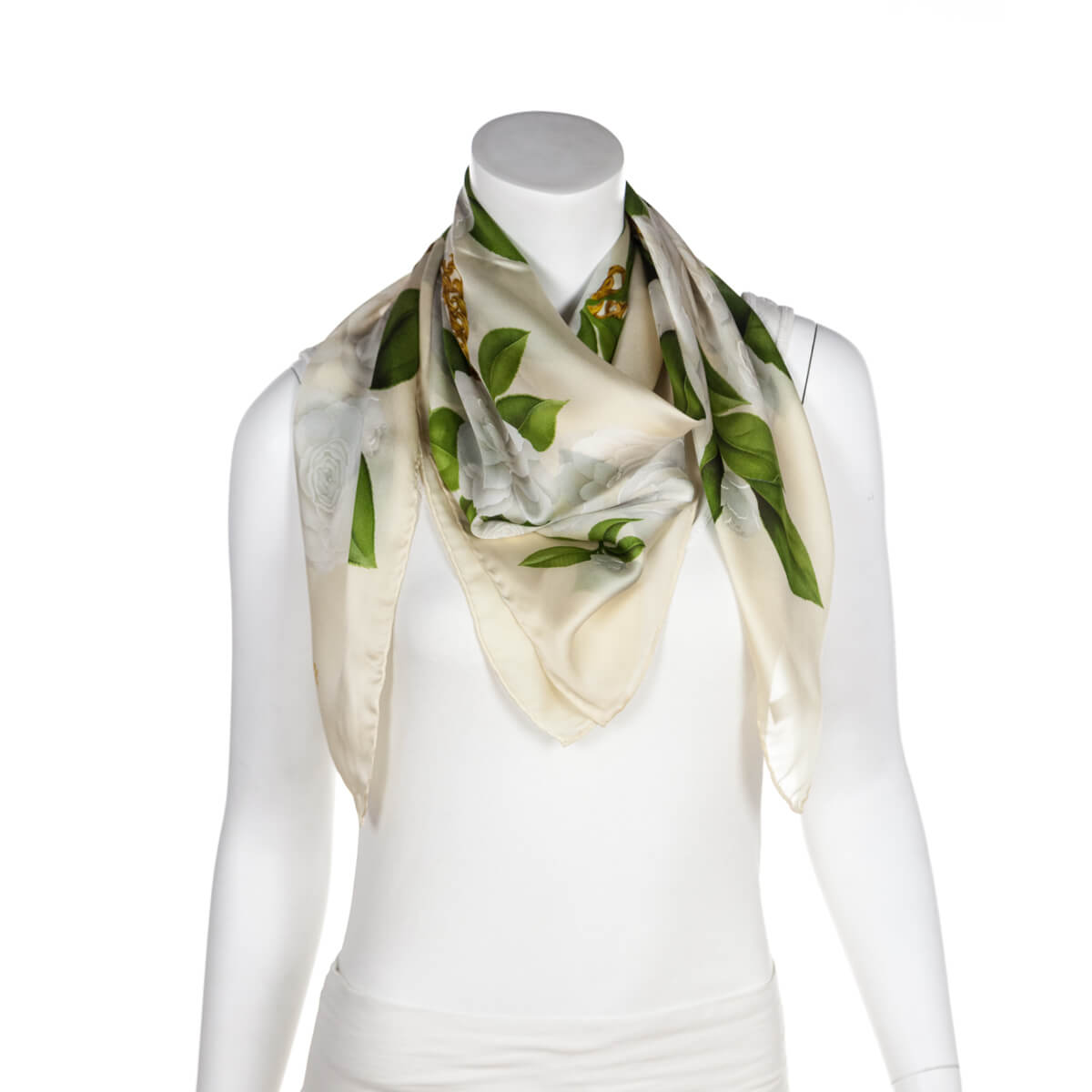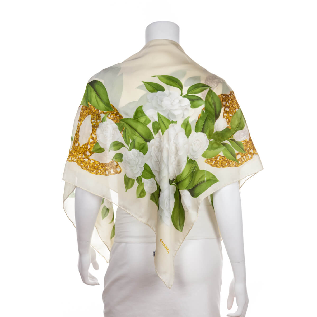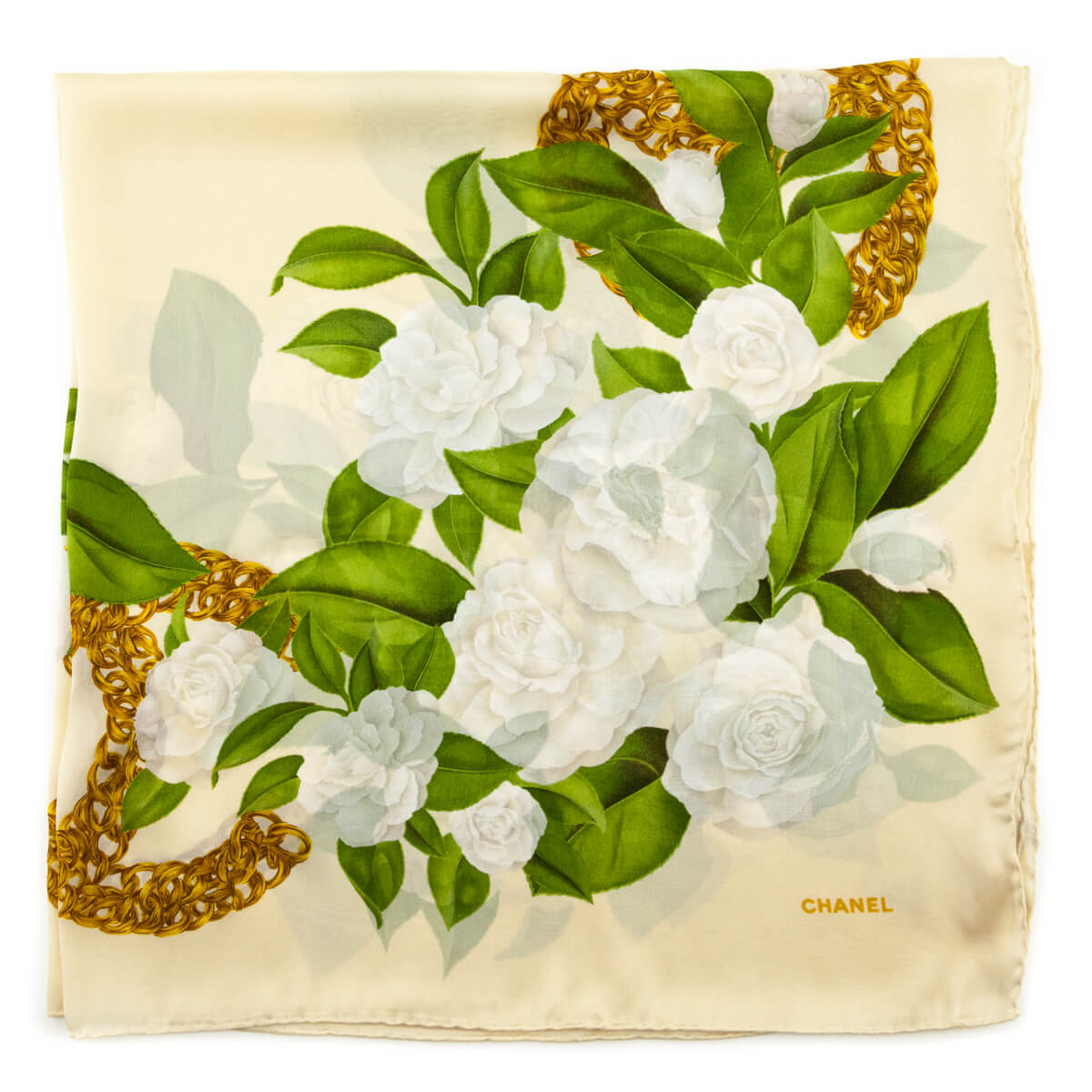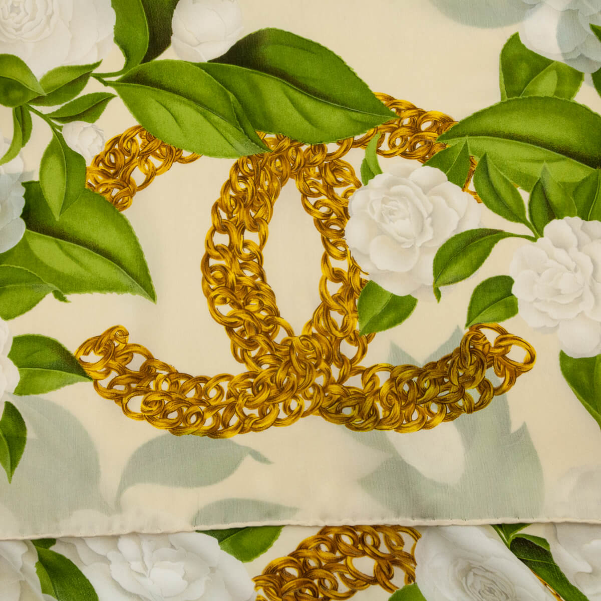 This Chanel Camellia scarf is a versatile statement piece displaying a gorgeous floral print that perfectly captures the French brand's chic aesthetic. Crafted in Italy, this delicate beige silk chiffon designer scarf showcases numerous white camellia flowers, with large gold chain-link CC logos intertwined for some lightly contrasting edge. A small gold Chanel logo embellishes the bottom right corner, and tonal hand-rolled edges complete the look of this Chanel Silk Scarf. Style this luxury scarf with a beige tweed blazer, leather loafers, and your favorite shoulder bag for a sophisticated dinner date look.