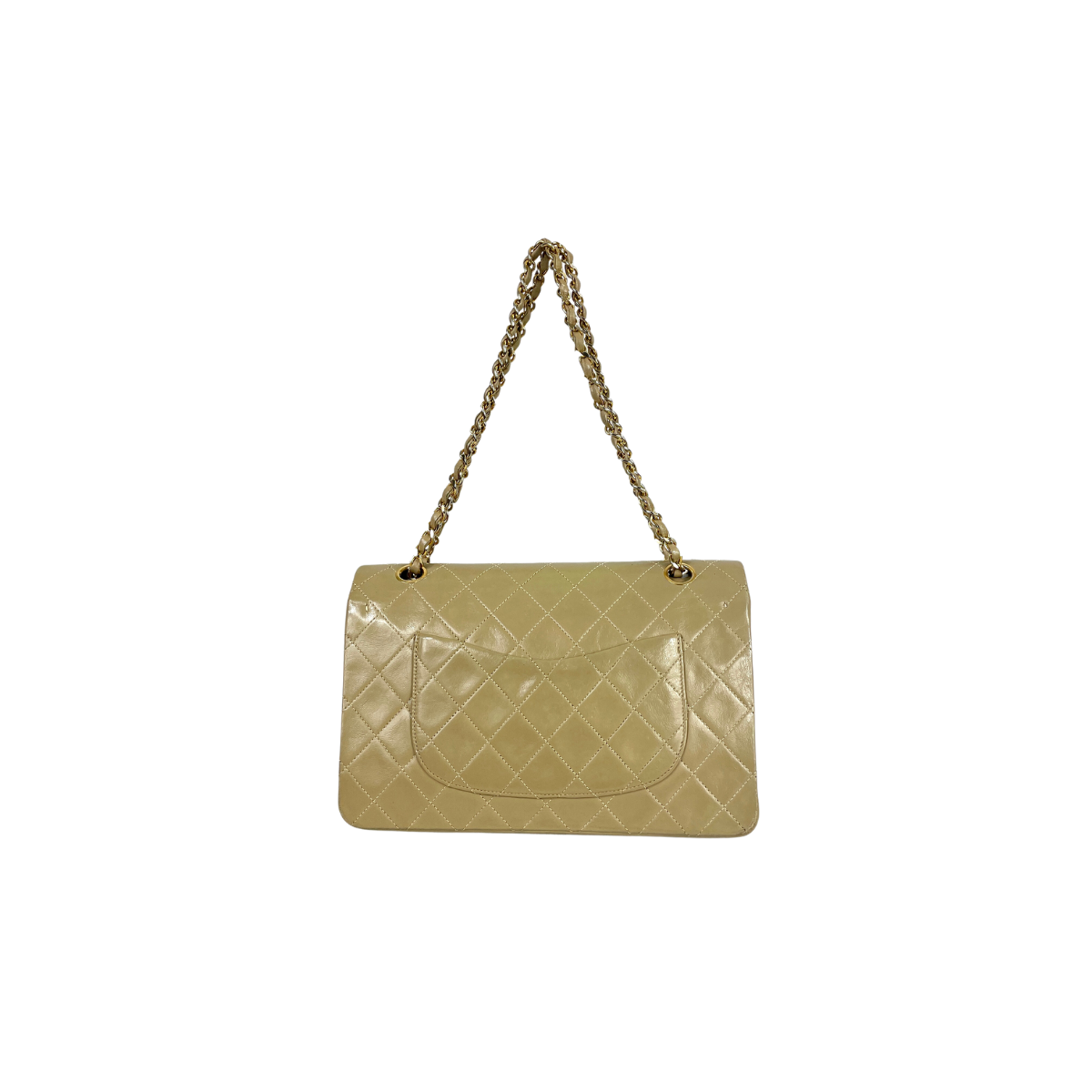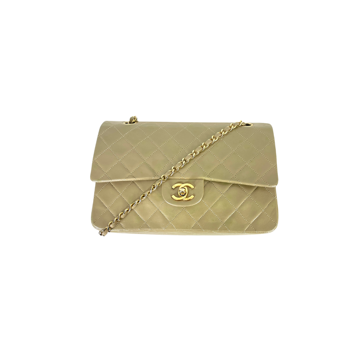 Chanel Classic Flap Bag in a size Medium in beige Lambskin Leather with gold-colored hardware. The bag opens with the interlocking CC lock. The bag has a slip-in pocket on the back. The beige leather inside of the bag features two compartments. The main compartment has two smaller slip-in pockets and one bigger slip-in pocket. Inside the flap is a small zipper pocket that was designed to store your secret love letters. This Classic Flap bag can be on the shoulder, unfortunately, the shoulder strap is too short to be crossbody. The bag comes with the serial number inside. It's a timeless and truly iconic bag for everyday use. The overall condition of the item is good and the inside of the bag is neat. This item comes with an enticity card. This item comes with an enticity card.