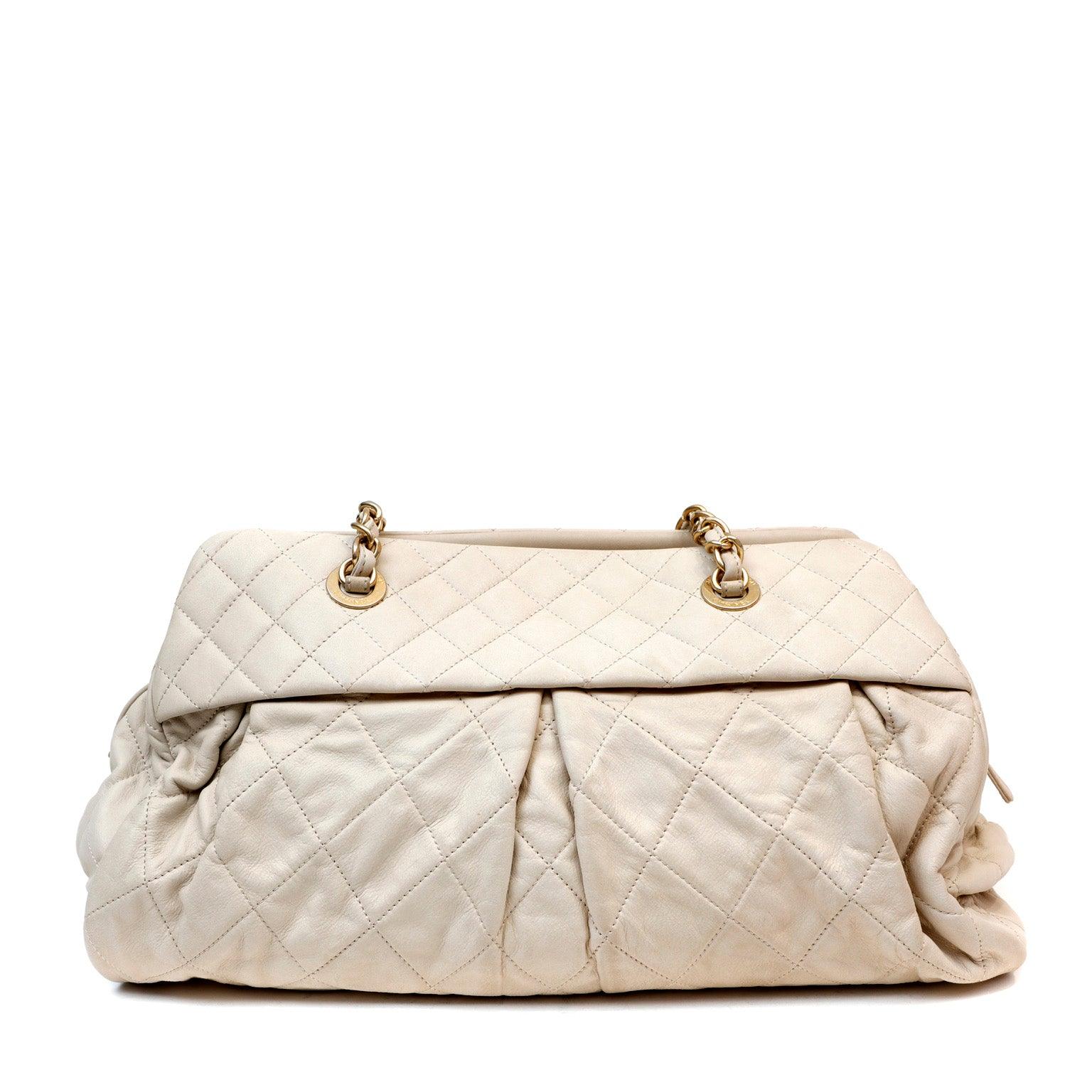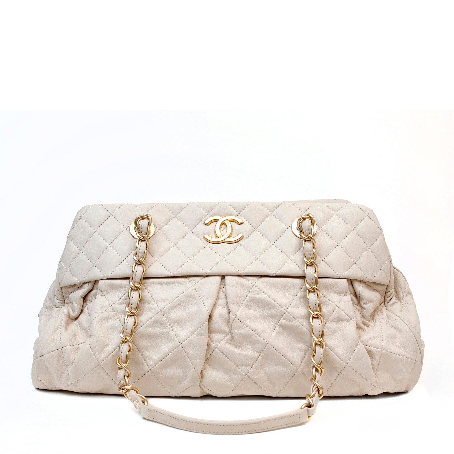Soft beige lambskin is topstitched in signature Chanel diamond pattern. Feminine pleats add dimension. Matte gold hardware accents. Double straps may be carried snuggly on the shoulder. Dust bag included.