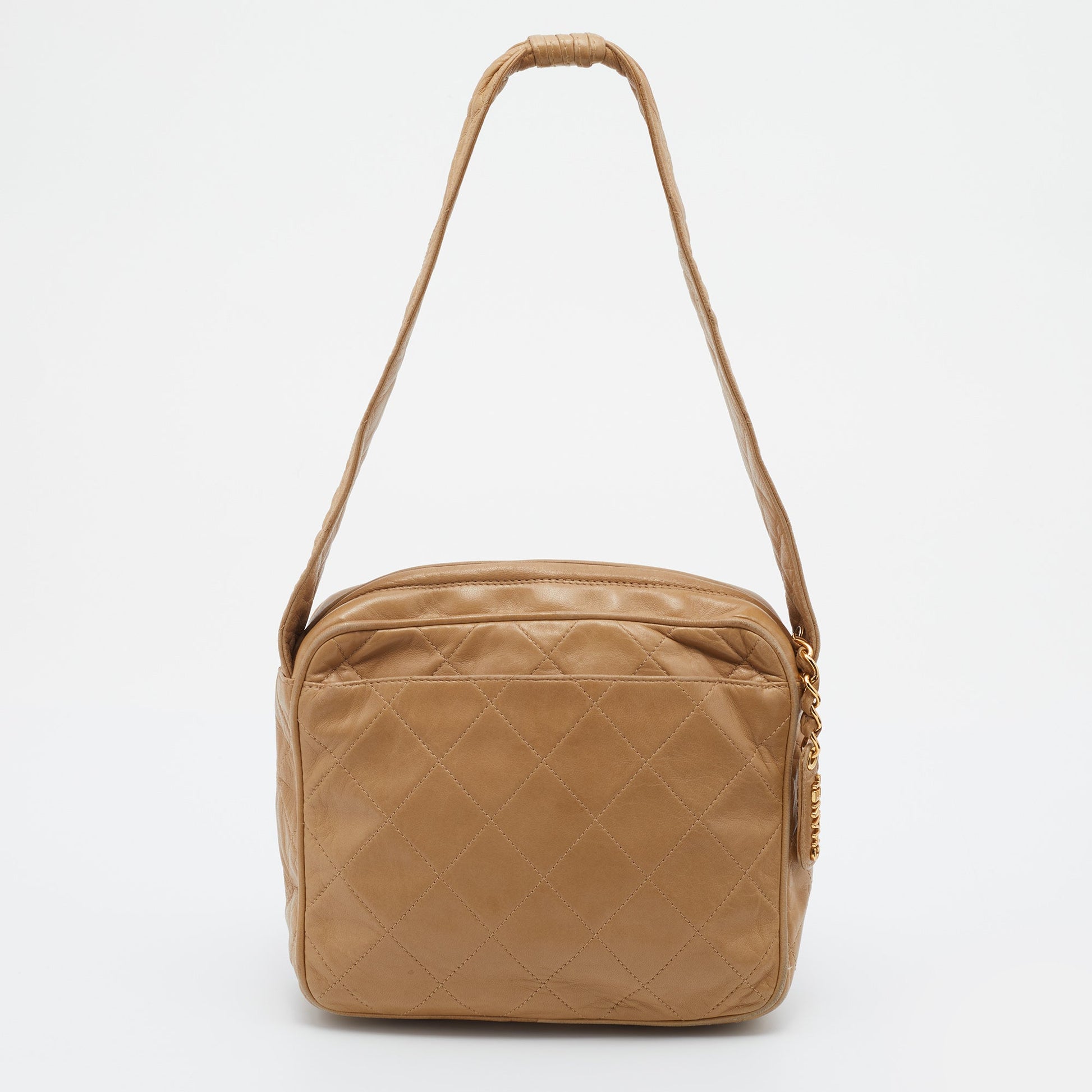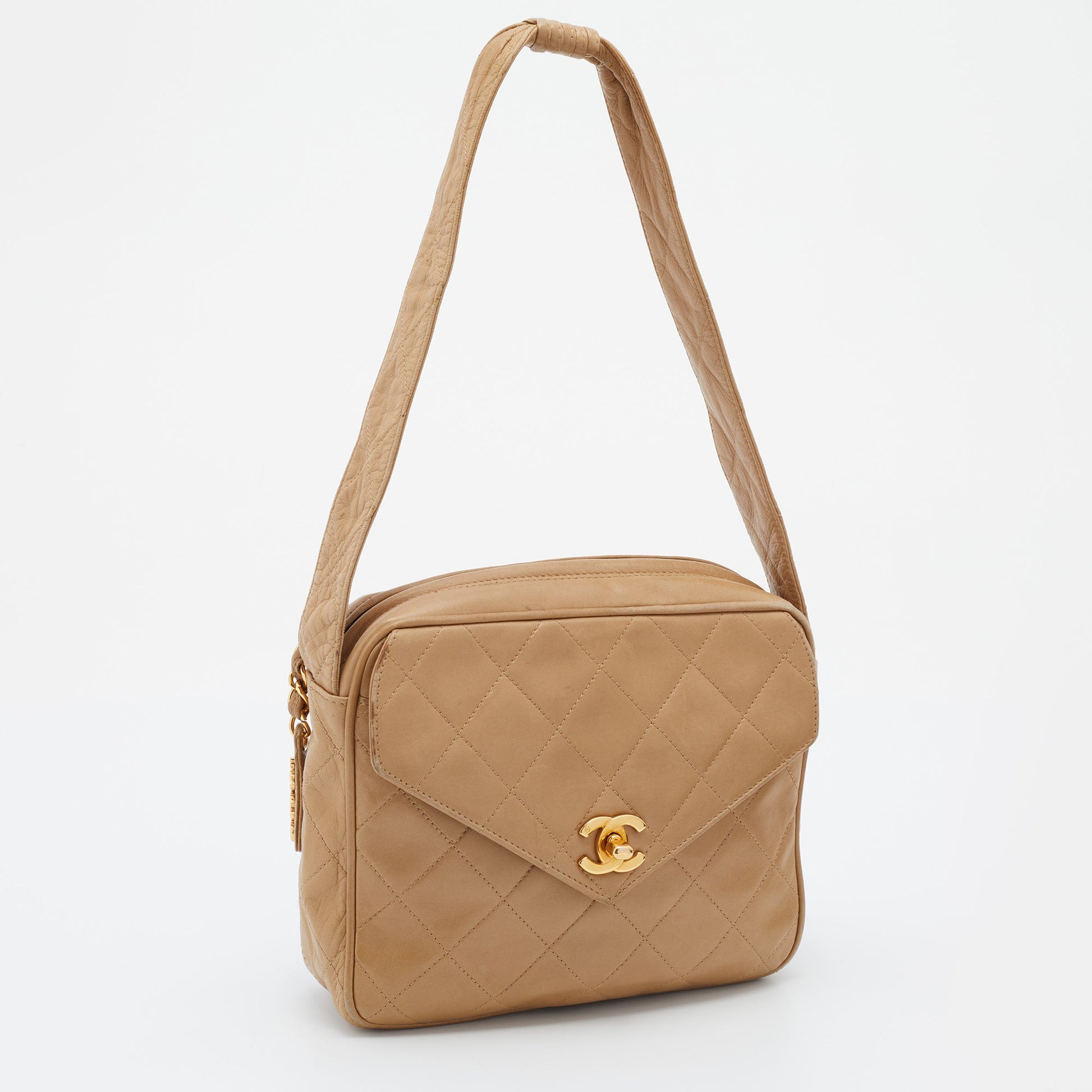 This exquisite Chanel camera bag is just the right choice for day to night outings. It is made from luxe quilted leather and has gold tone hardware. The pretty beige bag opens into a roomy interior to house your essential items.