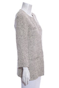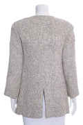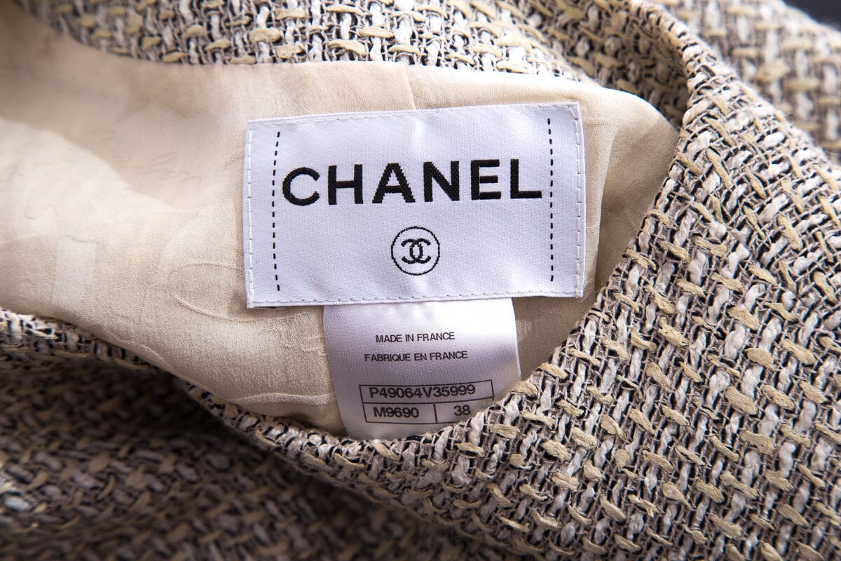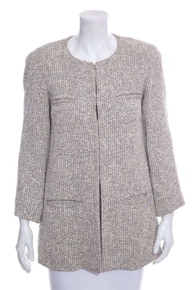Chanel Beige Tweed Jacket with 4 Pocket Detail and hook and eye closure.