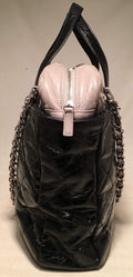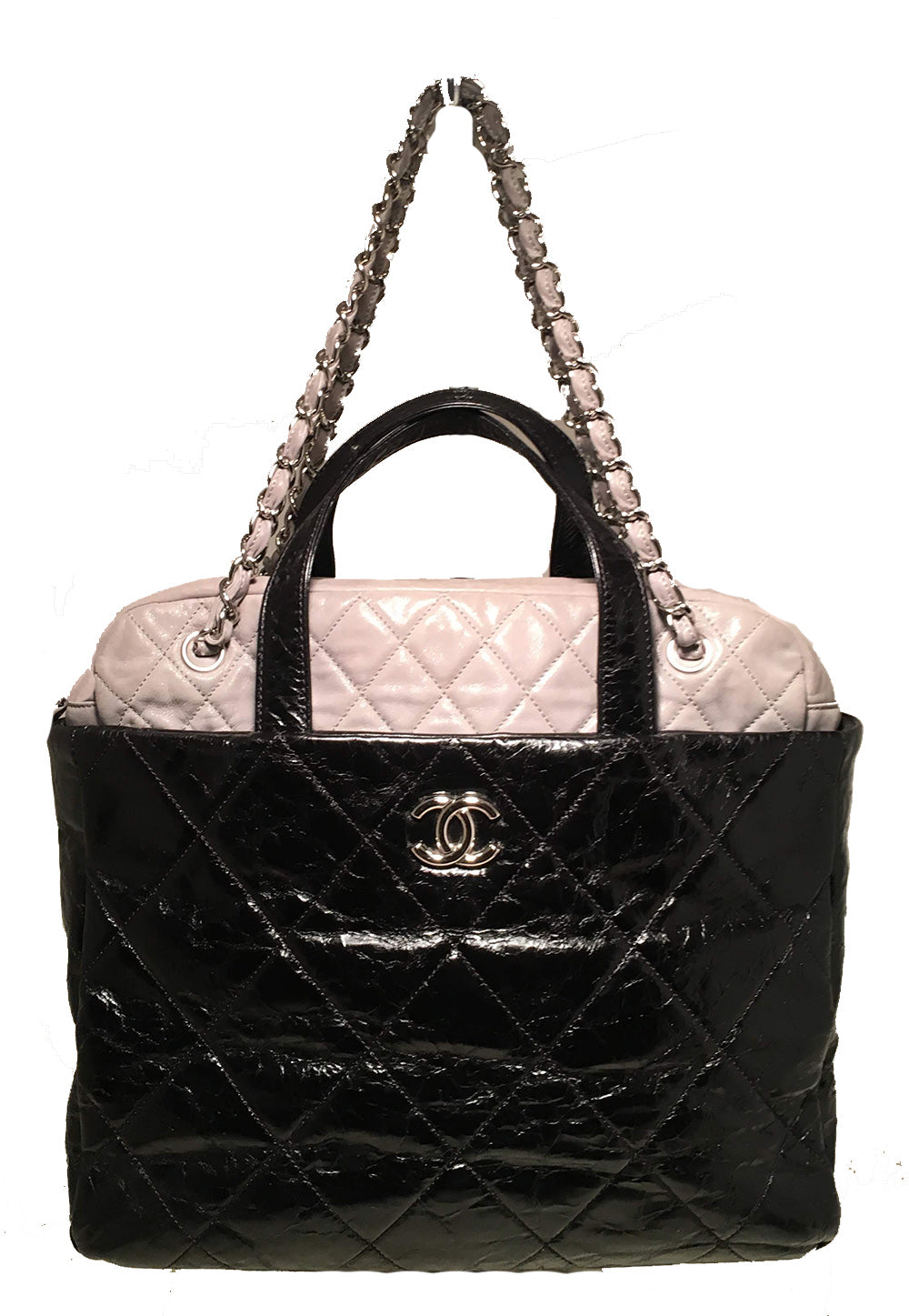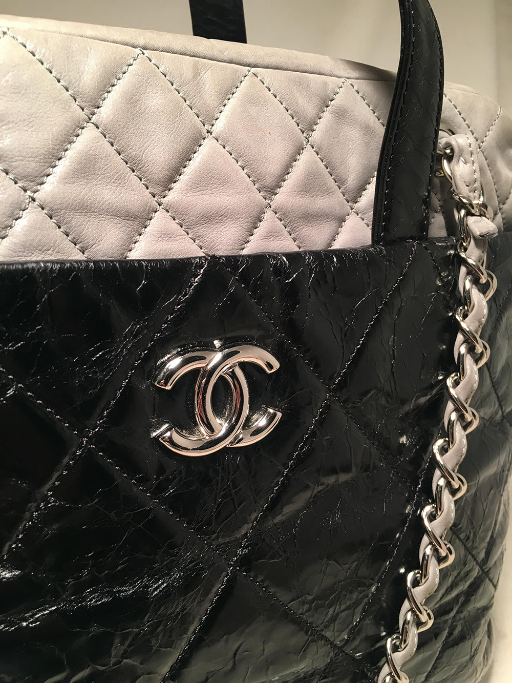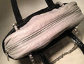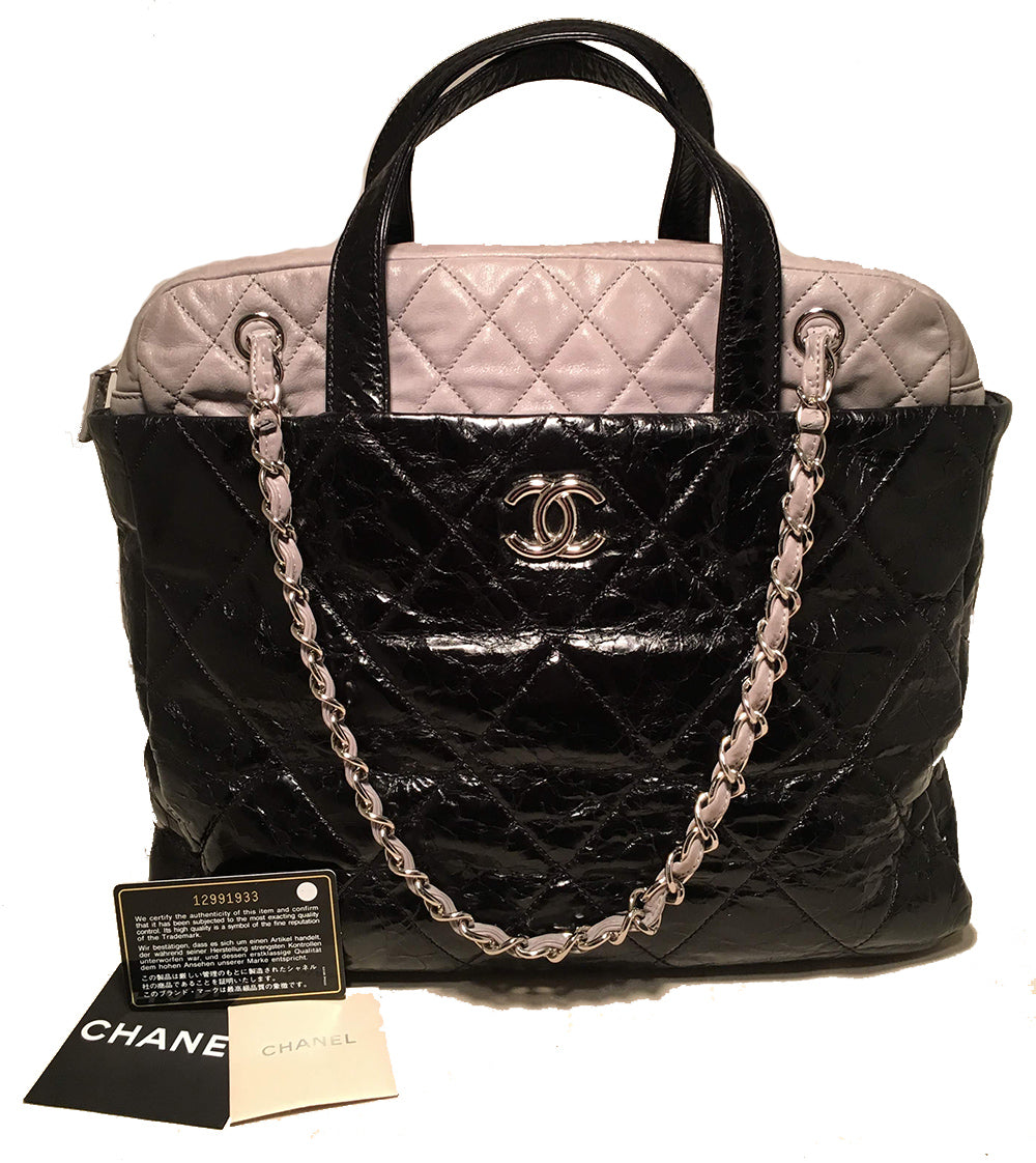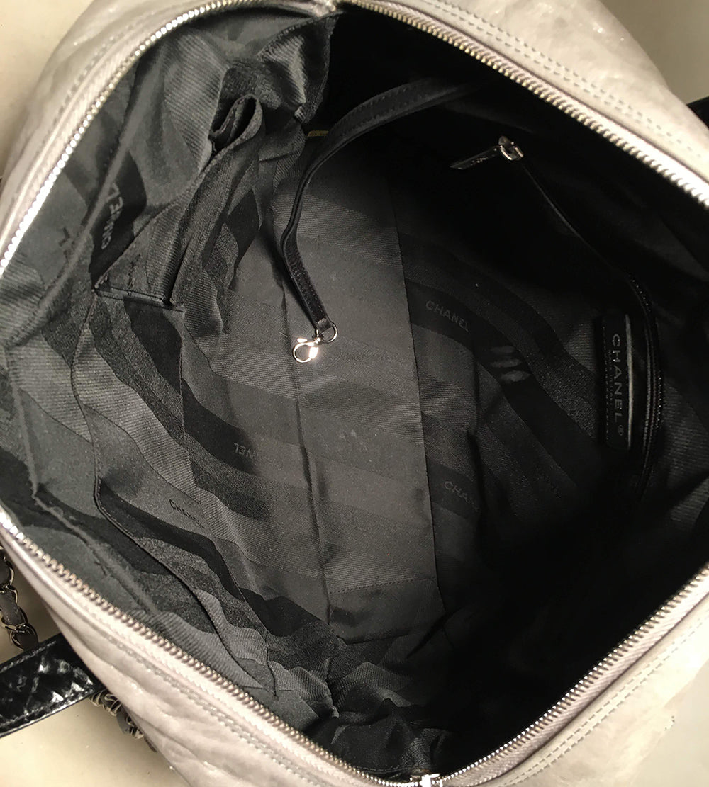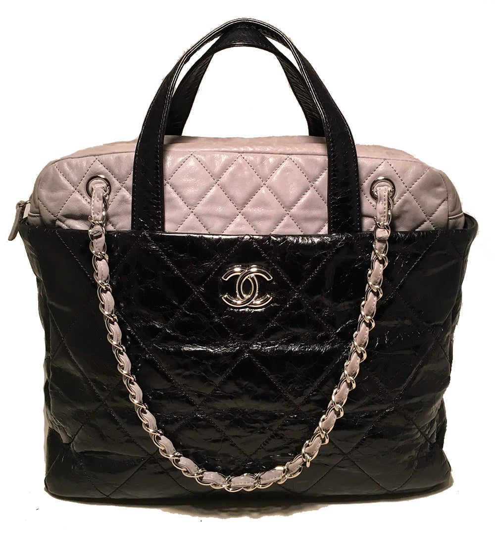 Chanel Black and Grey Leather Portobello Tote in very good condition. Distressed quilted black leather with grey shimmery soft calfskin leather top trimmed with double handles and woven chain and leather shoulder straps. Silver hardware trim and CC logo along front side. Top full zipper closure opens to a black nylon interior that holds one zipped and 2 slit side pockets, a leather key strap, and ample storage space for all your belongings. Clean corners and edges. One scuff on interior lining below zip side pocket see photos. Single season style-limited edition. Purchase includes a dust cover care booklet and ity card. Measurements: 14"x12"x4" 4" handle 9" strap