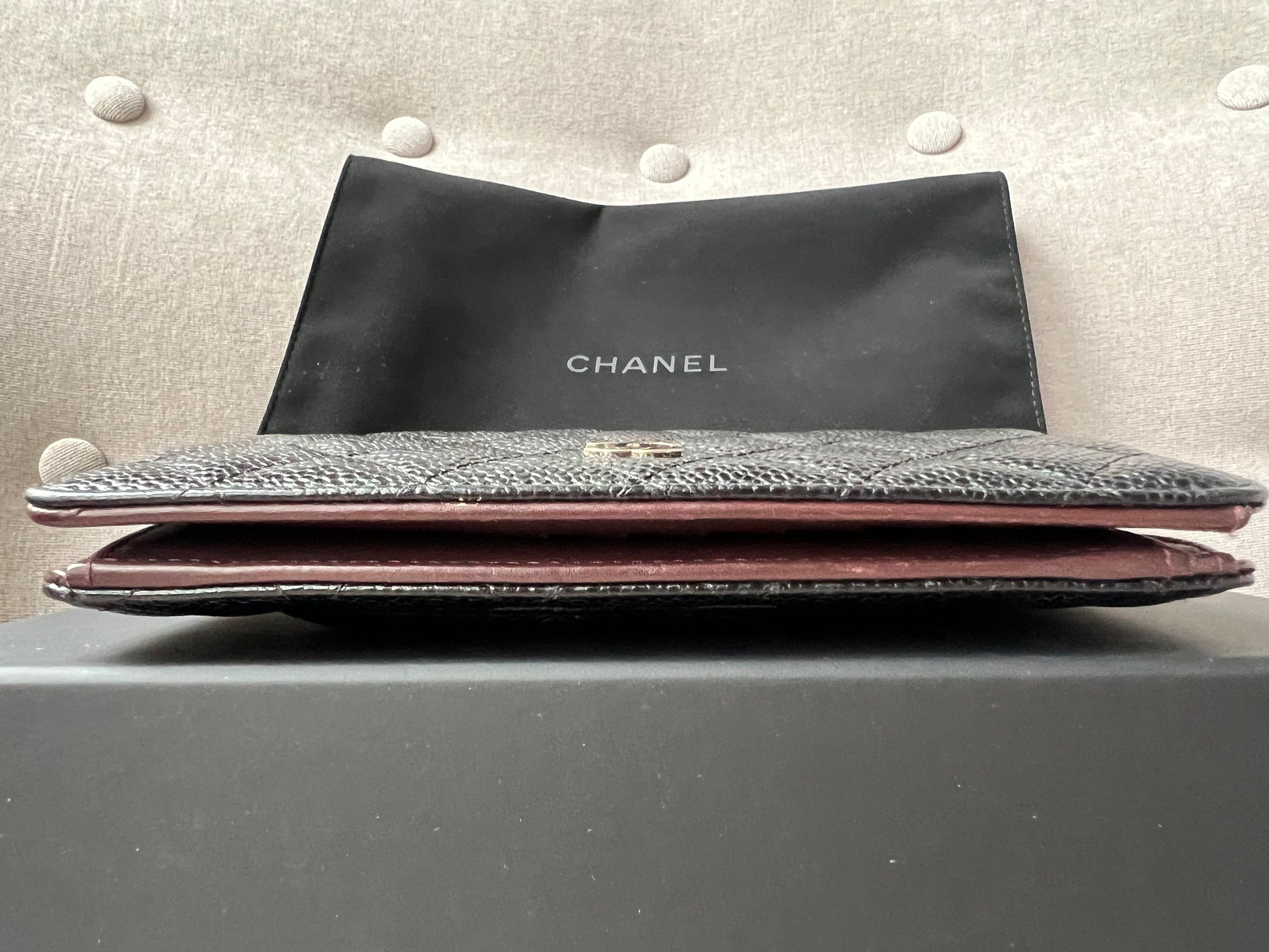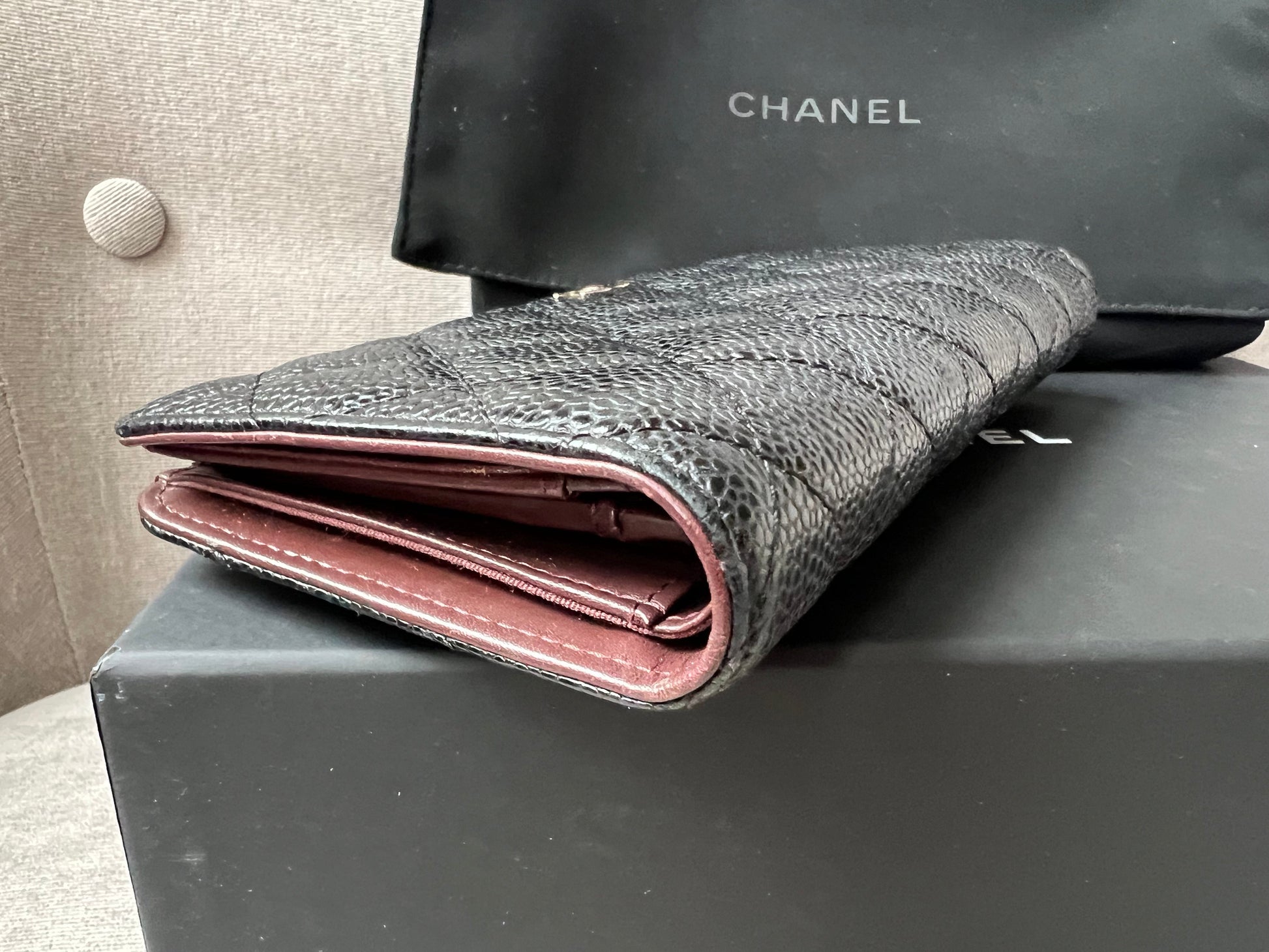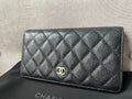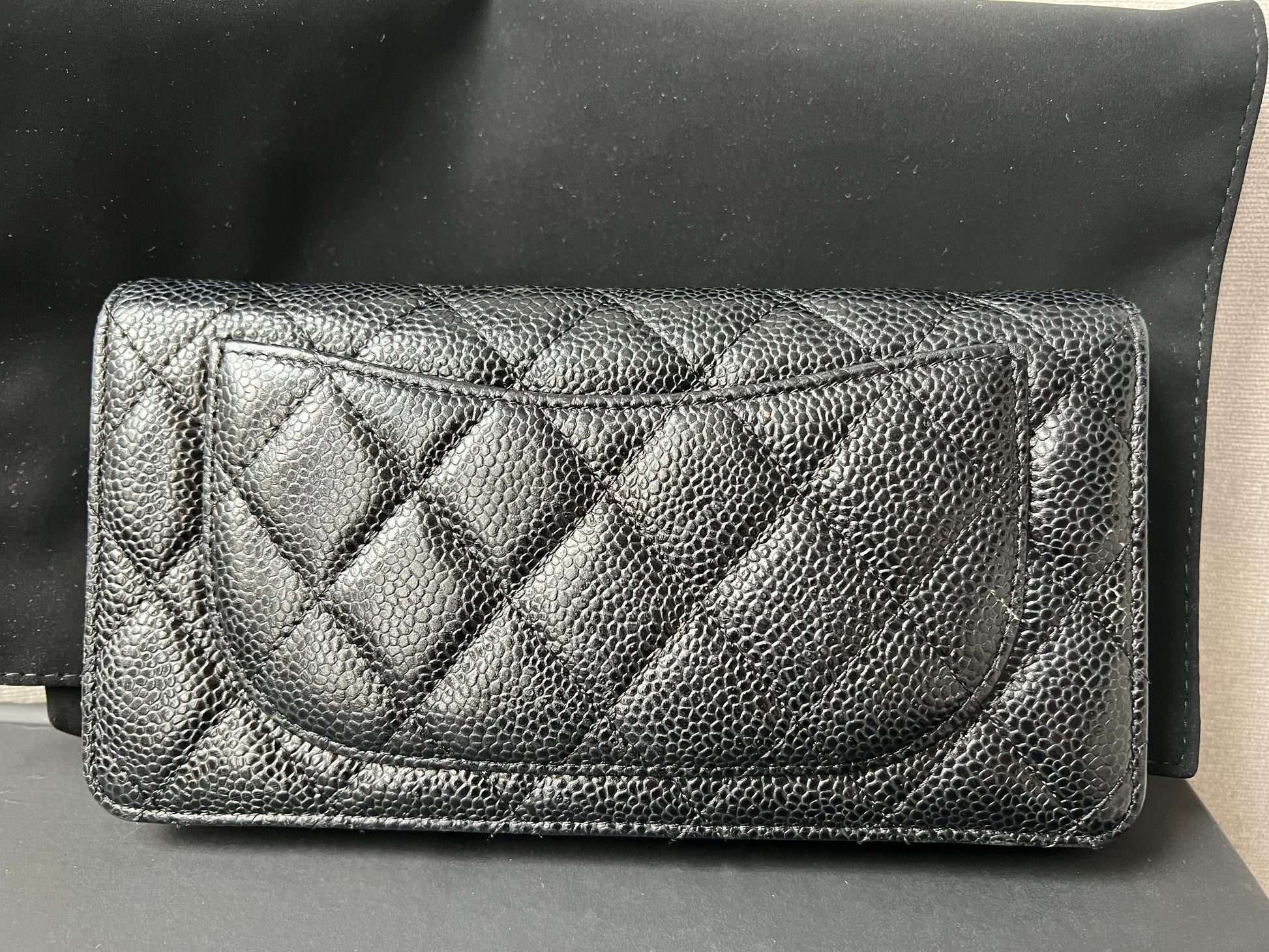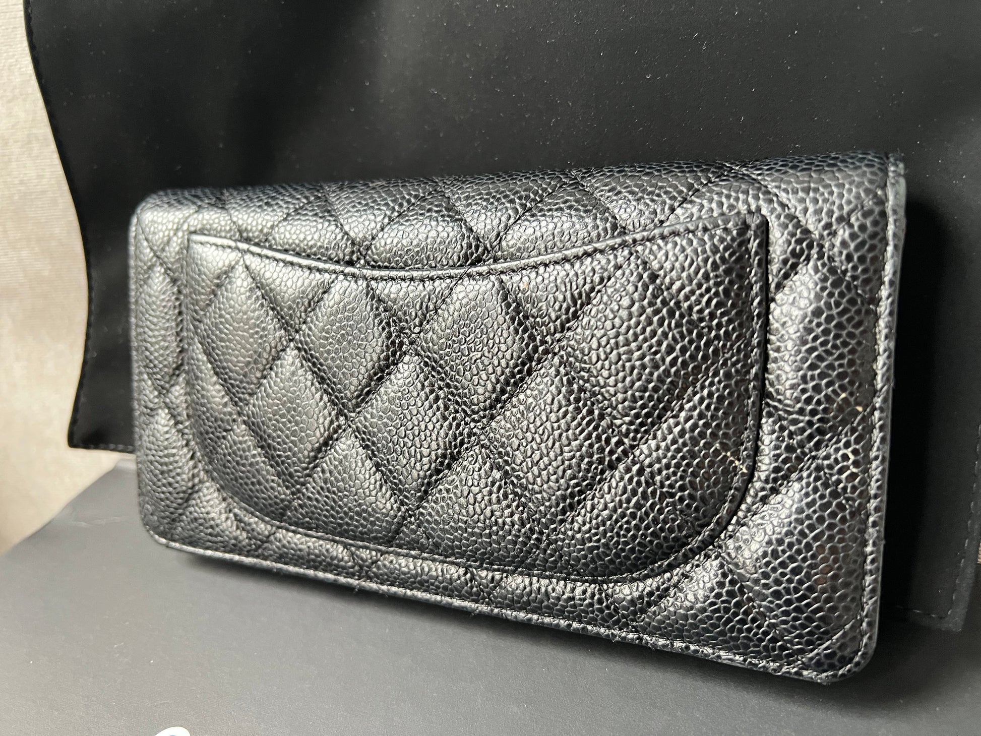 Chanel Flap Wallet in Black Caviar Leather with Silver Hardware. This long flap sized wallet is perfect for those who prefer a larger sized wallet. Flap closure with plenty room for cards, cash and bills with an inner zip pocket.