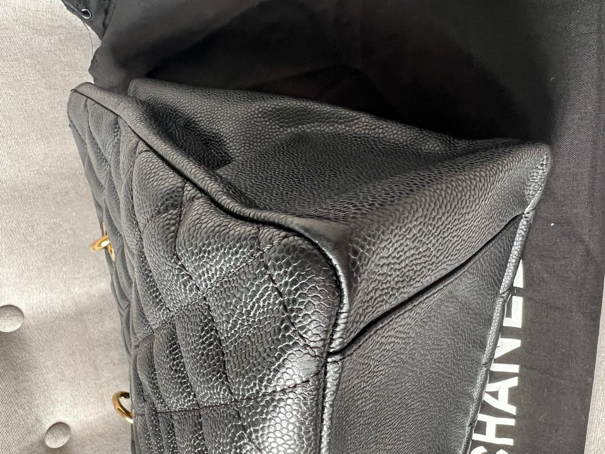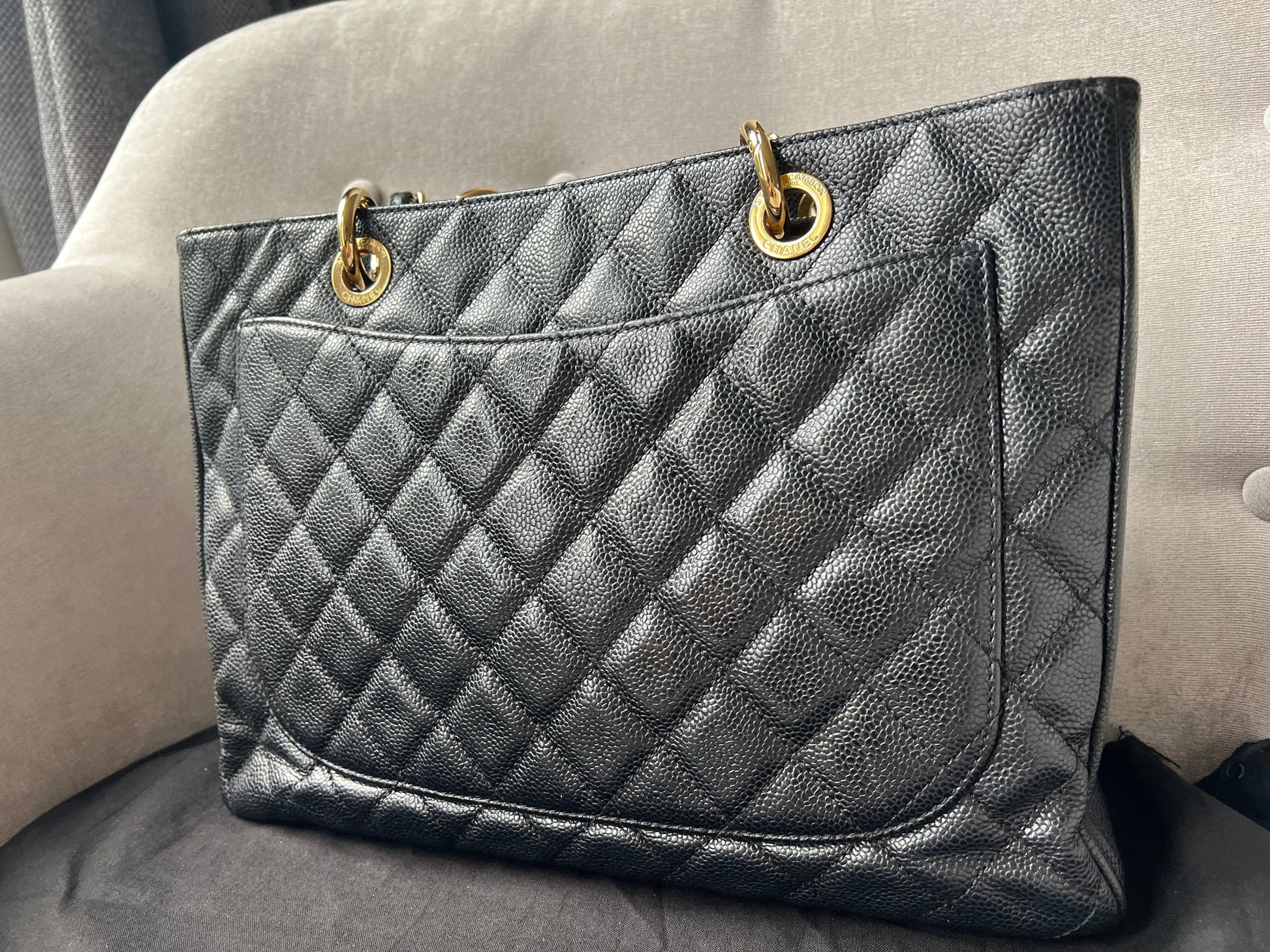 Chanel Grand Shopper Tote (GST) in Black Caviar Leather with gold hardware. This very popular chain tote is sadly now discontinued and only available to buy . Great opportunity to own a practical, iconic and sophisticated Chanel bag without the same price tag as the classic flap styles. Perfect for day or evening use and the caviar leather is very resilient and durable. Can be carried in the crook of the arm or over shoulder using the chain straps.