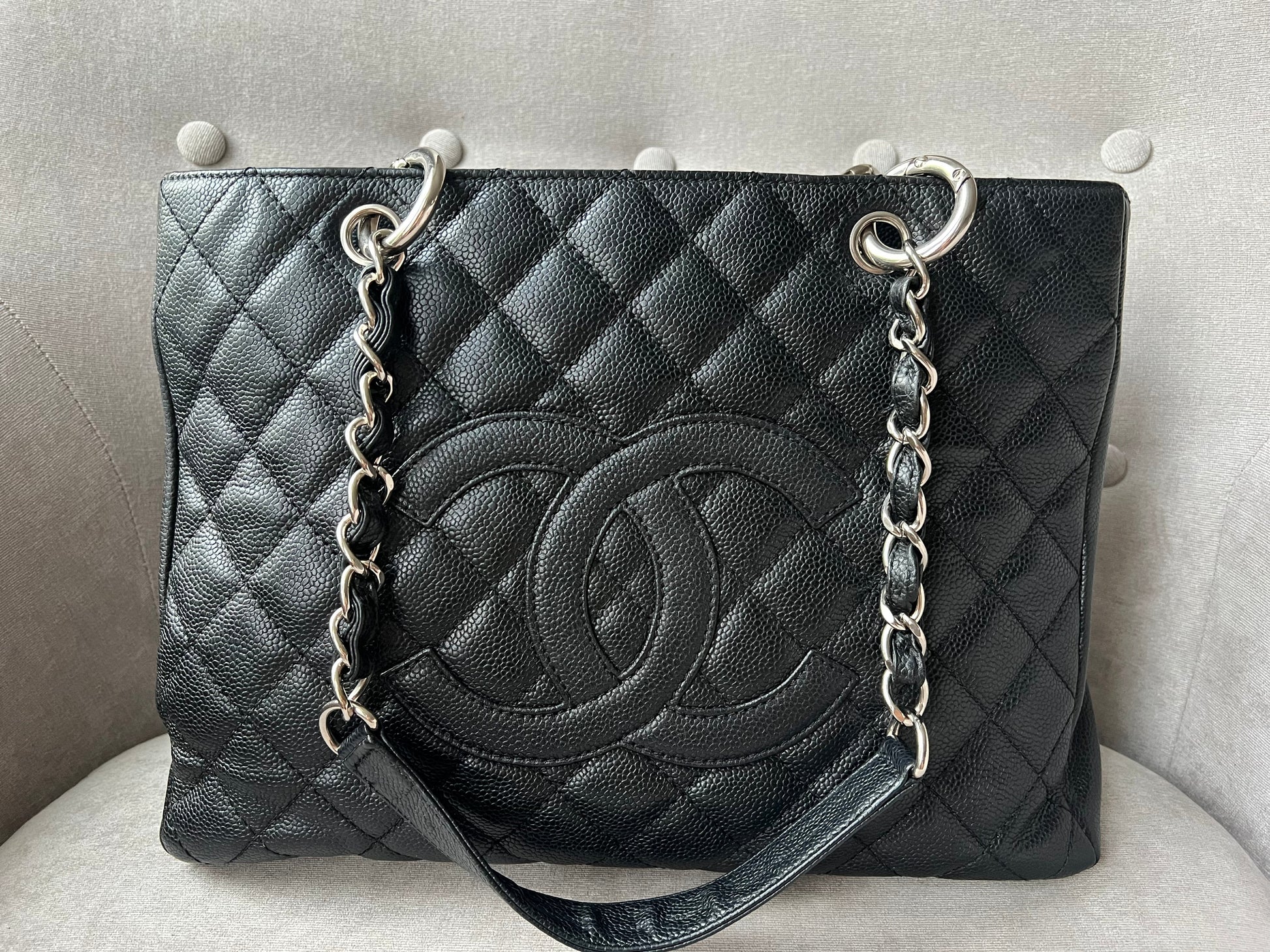 Chanel Grand Shopper Tote (GST) in Black Caviar Leather with silver hardware. This very popular chain tote is sadly now discontinued and only available to buy . Great opportunity to own a practical, iconic and sophisticated Chanel bag without the same price tag as the classic flap styles. Perfect for day or evening use and the caviar leather is very resilient and durable. Can be carried in the crook of the arm or over shoulder using the chain straps.
