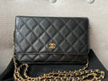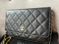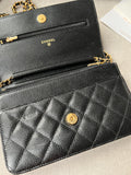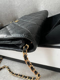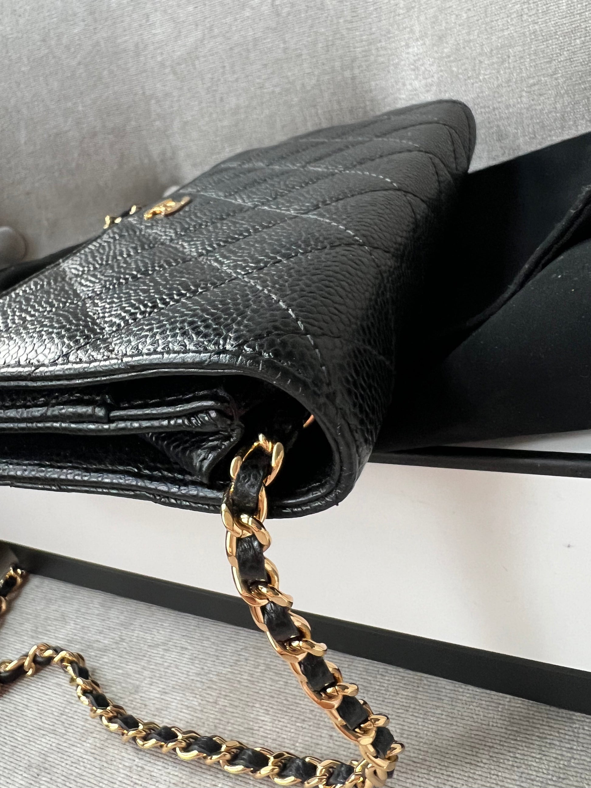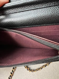 Chanel Wallet on Chain in Black Caviar Leather with Gold Hardware. The ultimate evening style, the classic Chanel WOC is timeless and features the CC hardware detailing on the front flap. The caviar leather is robust and resilient meaning you won't have to baby this piece. Perfect for evening wear or night out to carry the essentials. Can be carried as a handheld clutch with the chain tucked inside, or over shoulder or cross body. The classic WOC is highly sought after and now sells at premium prices due to difficulty of purchasing direct from Chanel.