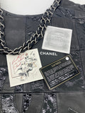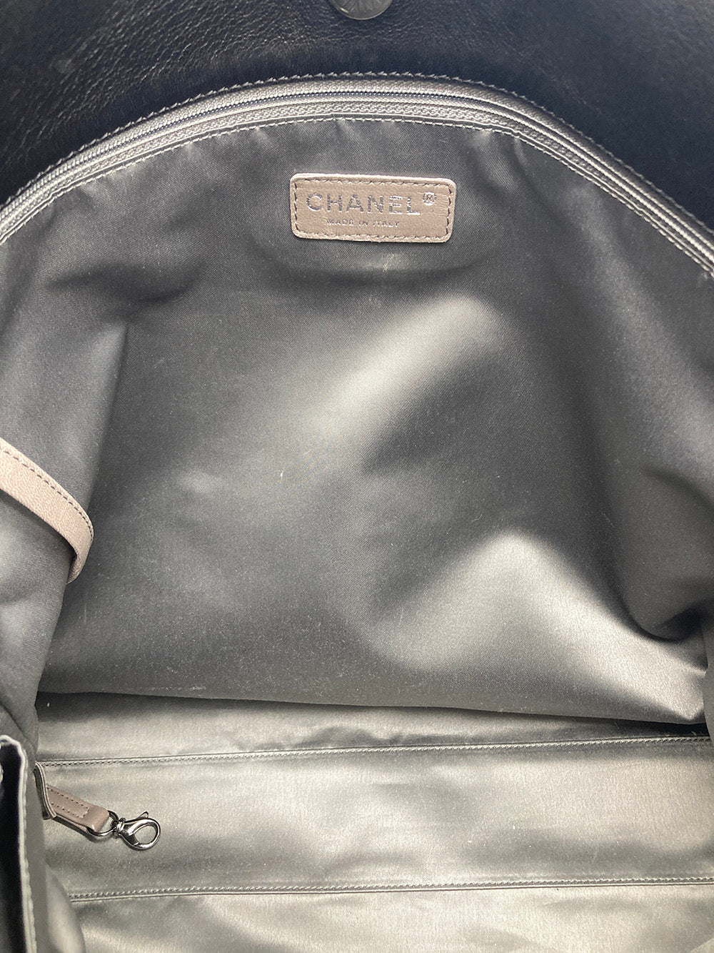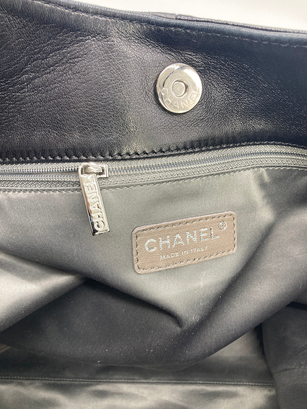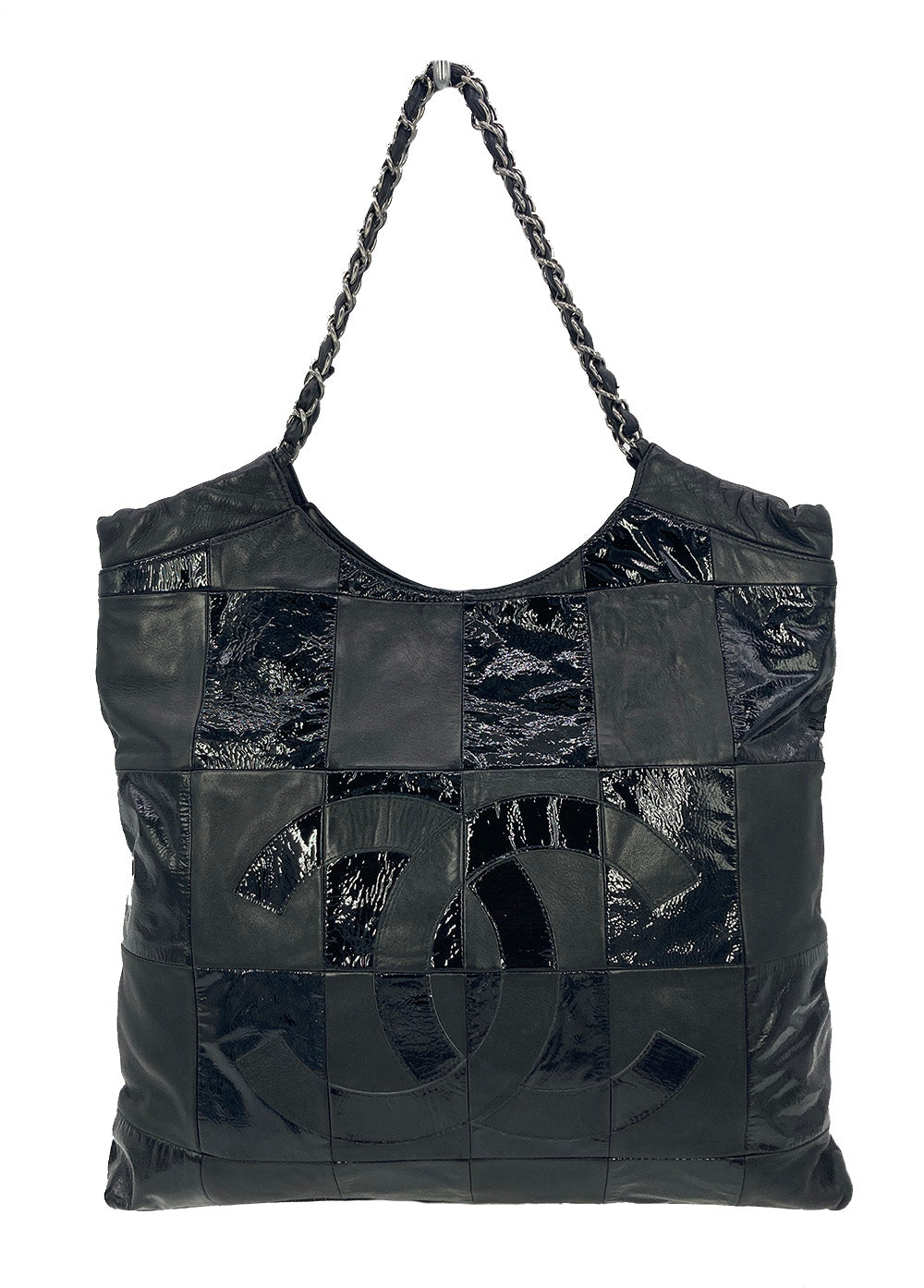 Chanel Black Leather Checkered Tote in very good condition. Black lambskin and patent leather checkered exterior with CC logo along front side and double woven chain and leather shoulder straps. Top magnetic closure opens to a gray satin lined interior with attached leather key strap holder, one zip and 2 slit side pockets. Overall very good condition. clean corners edges and exterior. Small spots on interior lining see photos. purchase includes care booklets and ity card. measurements: 17"x14.5"x4" 10" strap drop