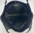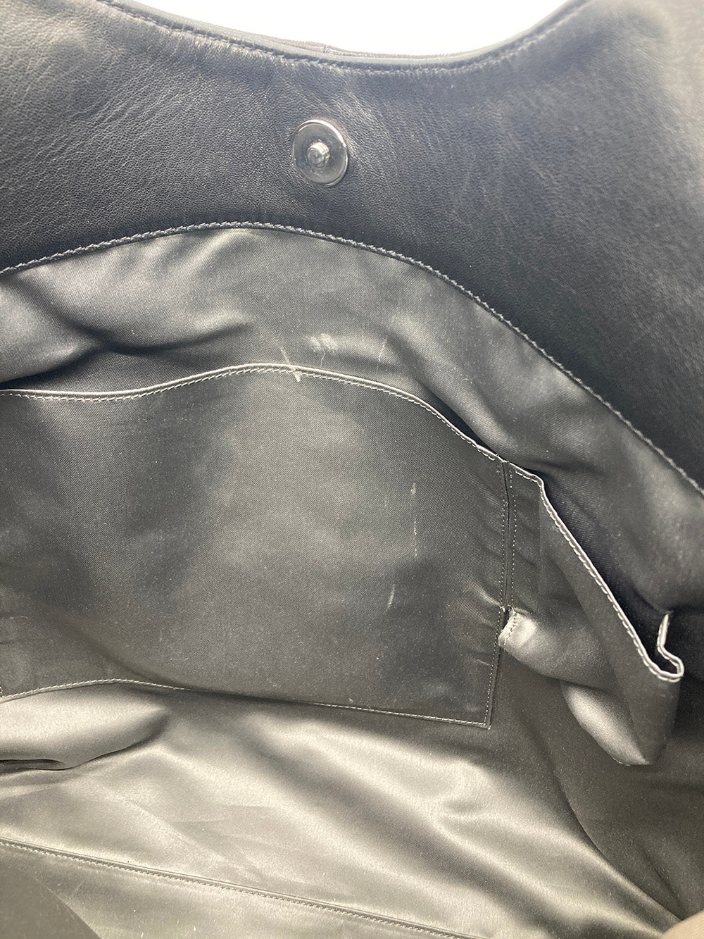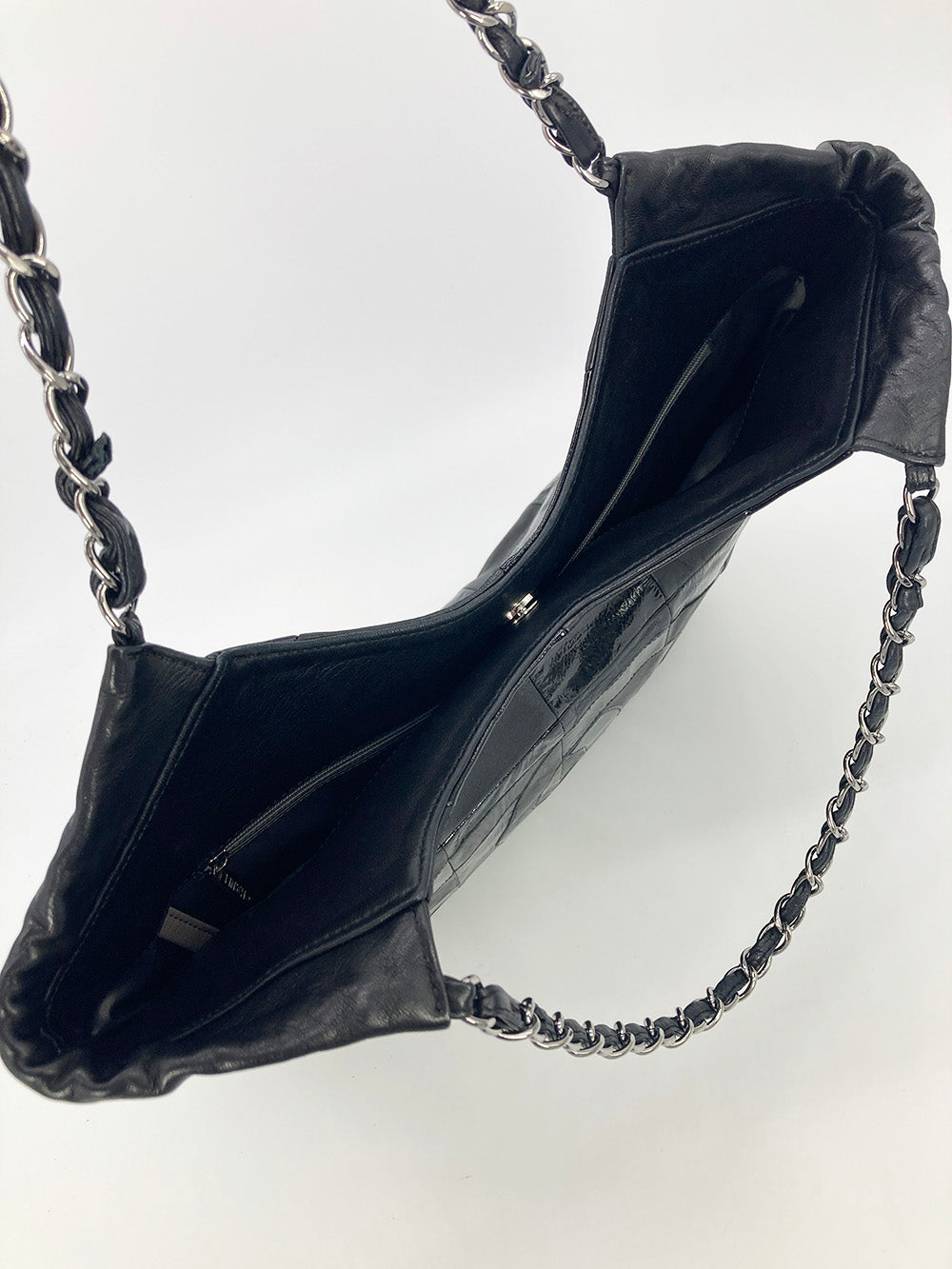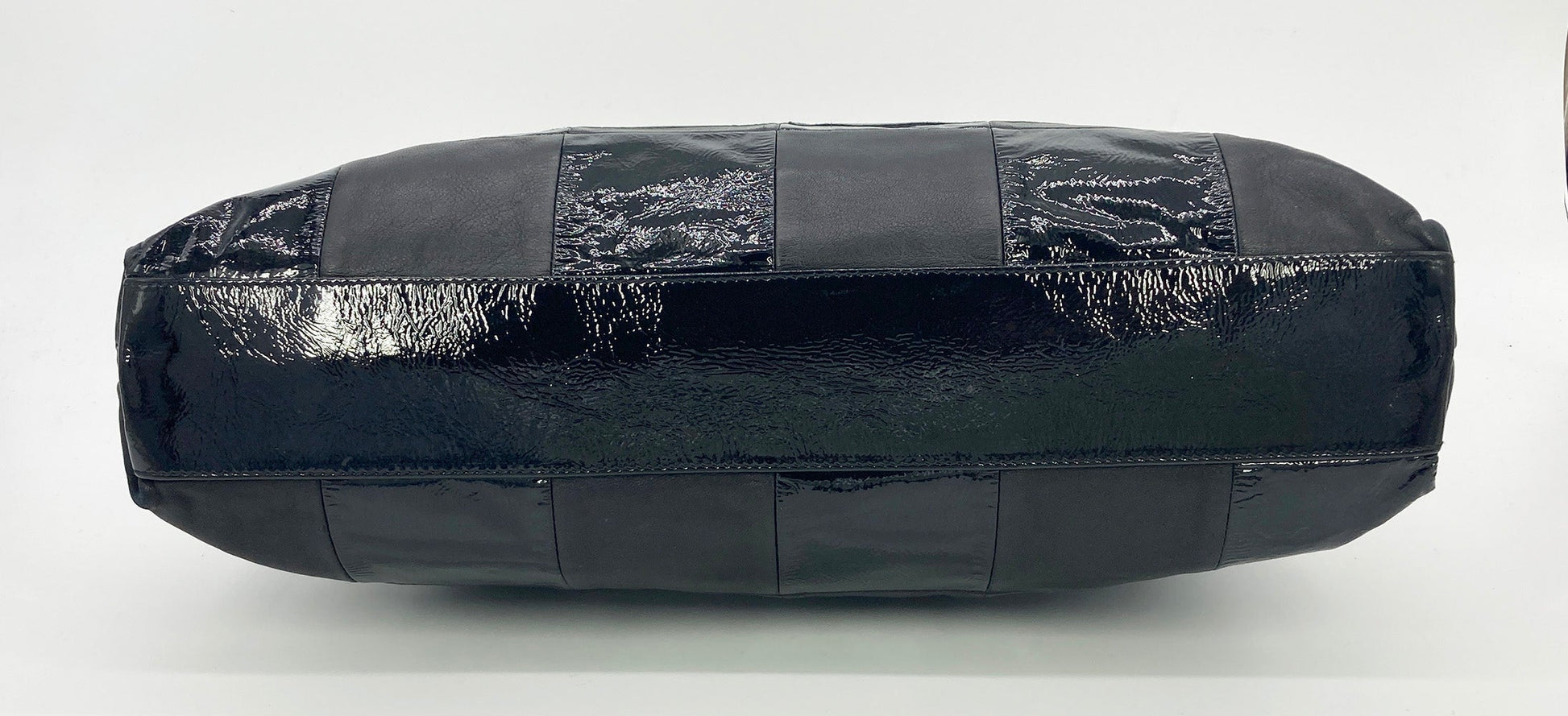 Chanel Black Leather Checkered Tote in very good condition. Black lambskin and patent leather checkered exterior with CC logo along front side and double woven chain and leather shoulder straps. Top magnetic closure opens to a gray satin lined interior with attached leather key strap holder, one zip and 2 slit side pockets. Overall very good condition. clean corners edges and exterior. Small spots on interior lining see photos. purchase includes care booklets and ity card. measurements: 17"x14.5"x4" 10" strap drop