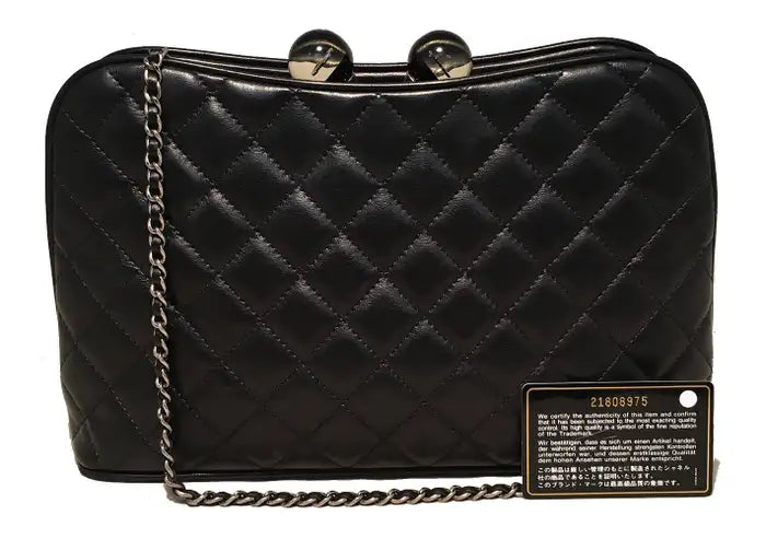 Chanel Black Leather Crystal Ball Kisslock Clutch in excellent condition. Black square quilted lambskin leather exterior trimmed with antiqued silver hardware and a unique crystal ball top kisslock closure. The kisslock crystal balls are made of clear resin with antiqued silver CC logo inlay. 2 exterior side slit pockets. Interior lined in black nylon with one side slit pocket and attached chain and leather woven shoulder strap. No stains, smells or scuffs. Clean corners edges and interior. Can be as a clutch or shoulder bag to suit many styles and occasions. Purchase includes a dust cover and ity card. Measurements: 12"x7.25"x3" 16" strap drop.