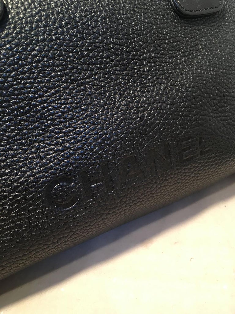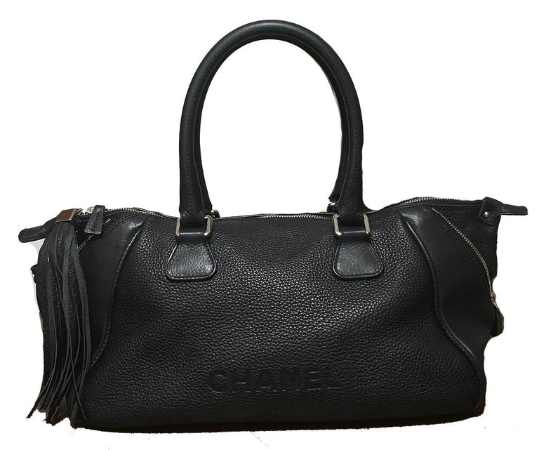 Chanel Black Leather Zip and Tassel Pull Tote Bag in excellent condition. Black grained leather exterior trimmed with silver hardware and fabulous leather fringe tassel top zipper pull. Front exterior side embossed with Chanel. Top zipper closure opens to a black nylon lining that holds ample storage space and one side zipped pocket. 2 Exterior side zippers converts the shape of this piece to suit your style and preference. Clean corners and edges. Light signs of wear on interior consistent with age and gentle use. Purchase includes a dust cover. Measurements: 19"x9"x7" 7.5" handle drop