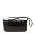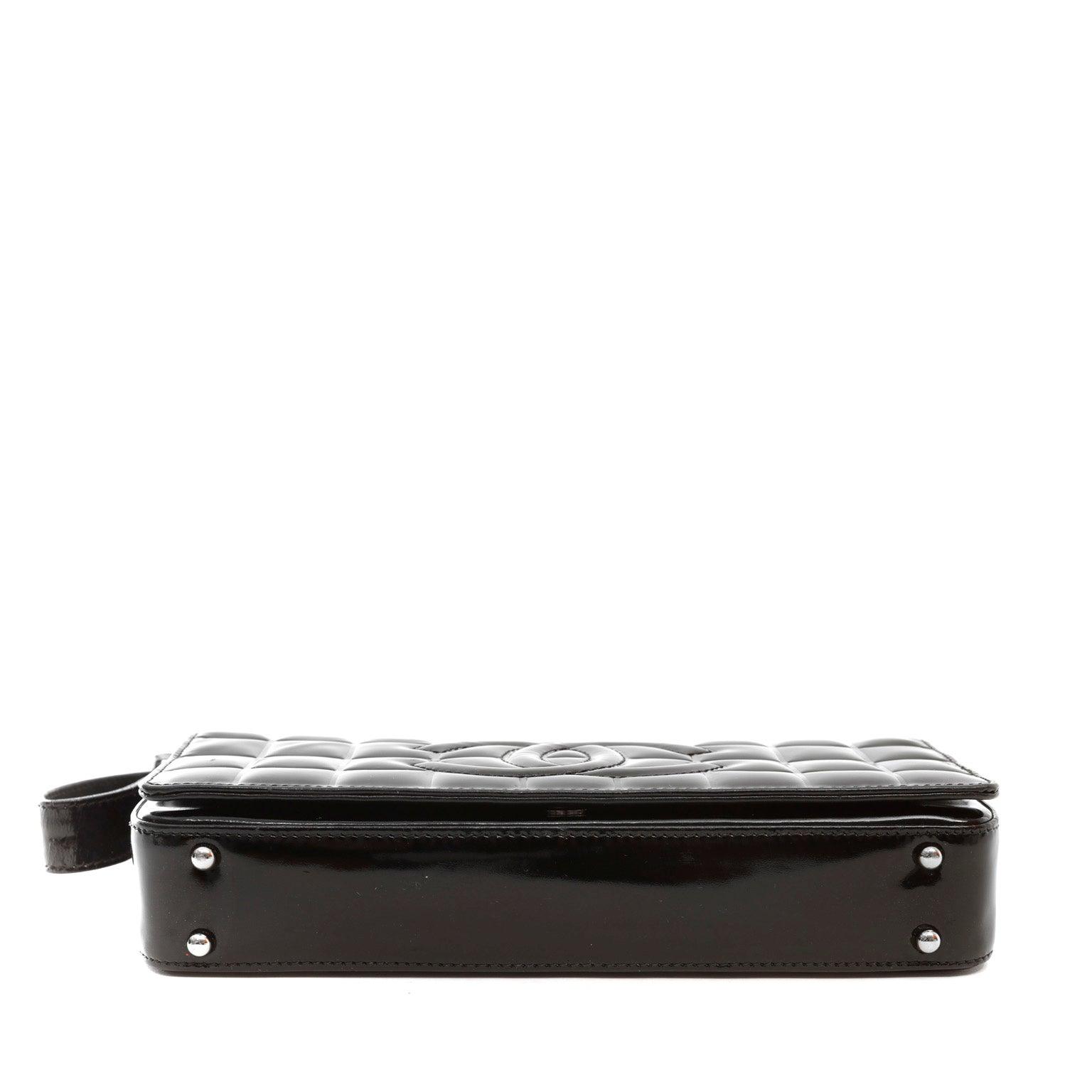 This Chanel Black Patent Leather Chocolate Bar Quilted CC Shoulder Bag is in mint condition. Weather friendly black patent leather is quilted in square chocolate bar pattern. Large tonal interlocking CC is stitched on the front flap. Adjustable shoulder strap.
