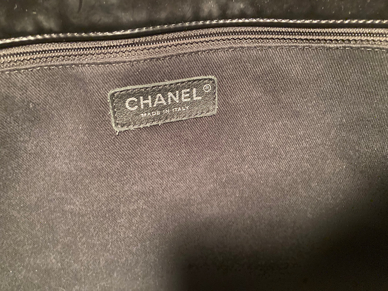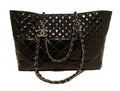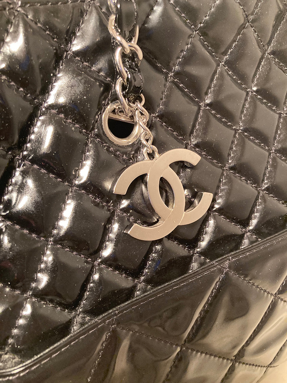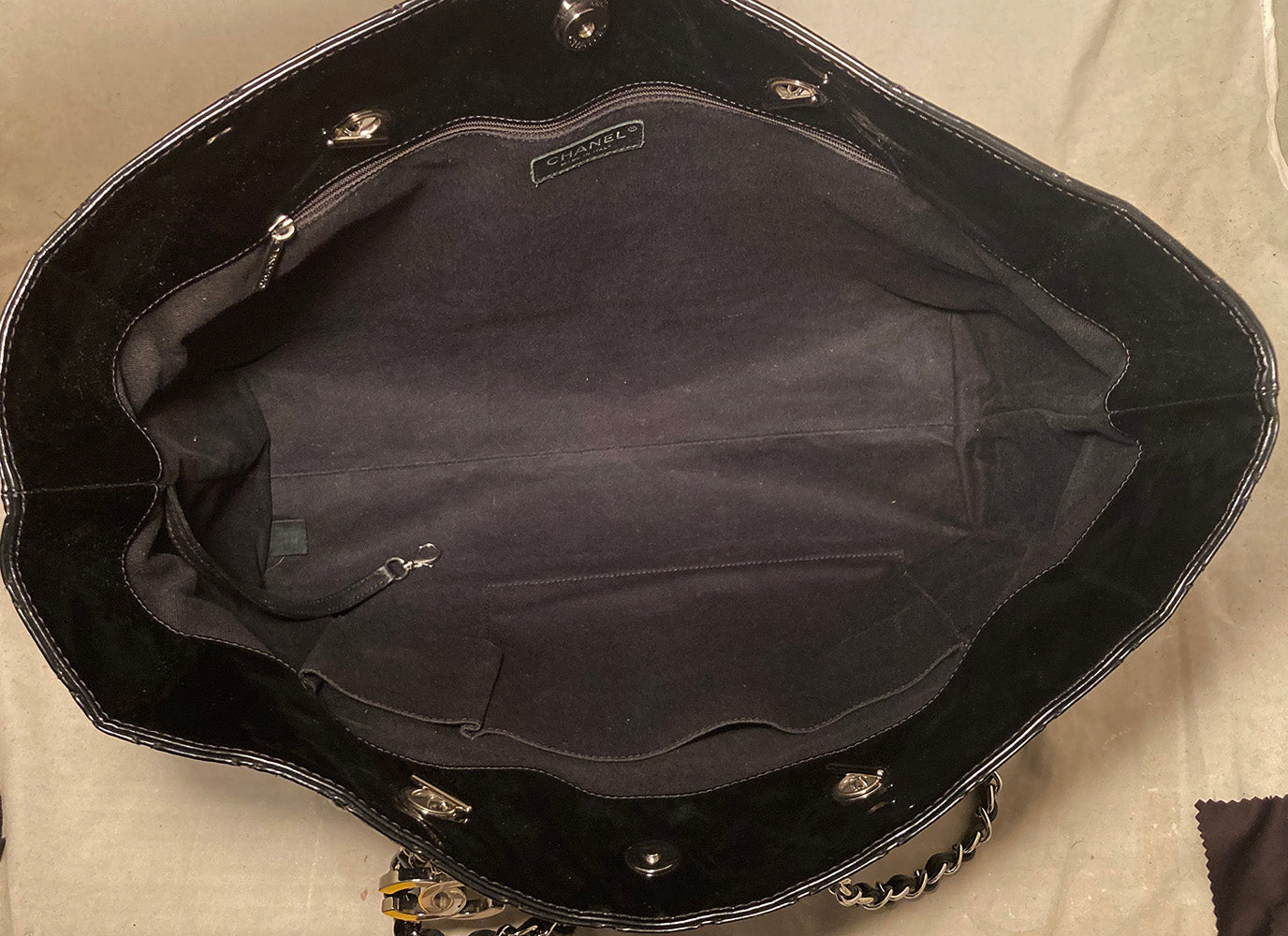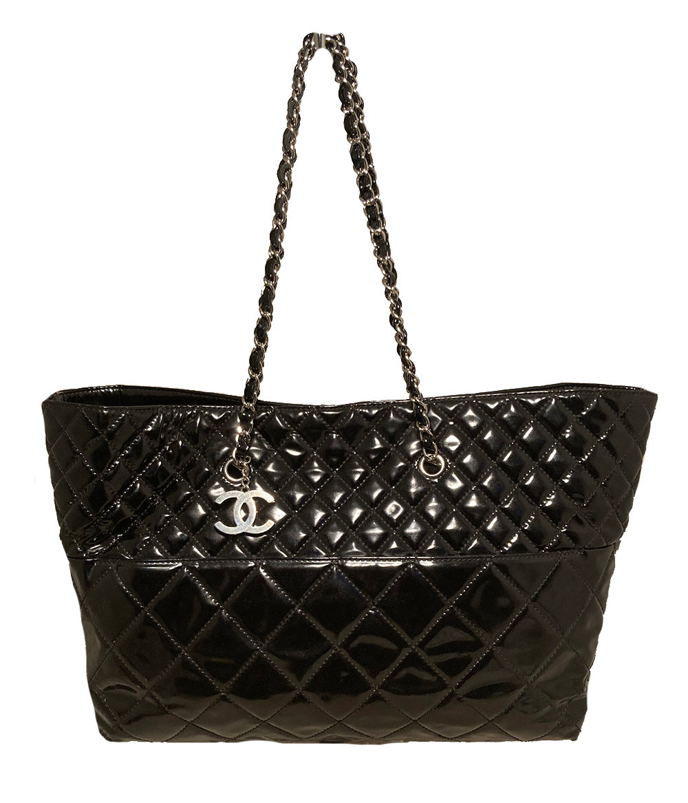Chanel Black Patent In the Business Tote in excellent condition. Black patent vinyl exterior in 2 diamond quilted patterns. Silver woven chain and patent shoulder straps. Silver CC logo charm attached at strap end. Top magnetic closure opens to a black canvas interior with ample storage space, one zip and 2 slit side pockets and an attached leather key fob to help keep things organized. No stains smells or scuffs. Clean corners edges and interior. Purchase includes a dust cover. Measurements: 17x12x6" 10.5" drop