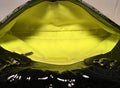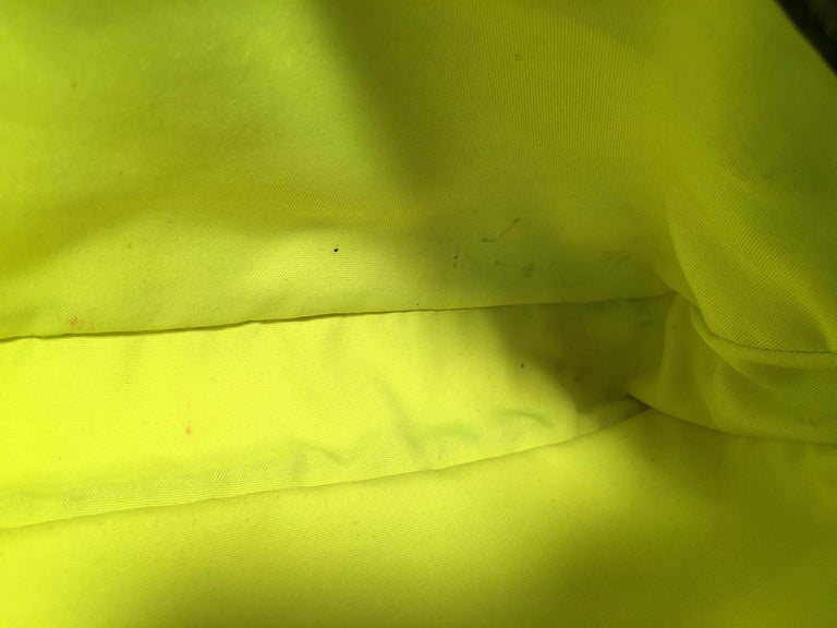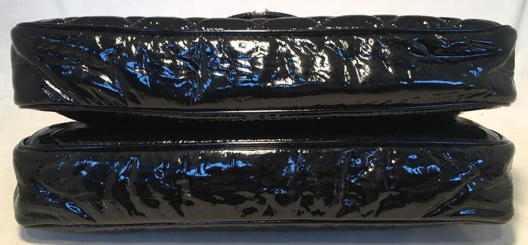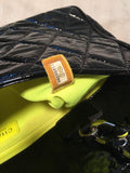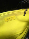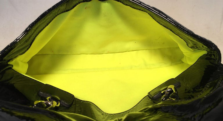 Chanel Black Patent Leather 2 way Classic Flap Shoulder Bag in very good condition. Black quilted patent leather exterior trimmed with silver hardware. 2 separate compartments each with their own top flap closure. Front compartment features signature CC twisting logo closure. Both compartments are lined in neon yellow nylon. Front compartment holds one side zipped pocket and hologram. Clean corners and edges. Light wear inside consistent with age and gentle use, see photos for details. Delicate spots and makeup marks throughout interiors. Unique design no longer made or available in stores. Purchase includes a dust cover. Measurements: 12.5"x8"x5" 8.5" strap drop