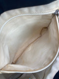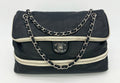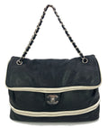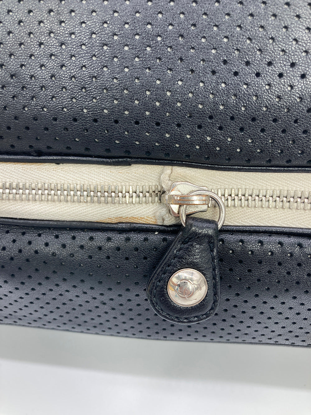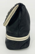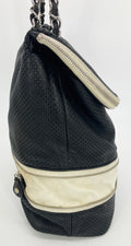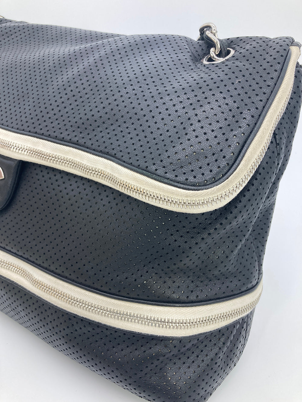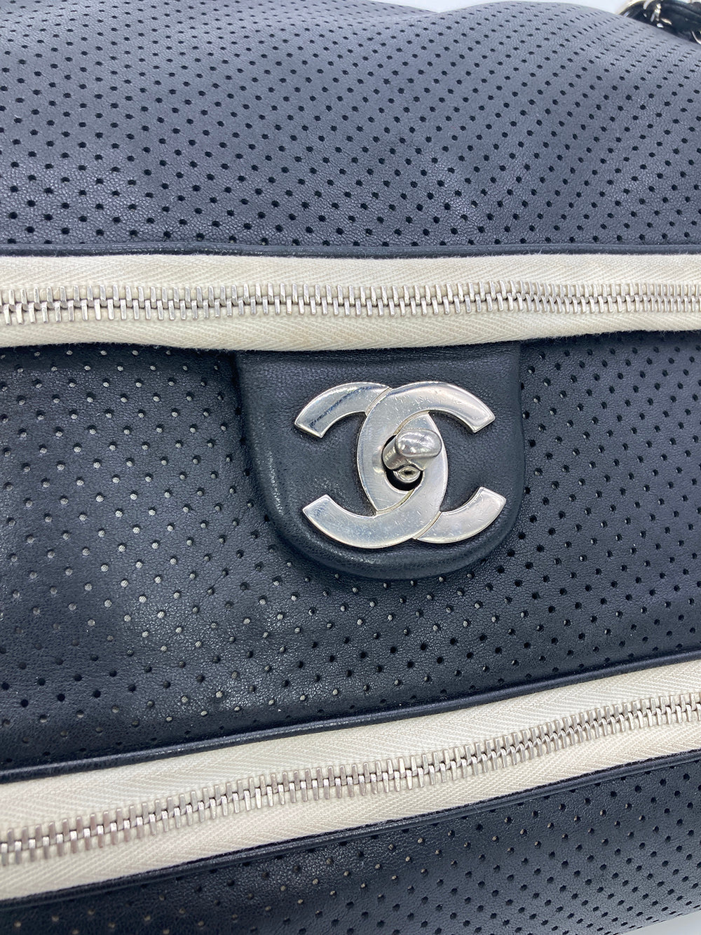 Chanel Black Perforated Leather Expandable Classic Flap Shoulder Bag in fair condition. Black perforated leather trimmed with cream canvas and silver hardware. Unique expandable zipper feature opens the body about 2 inches around with a full zipper surrounding. Twist CC lock closure opens via top flap to a cream canvas lined interior with one zipped and 2 side slit pockets. Overall fair condition. clean corners and edges. stains and discolorations around zipper trim, canvas expandable portion and interior lining. see photos for details. purchase includes a dust cover. measurements: 14"x11-13"x4.5" 7.5-13" strap drop