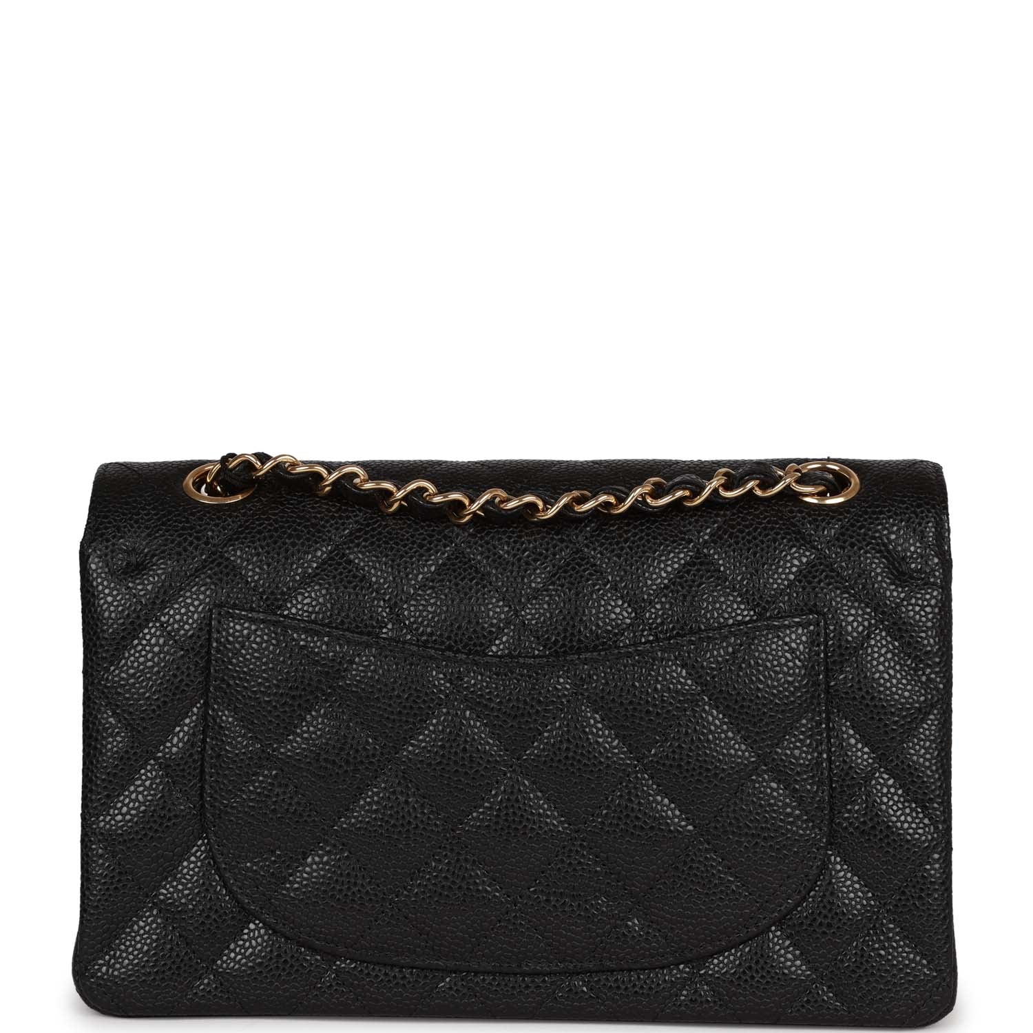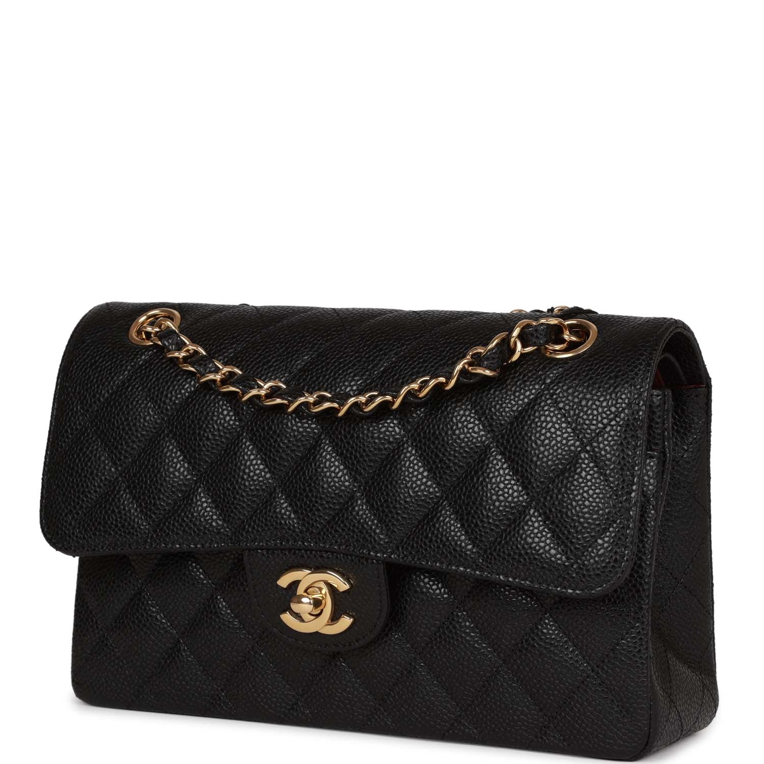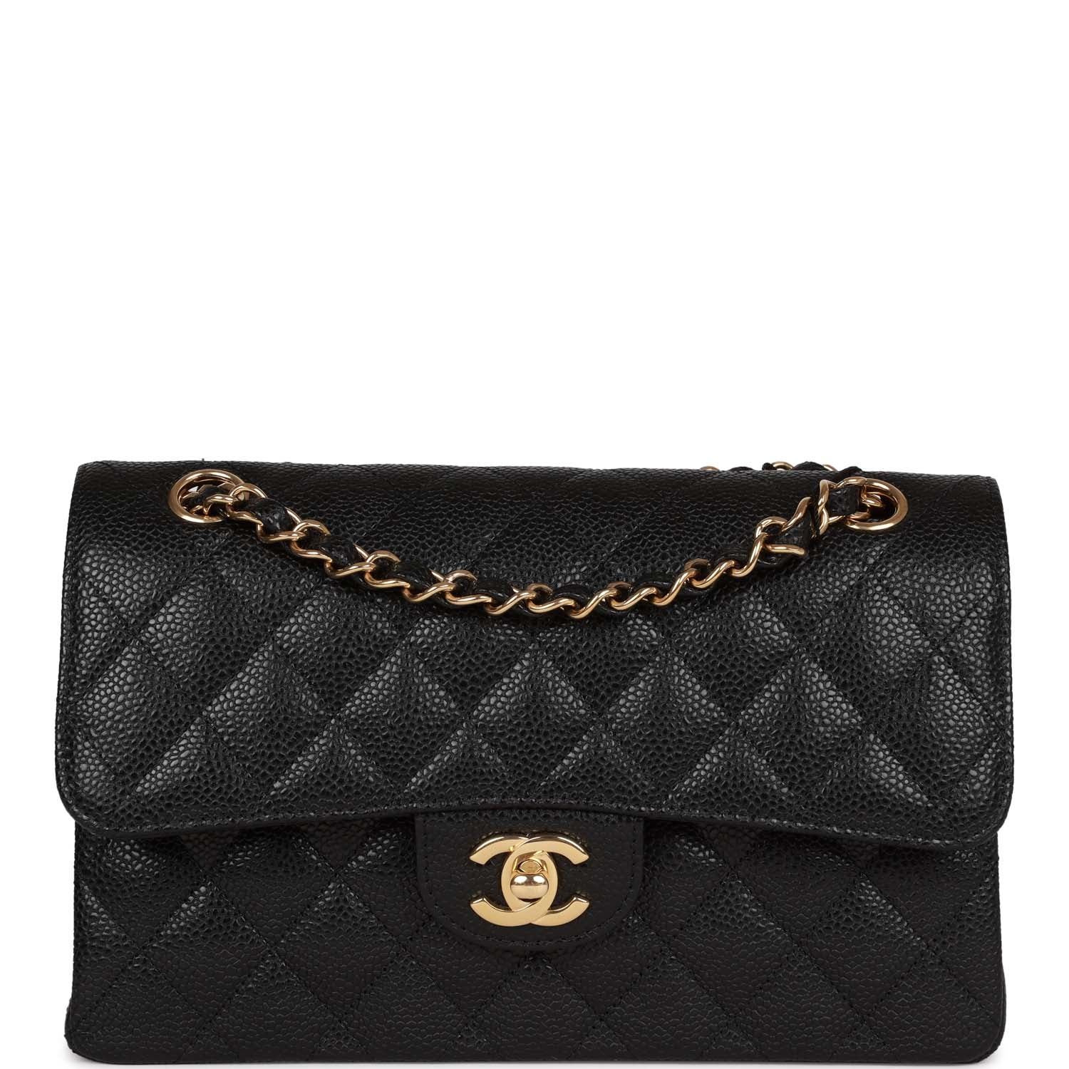 This Small Classic Double Flap bag is in black caviar leather with gold tone hardware and features a front flap with signature CC turnlock closure, half moon back pocket, and adjustable interwoven gold tone chain link and black leather shoulder strap