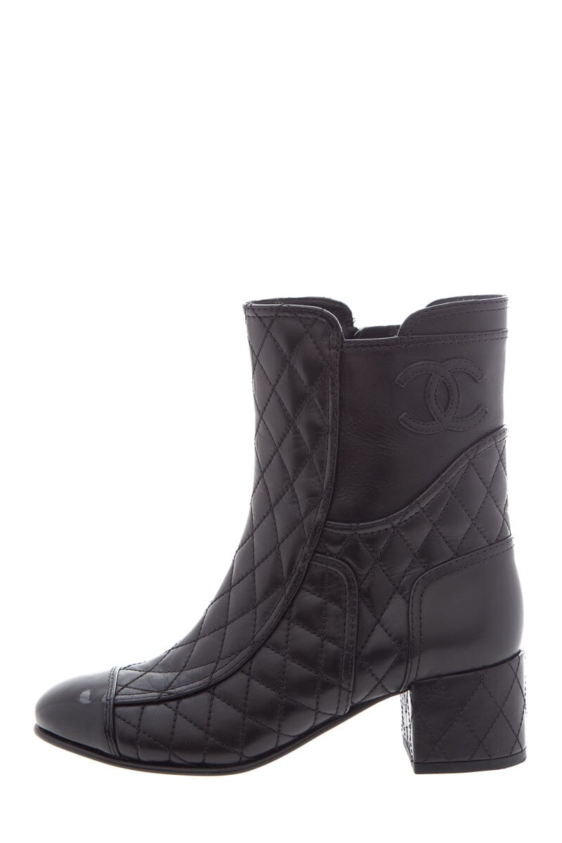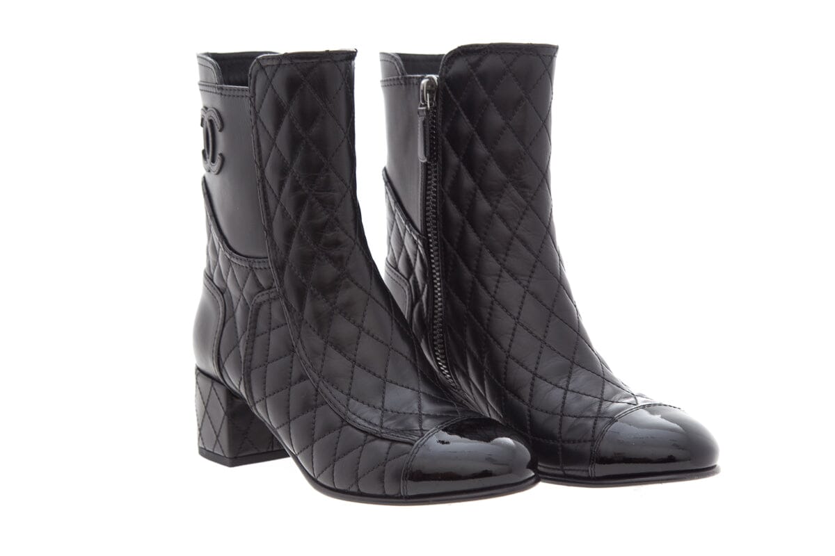 38 Chanel Black Quilted Leather Boot with Patent Leather Toe CC Logo on Side. This item is in very good condition; slight wear on bottoms.