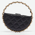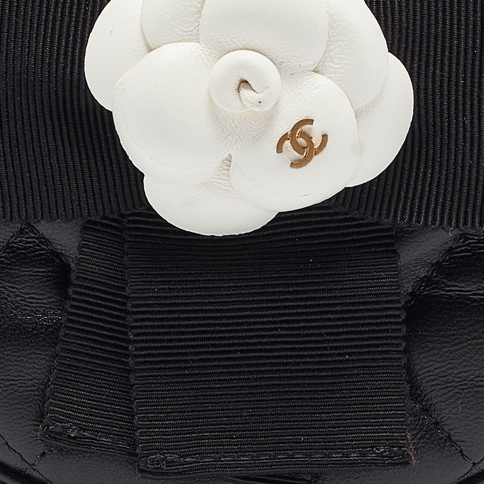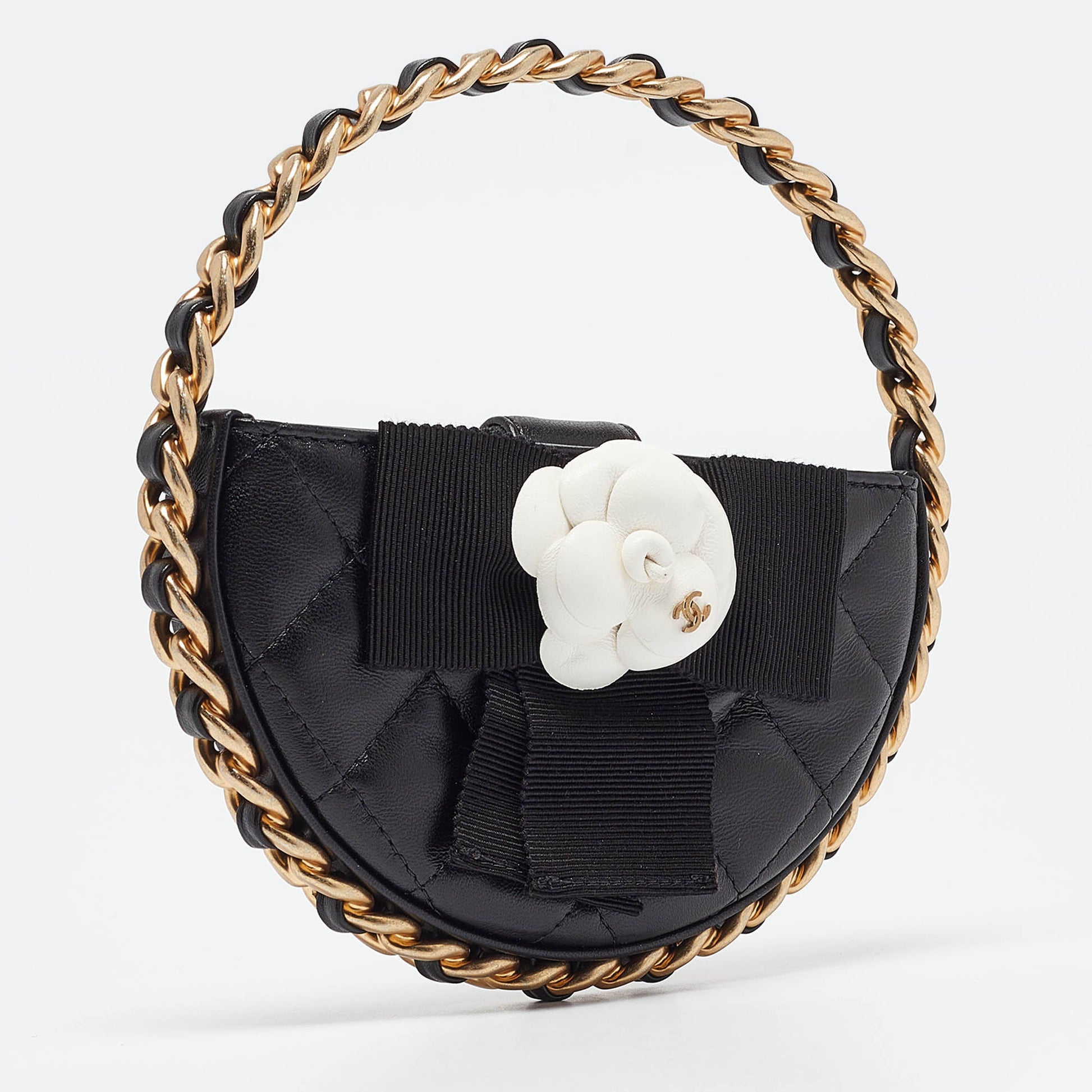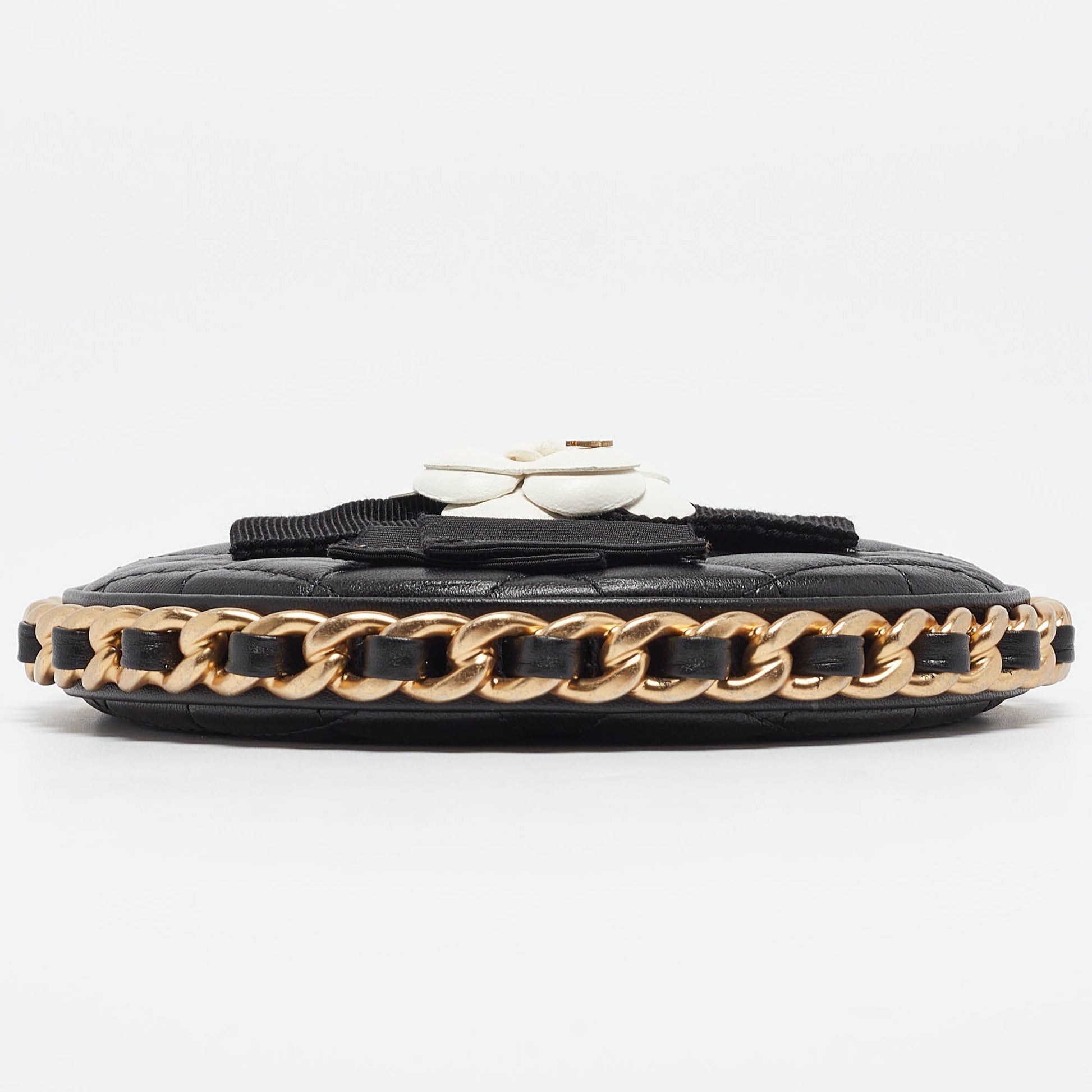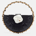CHANEL Black Quilted Leather Mini Round Camellia Clutch