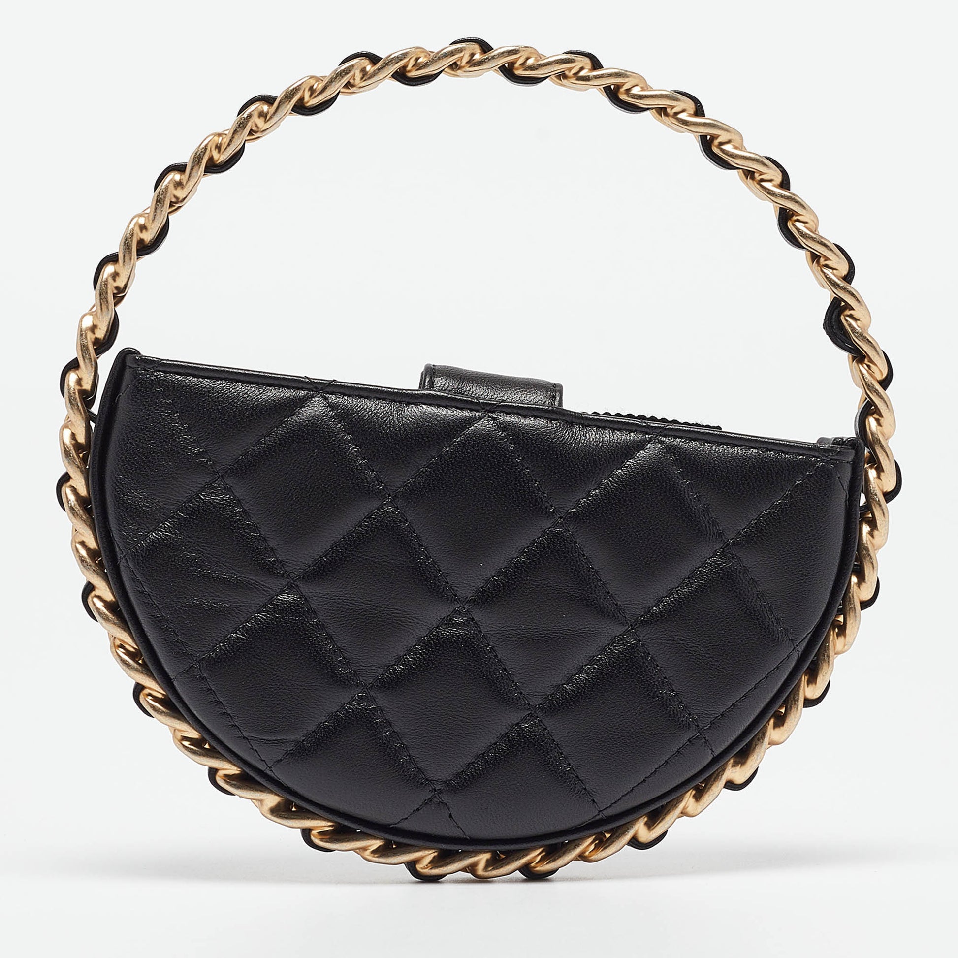 The Chanel clutch is a stunning accessory crafted from luxurious quilted leather. Its compact, round design features the iconic Camellia motif, offering a chic blend of classic style and modern flair. Ideal for any occasion, this clutch exudes timeless beauty.