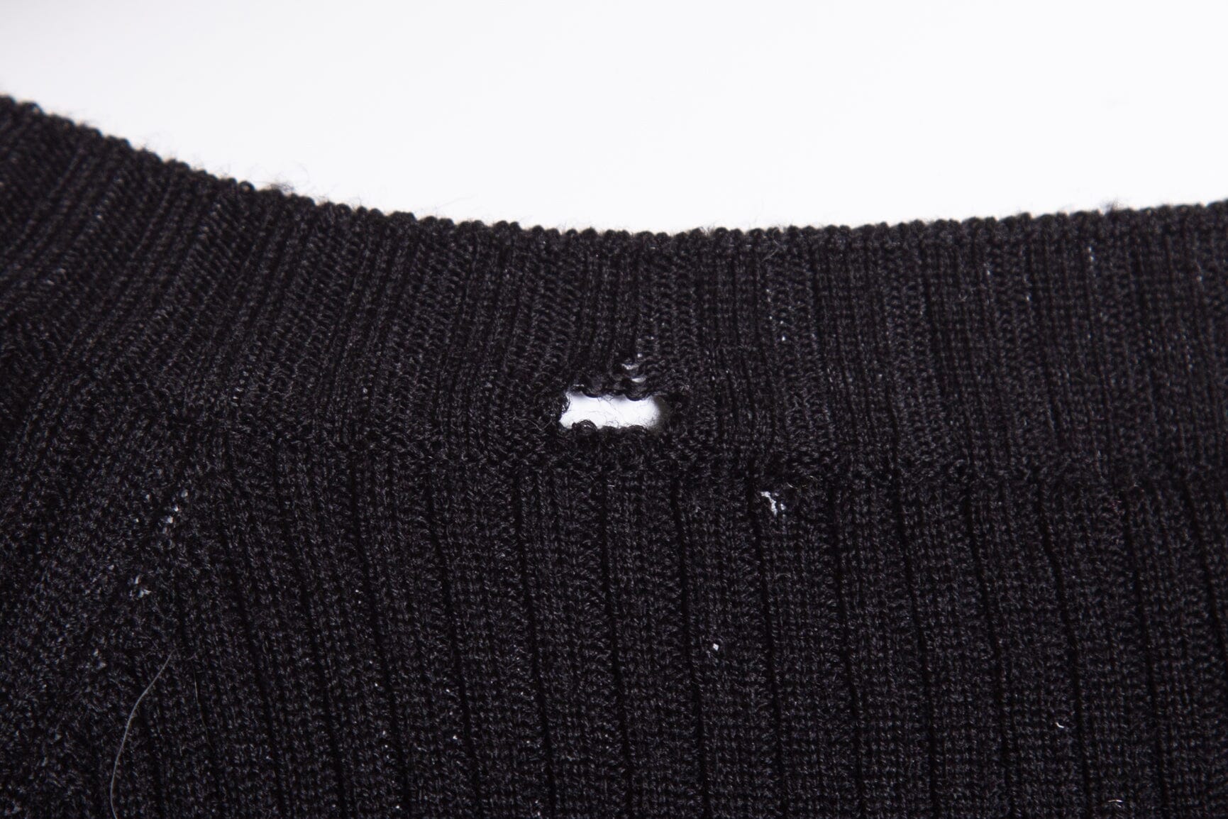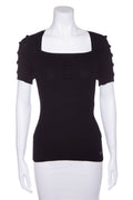Chanel Black Ribbed Short Sleeve Sweater with Bow Detail. This item is new with defects. Holes on fabric around neckline.