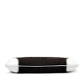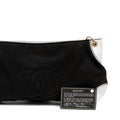 This Chanel Black Canvas Shoulder Bag is in excellent condition. Black canvas with tonally stitched interlocking CC and white leather reinforced corners. Substantial white leather single strap is interwoven with matte gold linked chain. Magnetic snap closure accesses the clean beige fabric interior with one side zipper pocket. Made in Italy. Dust bag included.
