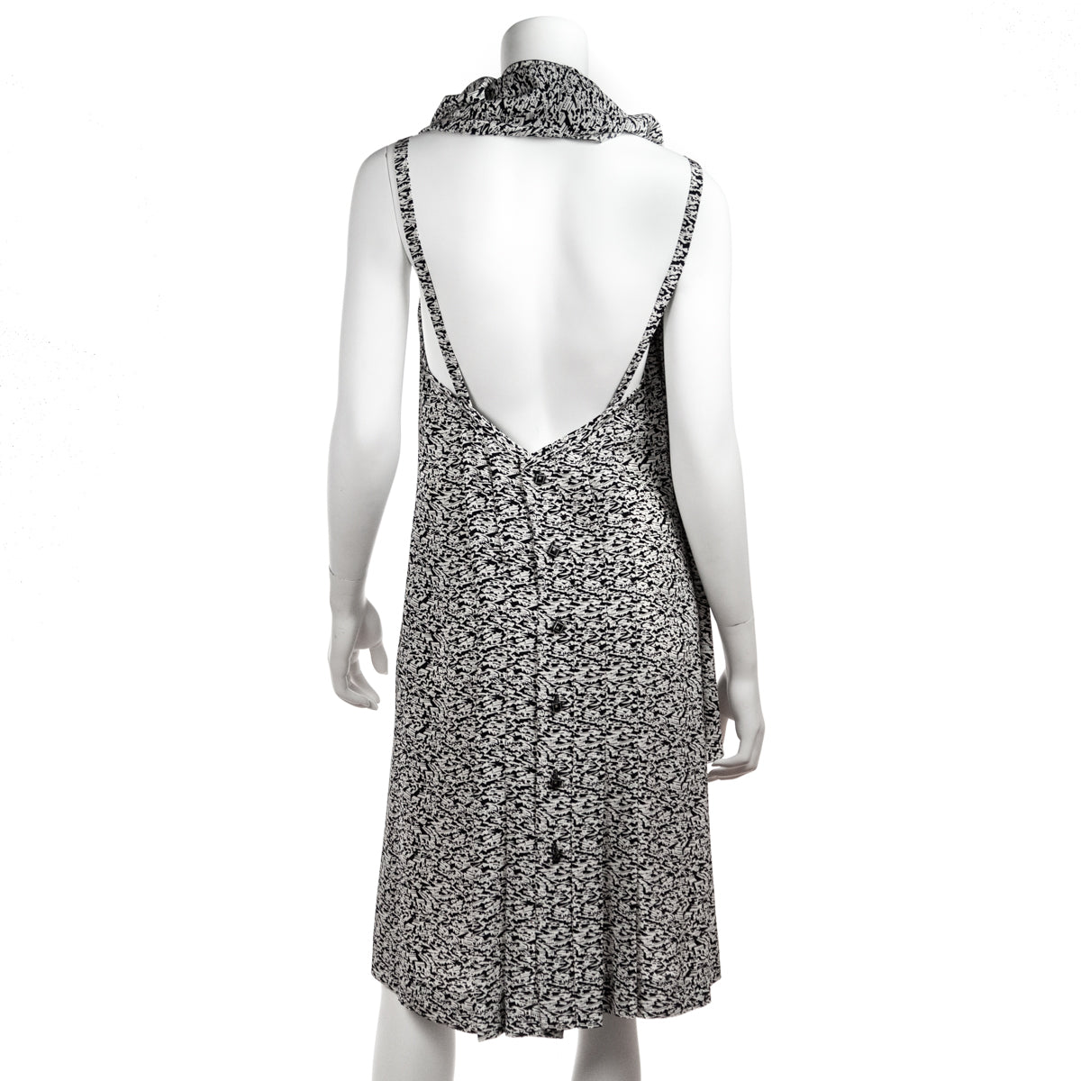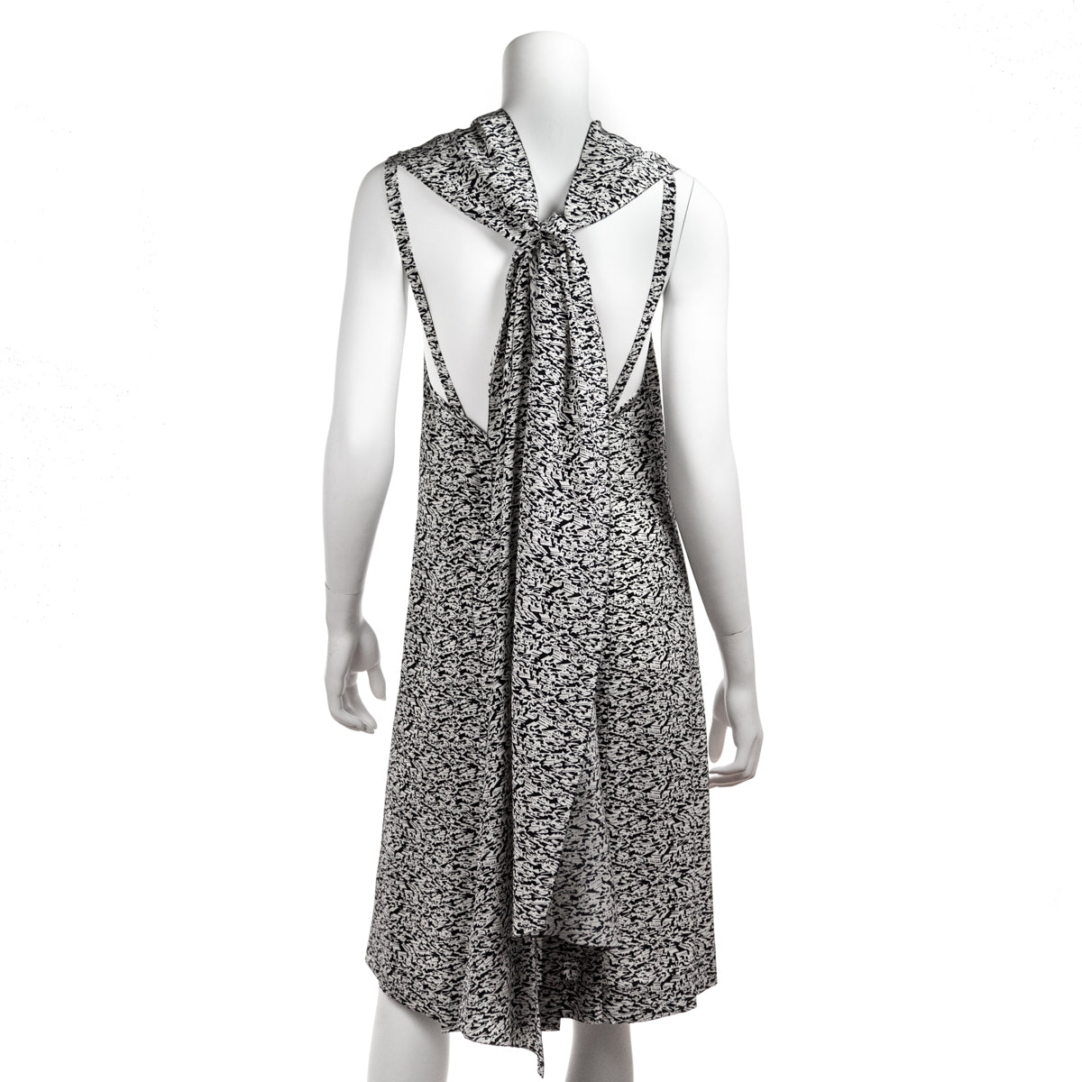 The Chanel Printed Dress is a rare gem from the Cruise 2003 collection. With its sleek black and white abstract print, and multiple styling variations, this silk pristine dress is a true head-turner. Thin near-spaghetti straps hang delicately from the shoulder, where a sash can be draped above for a thick-asymmetrical neckline, or along the bust. Moving towards the back, the sash can be tied into a stylized bow draping downwards, or tied at the high-mid back. Light pleating presents in front beneath the bust, and along the base, while a deep-cut back leads into six black logo buttons. Unlined, this lightweight dress is a breezy piece to pack away for your next big getaway!