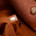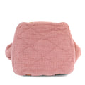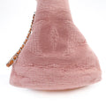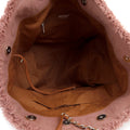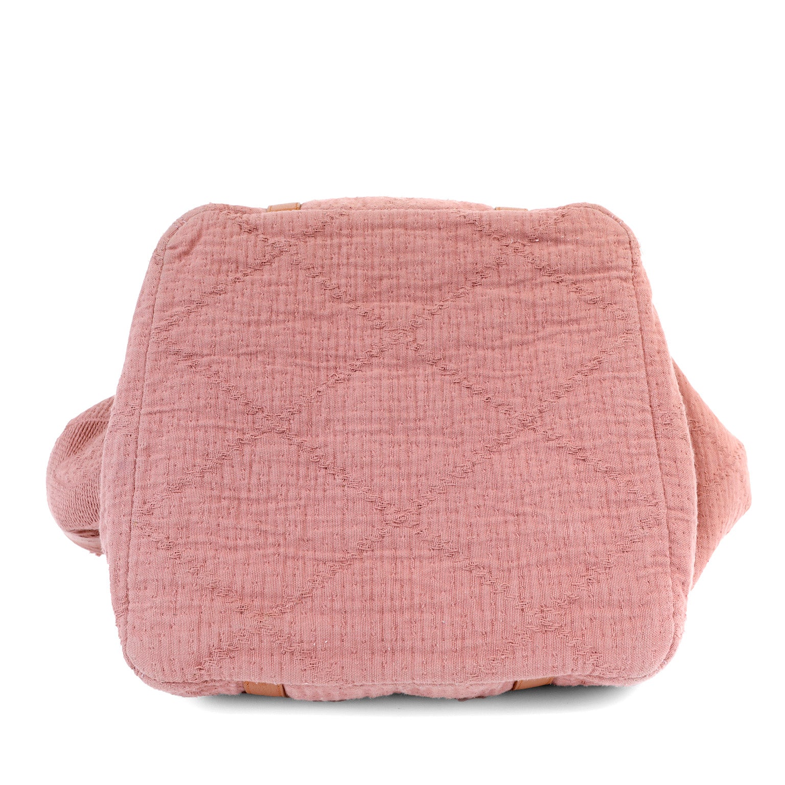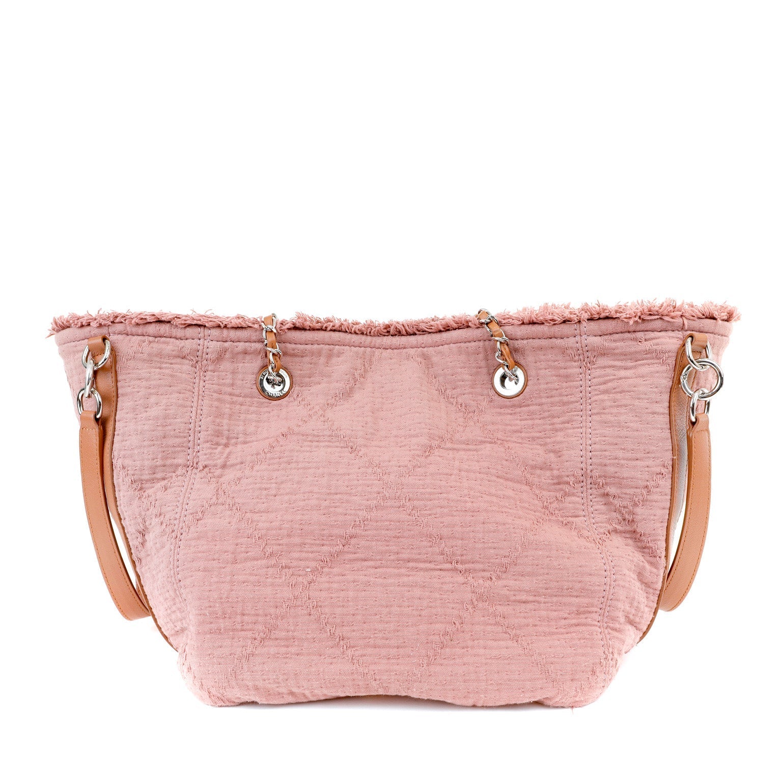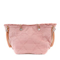 Blush pink textured fabric with silver hardware accents. Frayed edge collar and leather trimmings. Carried by the leather top handles or the chain entwined shoulder straps. Dust bag included.