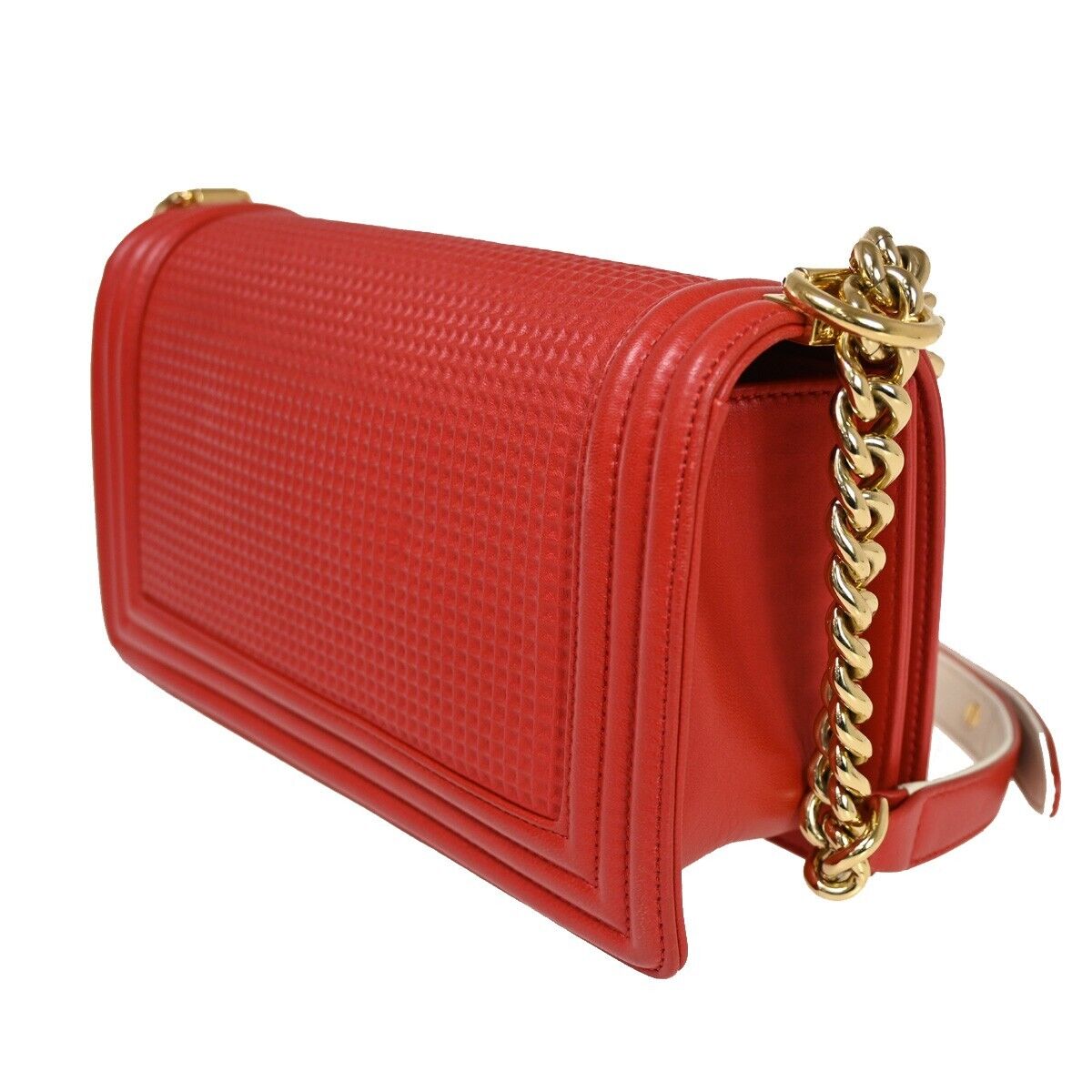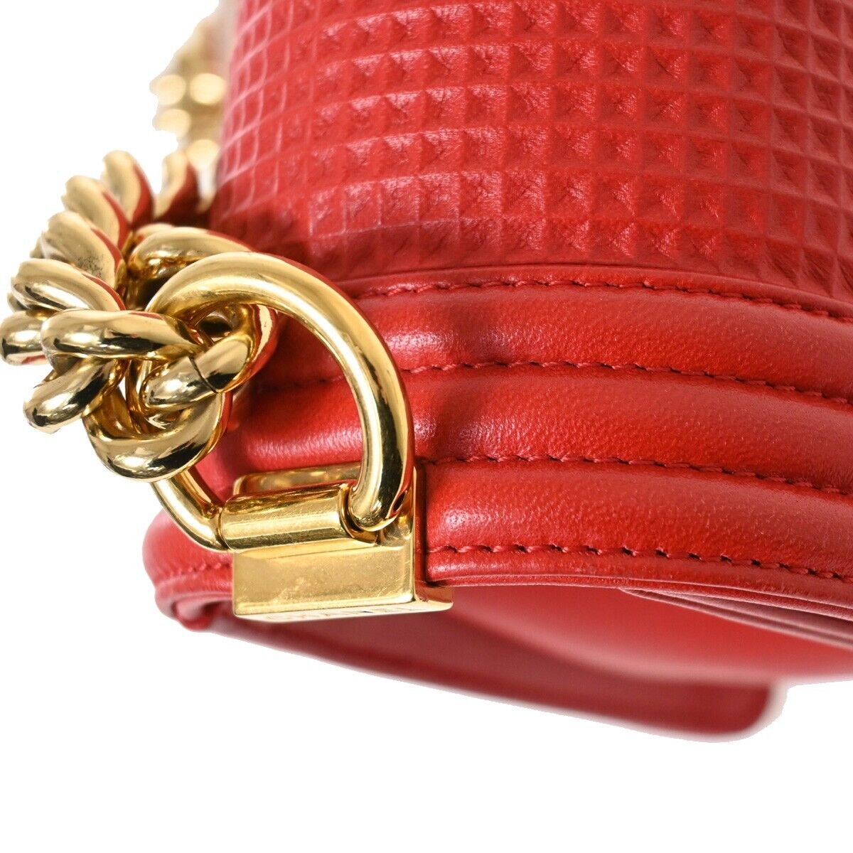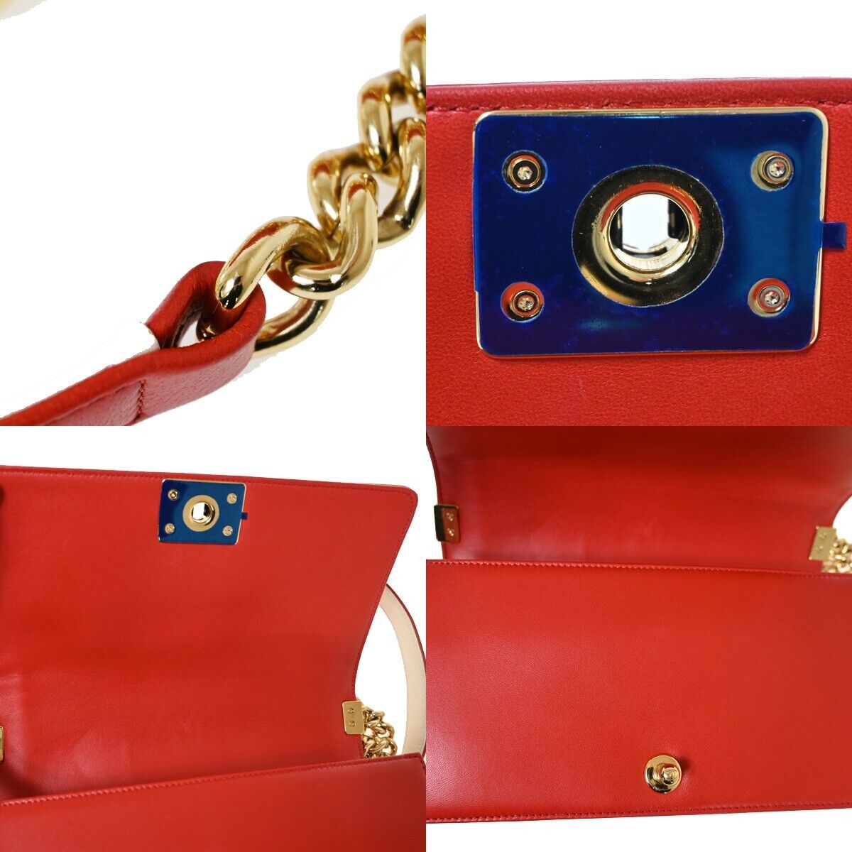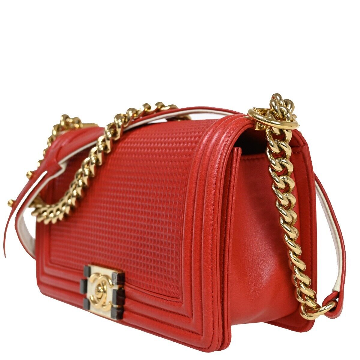 Elevate your style with the iconic Chanel Boy CC Logo Waffle Chain Shoulder Bag in striking red leather. Crafted in Italy with meticulous attention to detail, this bag exudes luxury and sophistication. The gold-tone hardware adds a touch of glamour, while the chain strap allows for versatile wear. Make a bold statement and add a timeless piece to your collection with this exquisite Chanel creation.