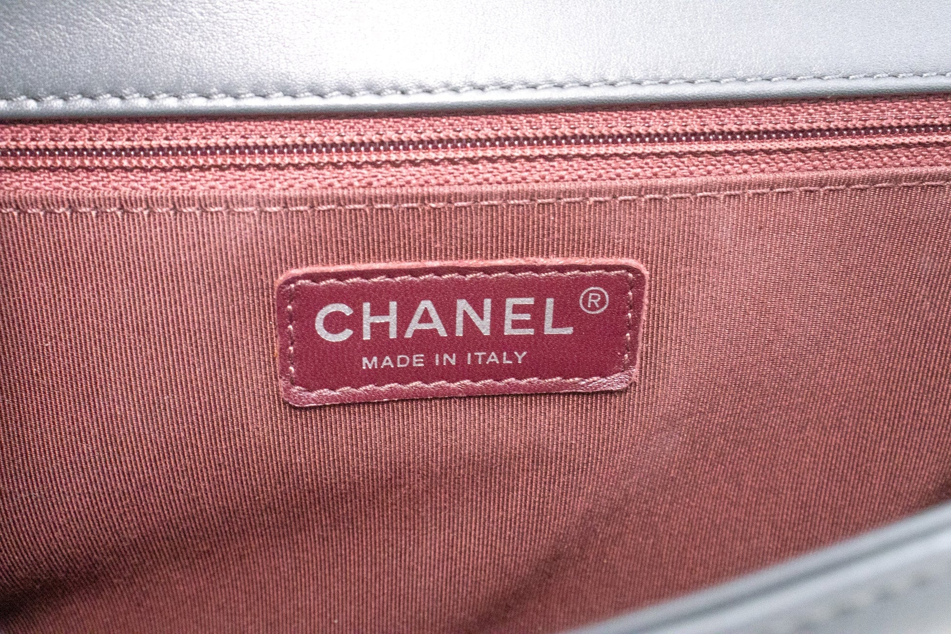 An CHANEL Boy Dark Gray V-Stitch Chain Shoulder Bag Quilted Flap.