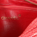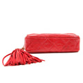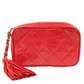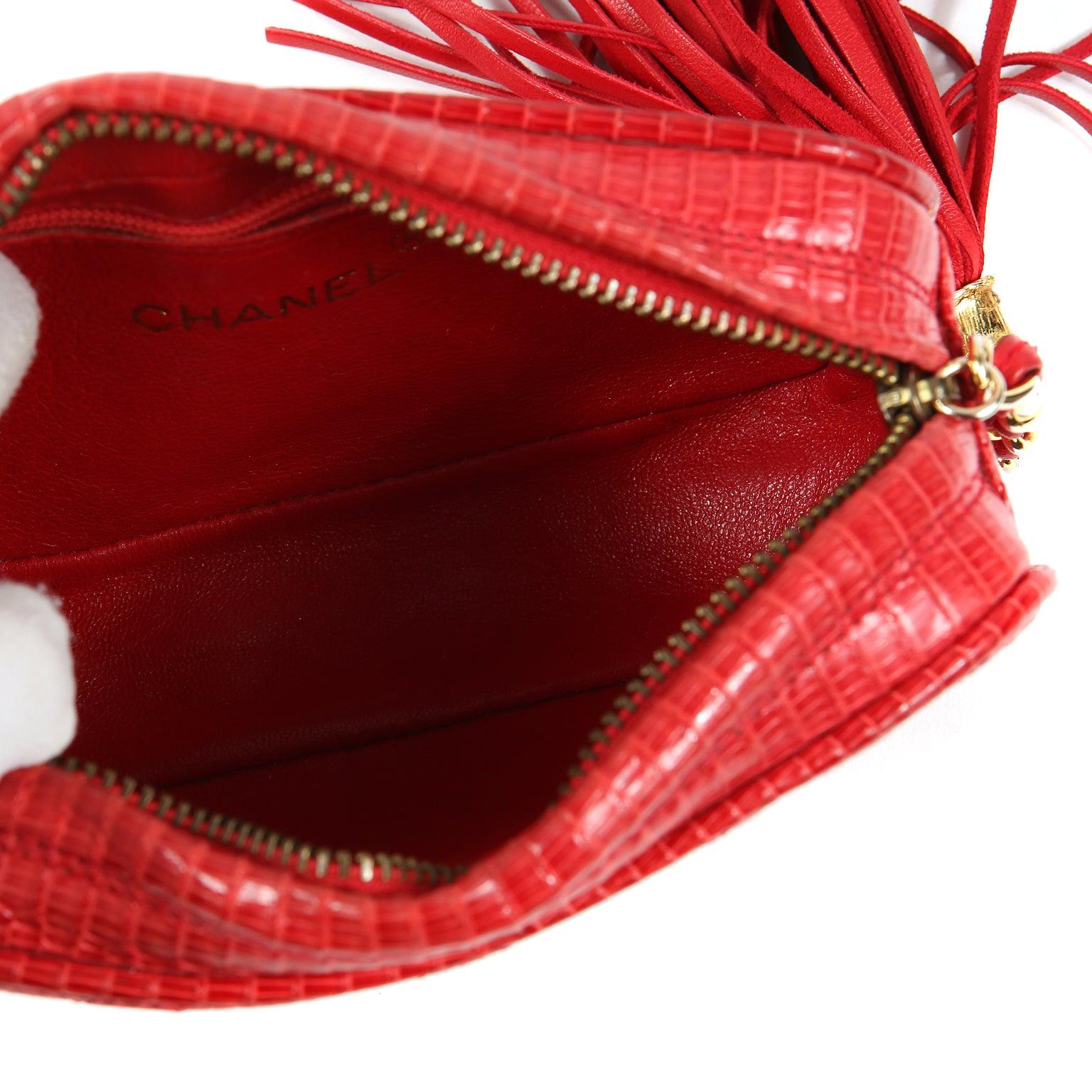 Bright red lizard skin is quilted in signature Chanel diamond pattern. Zippered top has an oversized leather tassel pull attached to a gold chain and leather entwined chain short strap. Red leather interior. Chanel ity card, intact hologram and dust bag included.