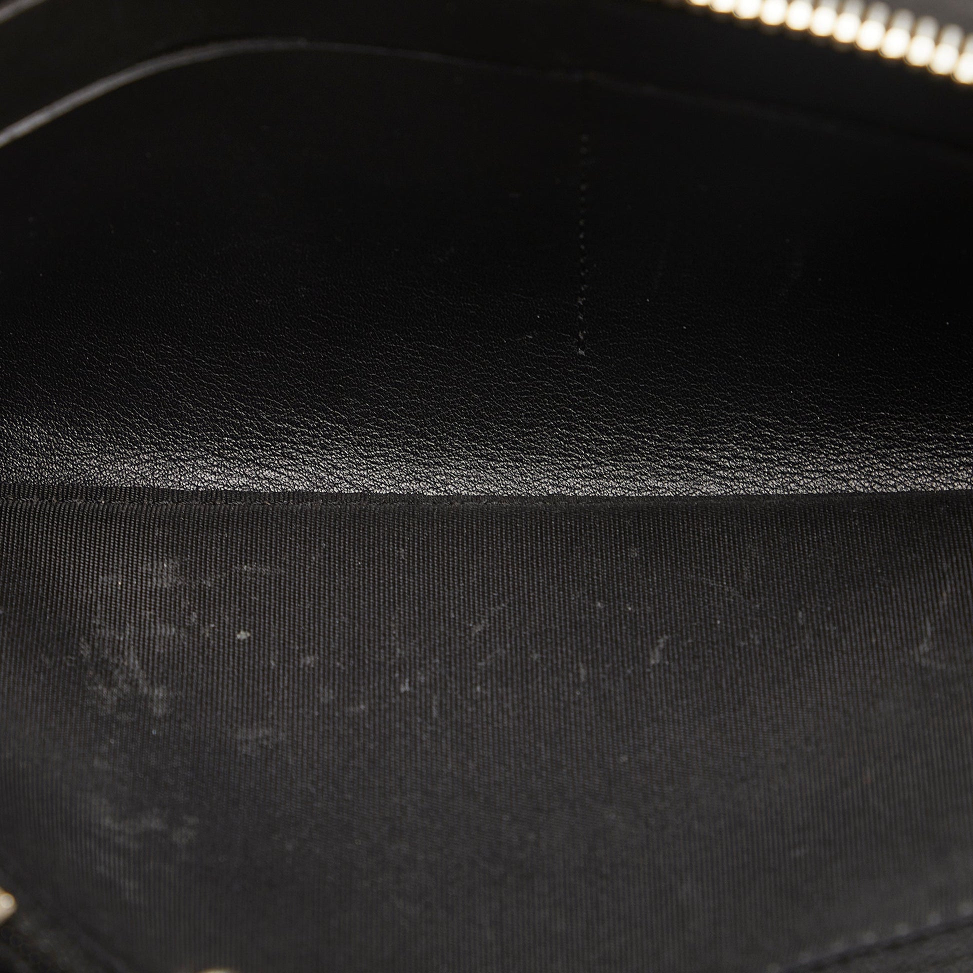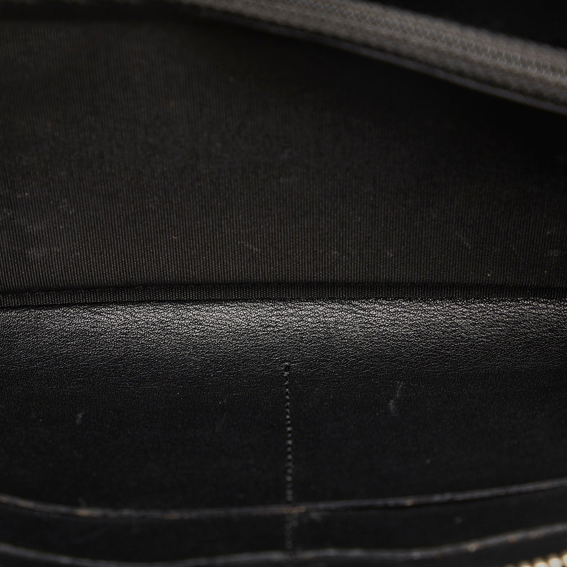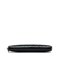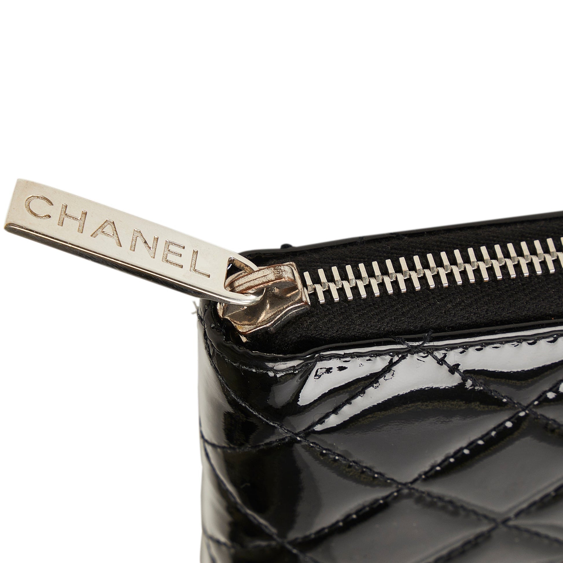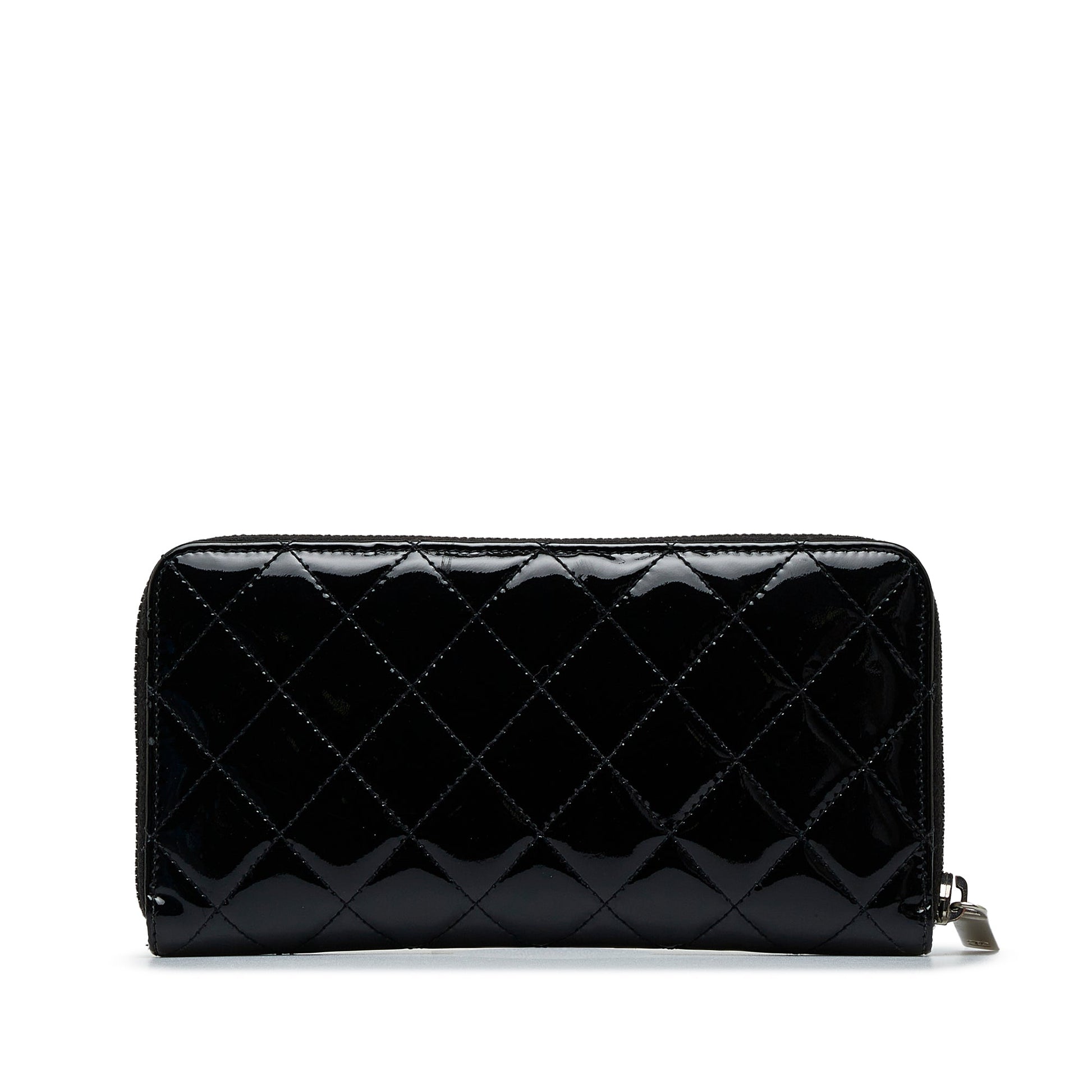 This wallet features a quilted patent leather body, a zip-around closure, and interior zip and slip compartments.