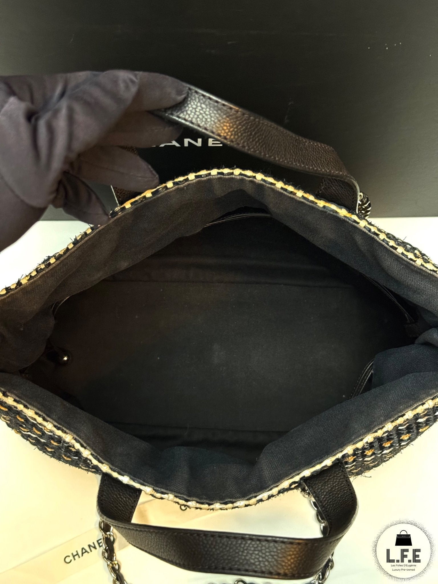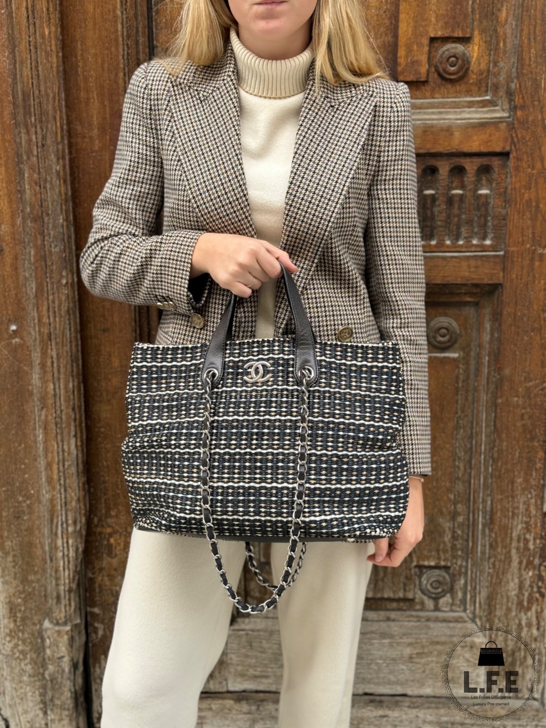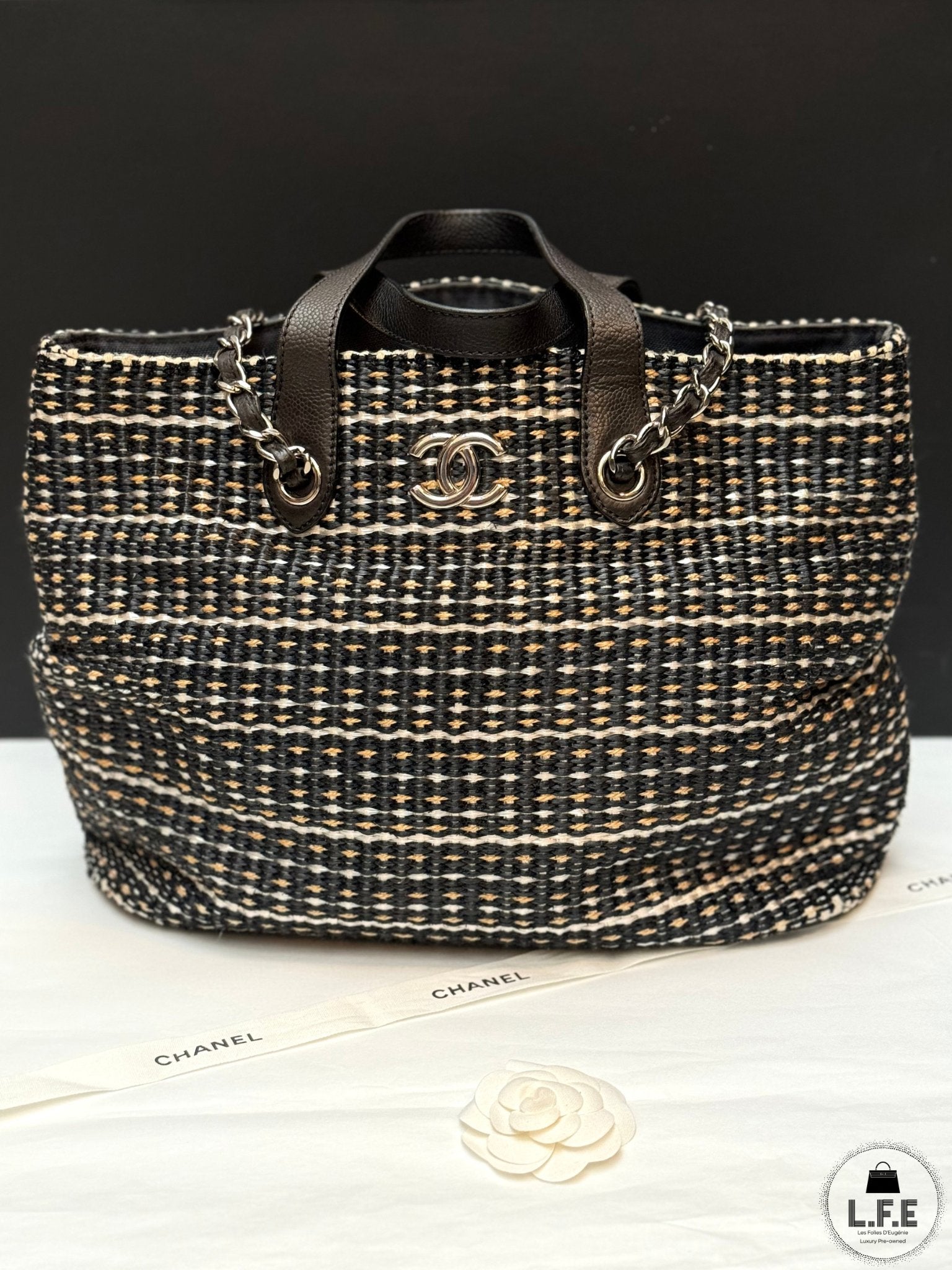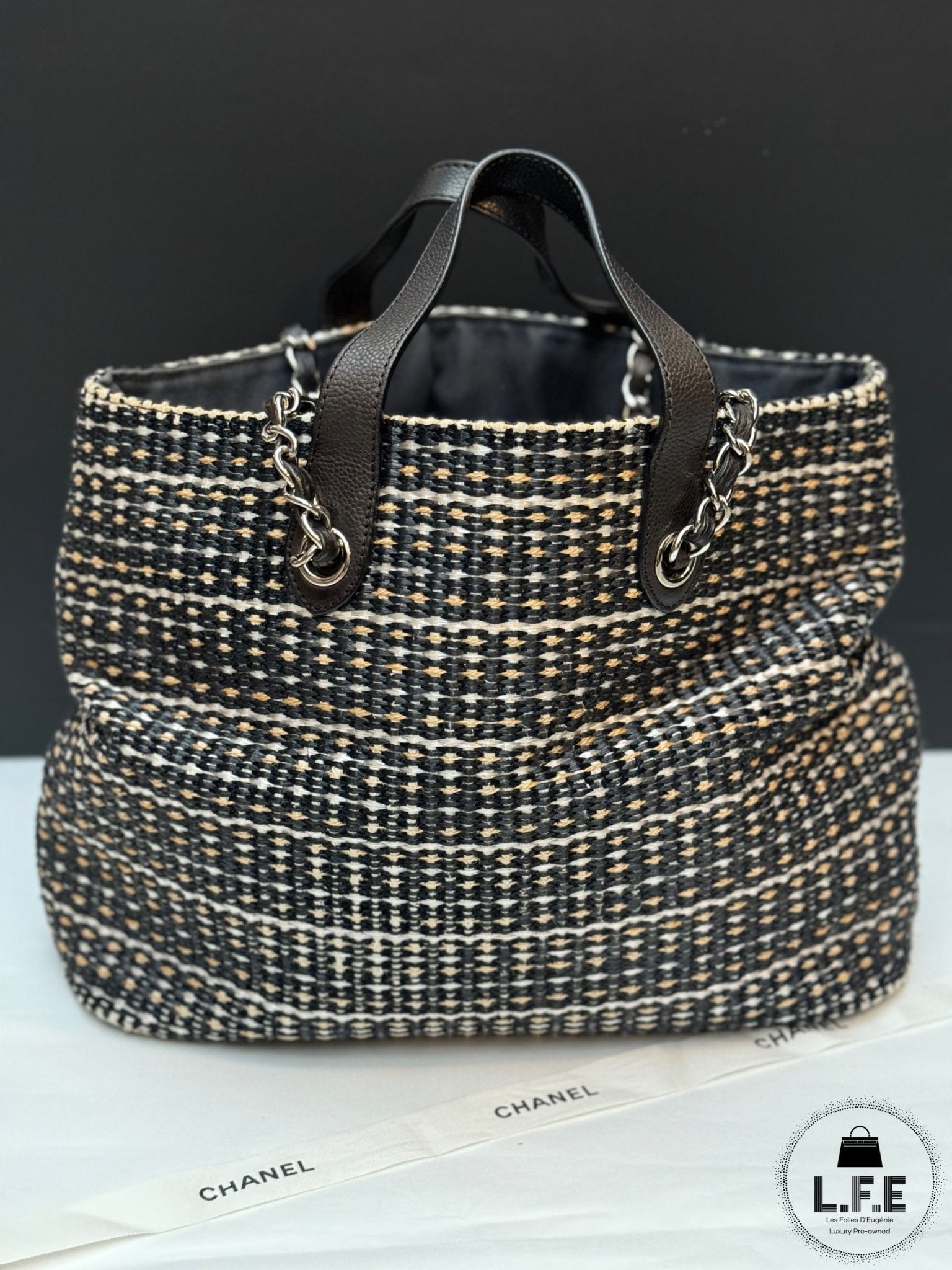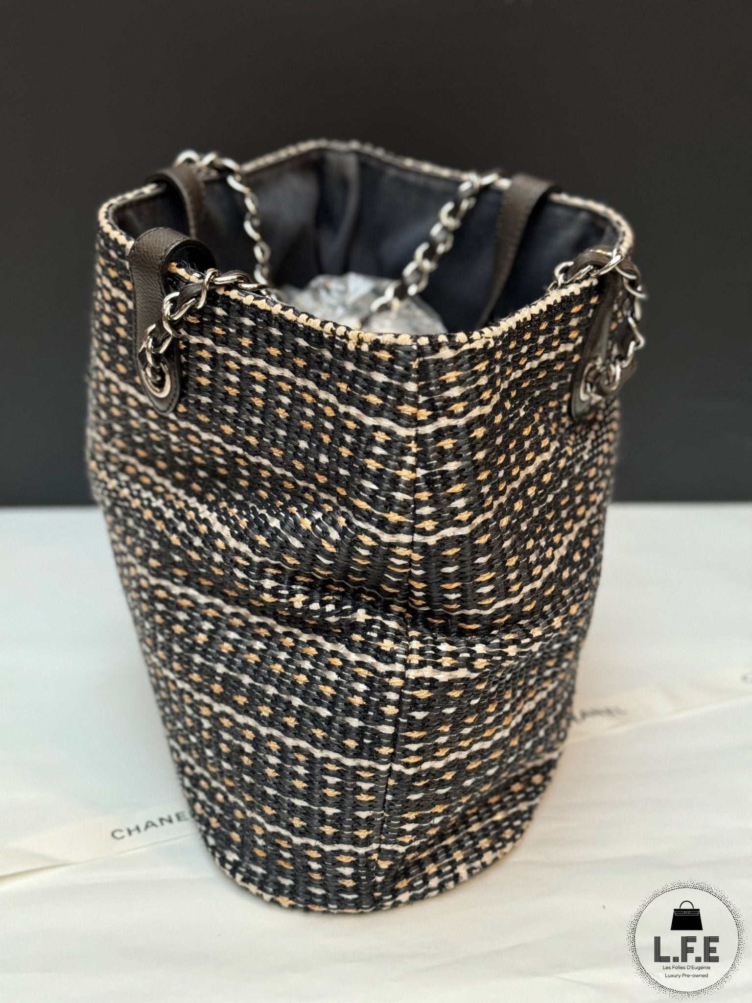 Le Sac Shopping de Chanel est fabriqué en Italie à partir de rotin et de cuir de veau grainé, il est conçu pour contenir plus que l'essentiel, comme une bouteille d'eau ou un livre. Surmonté de finitions argentées, ce cabas peut être porté par les poignées ou à l'épaule grâce à la chaîne entrelacée.