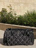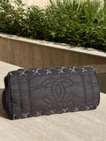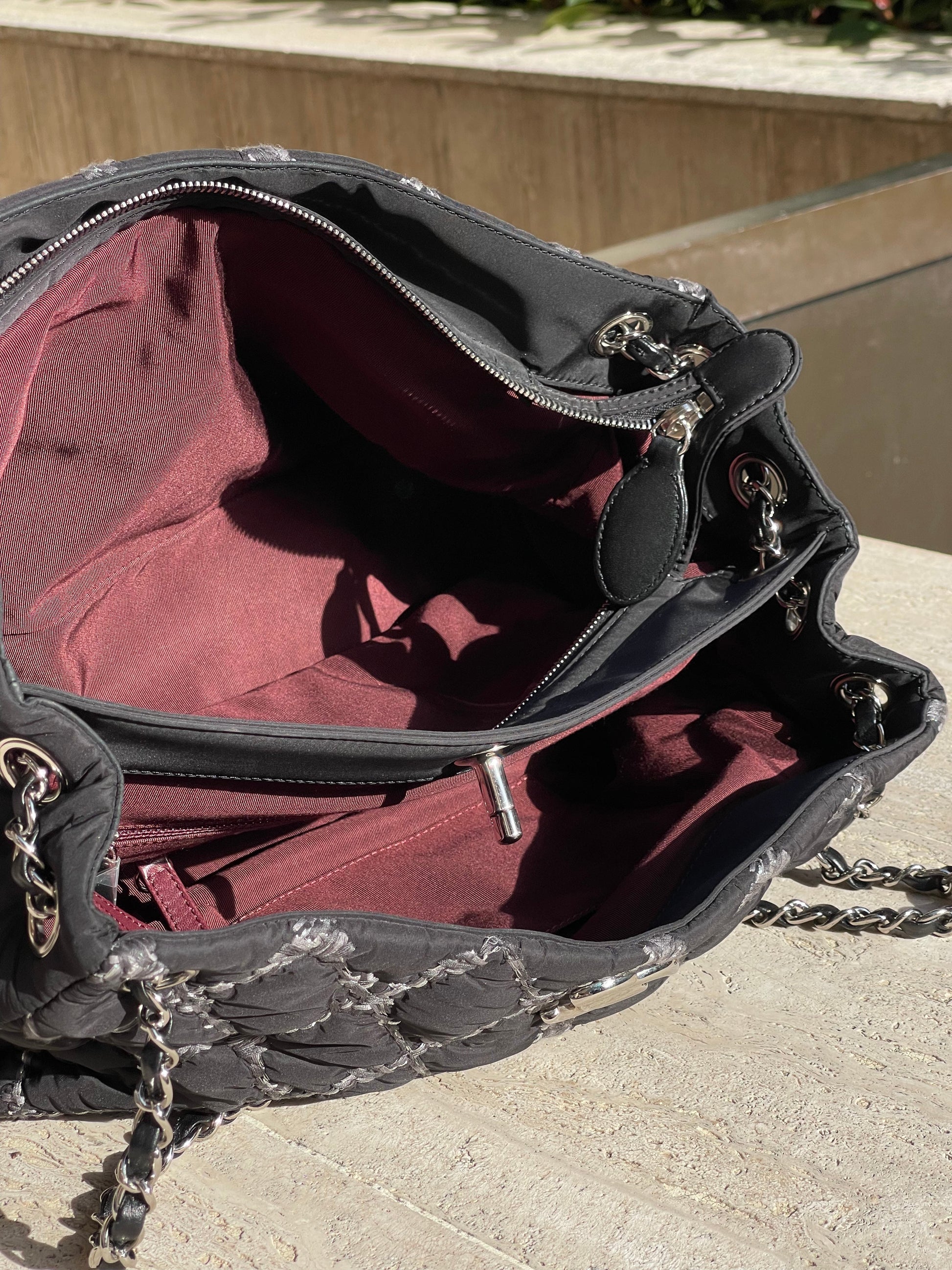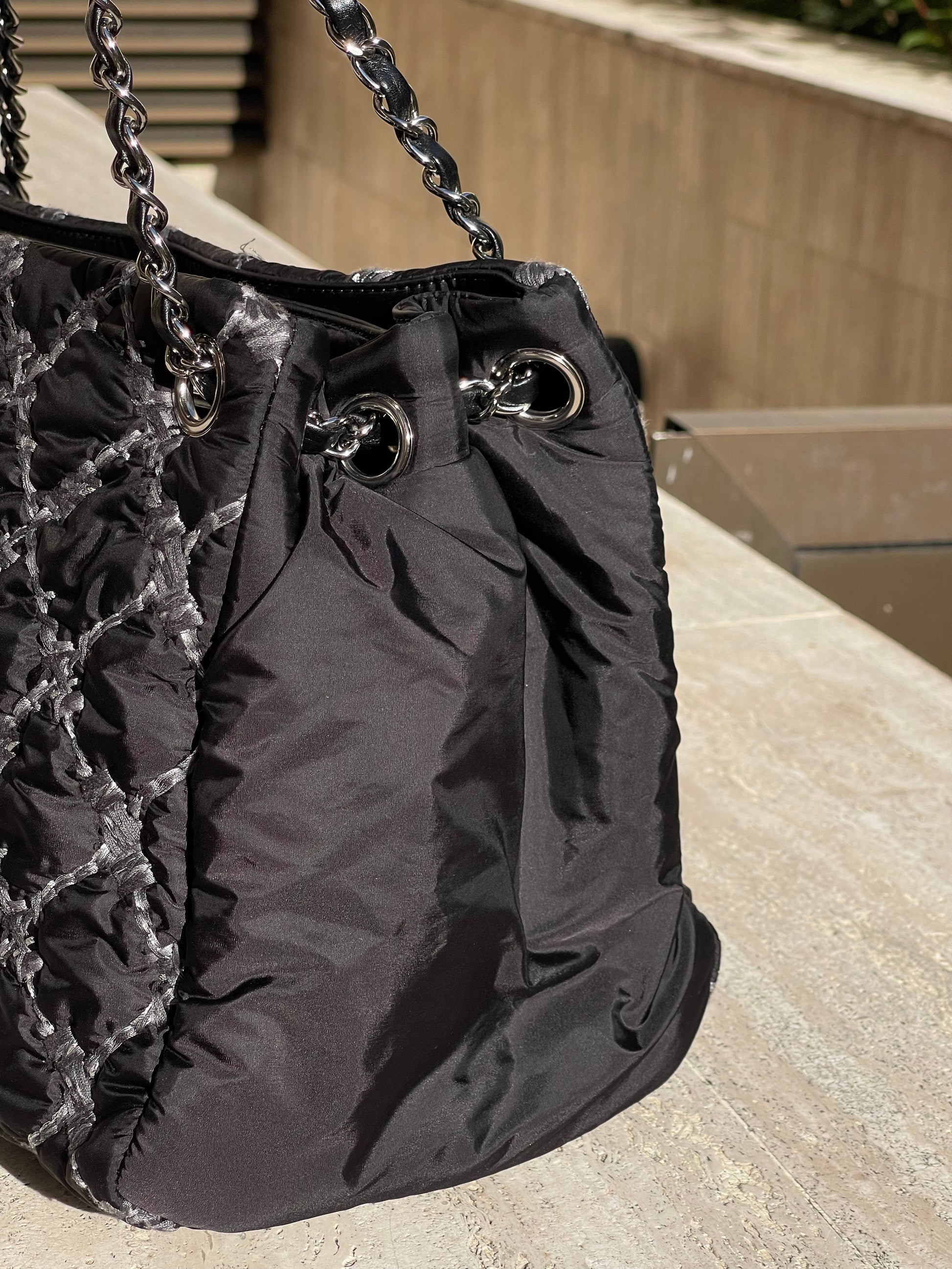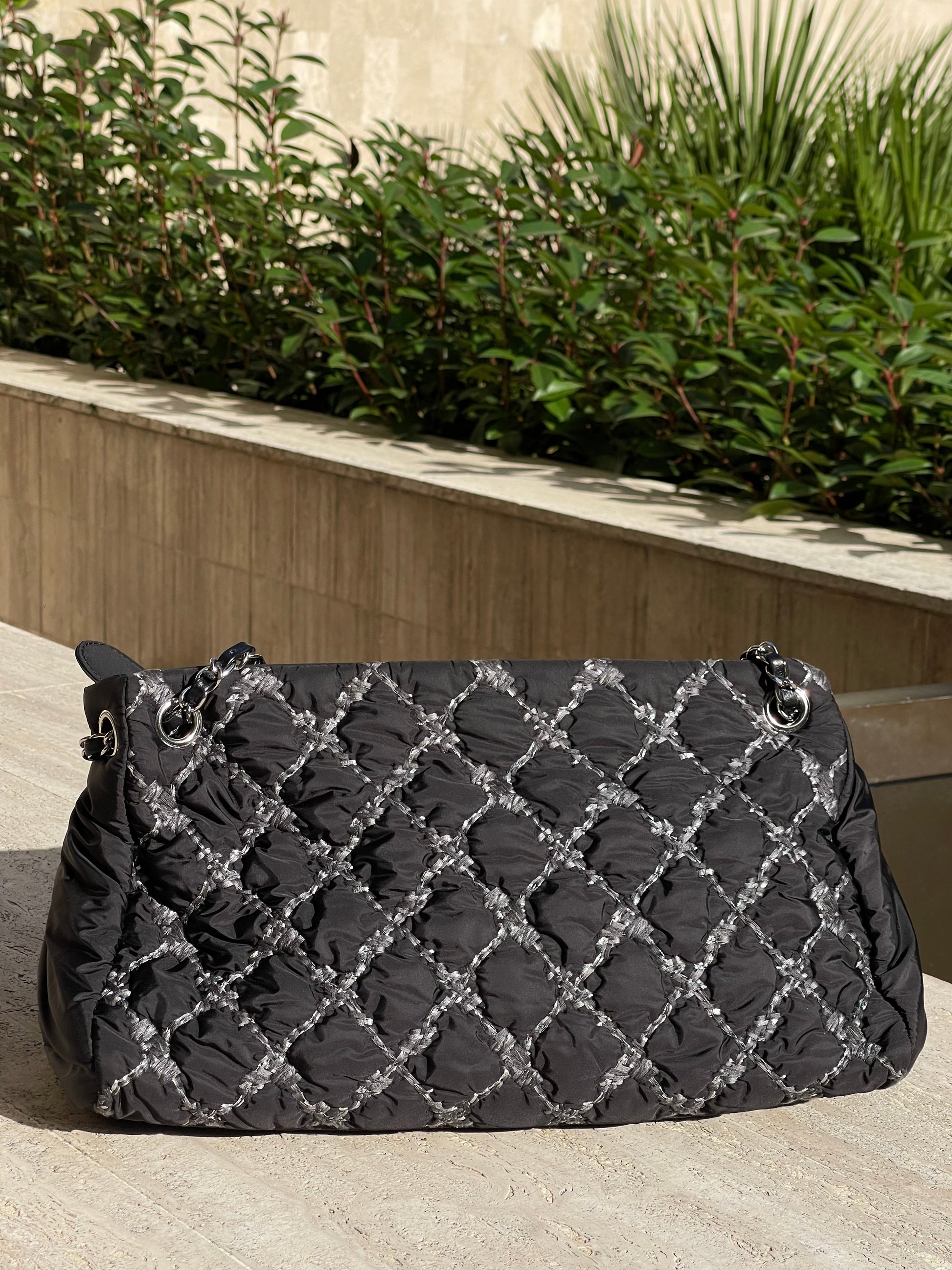 Superbe cabas shopping? Collection Paris-Byzance en nylon noir. Matelassage brodé de tweed blanc fils argentés.