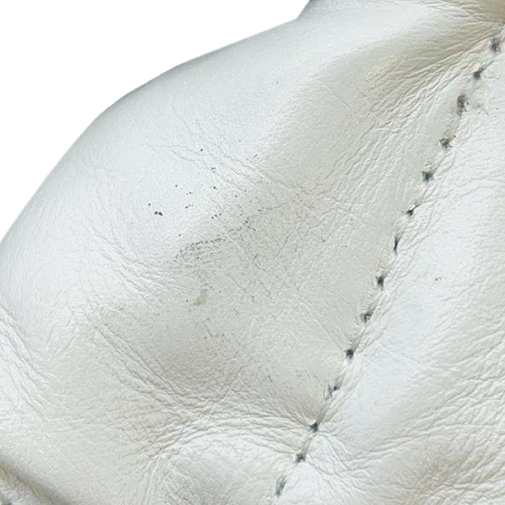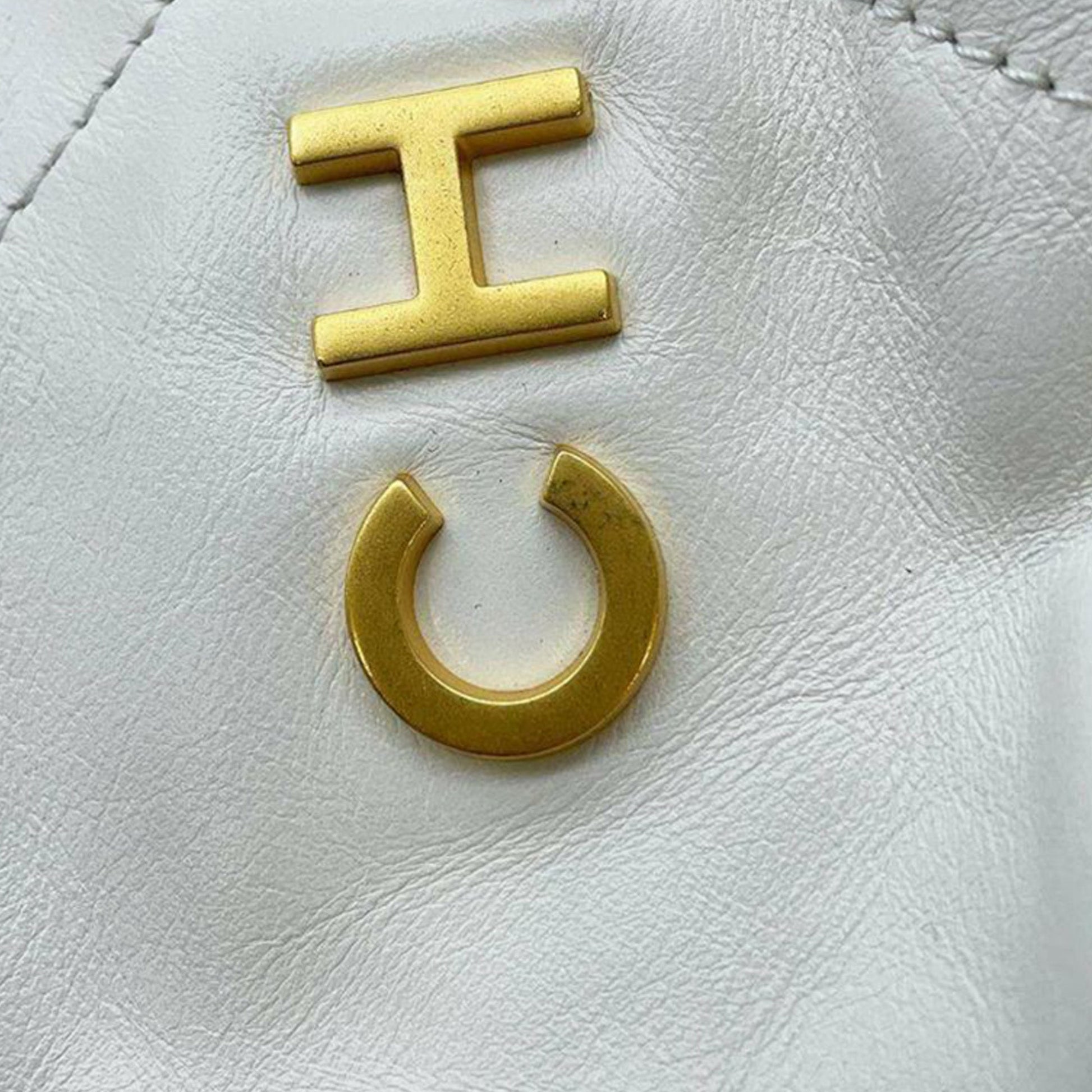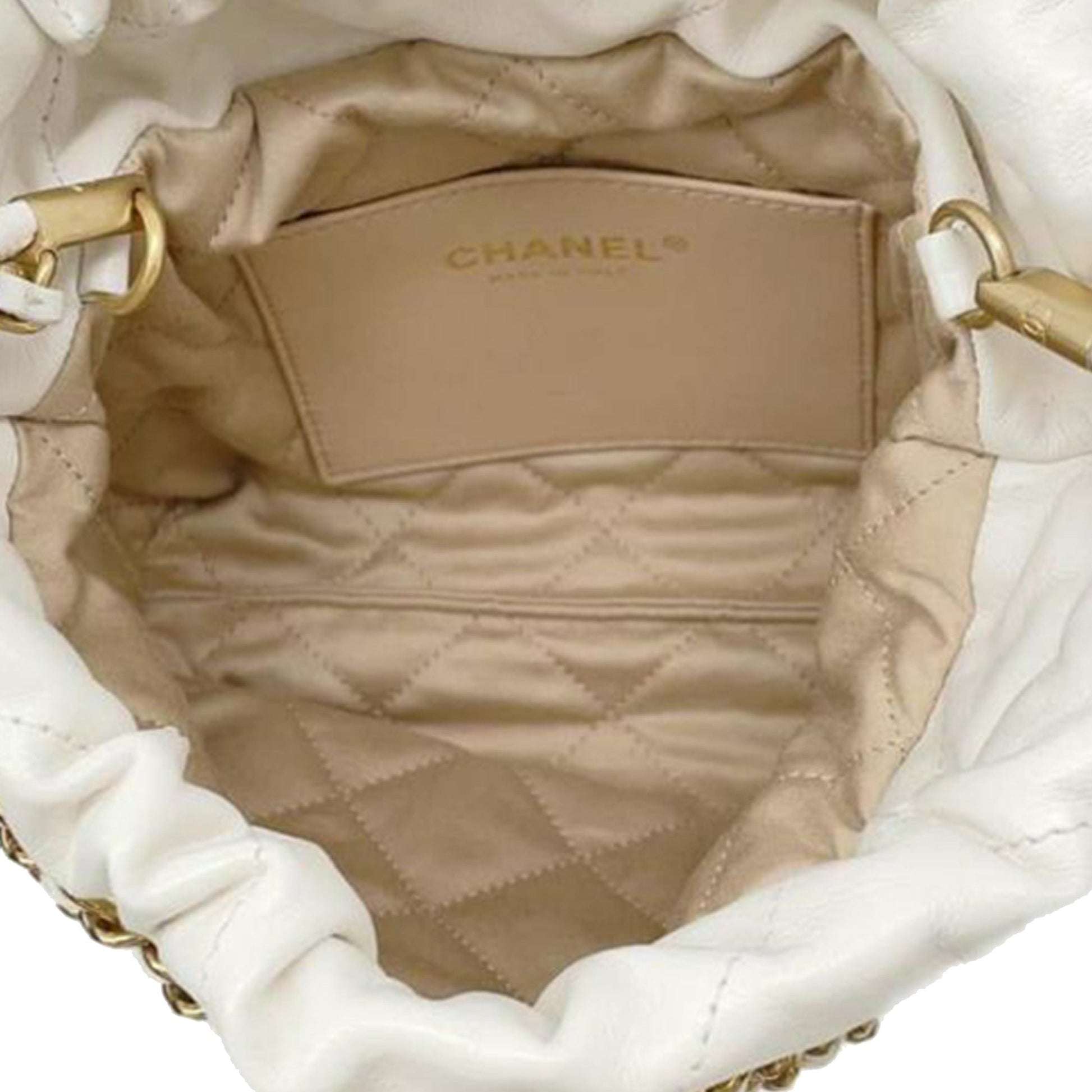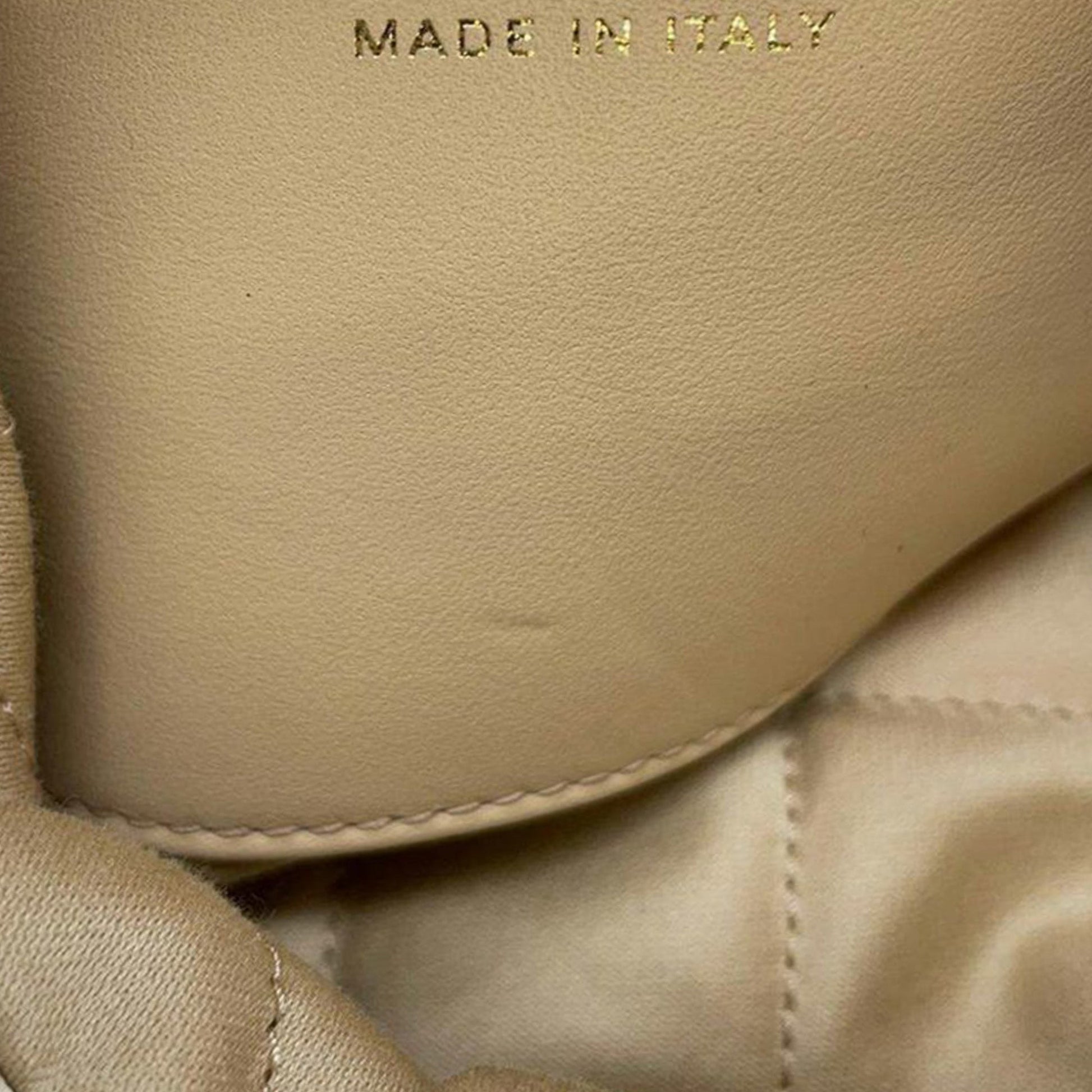 This satchel features a quilted leather body, leather woven chain straps, a rolled leather shoulder strap, an open top with magnetic closure, and an interior slip pocket. Comes with box and dust Bag.