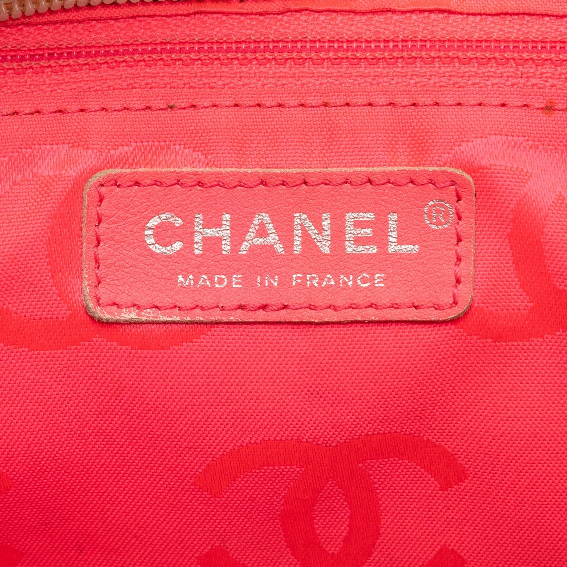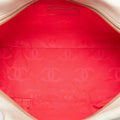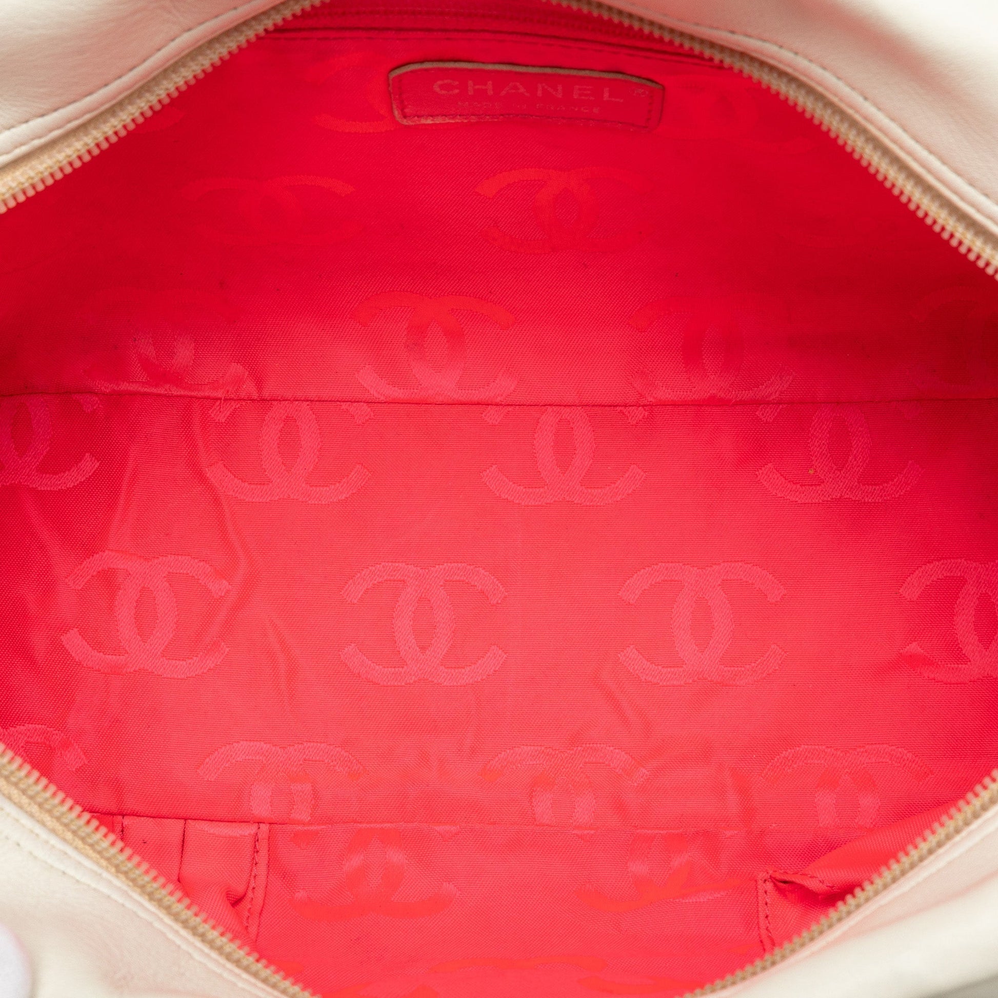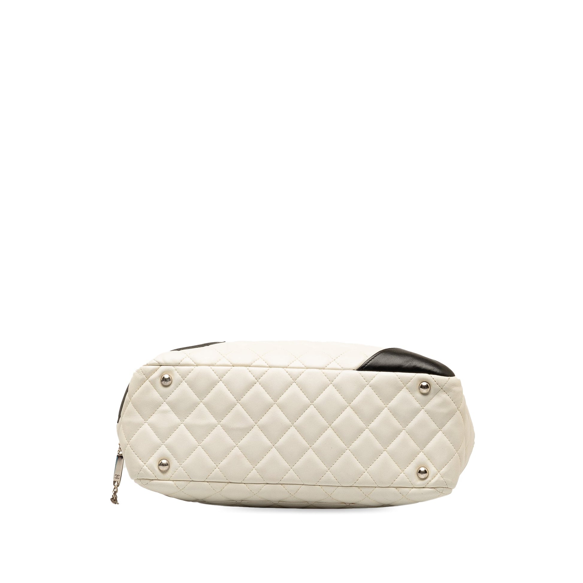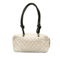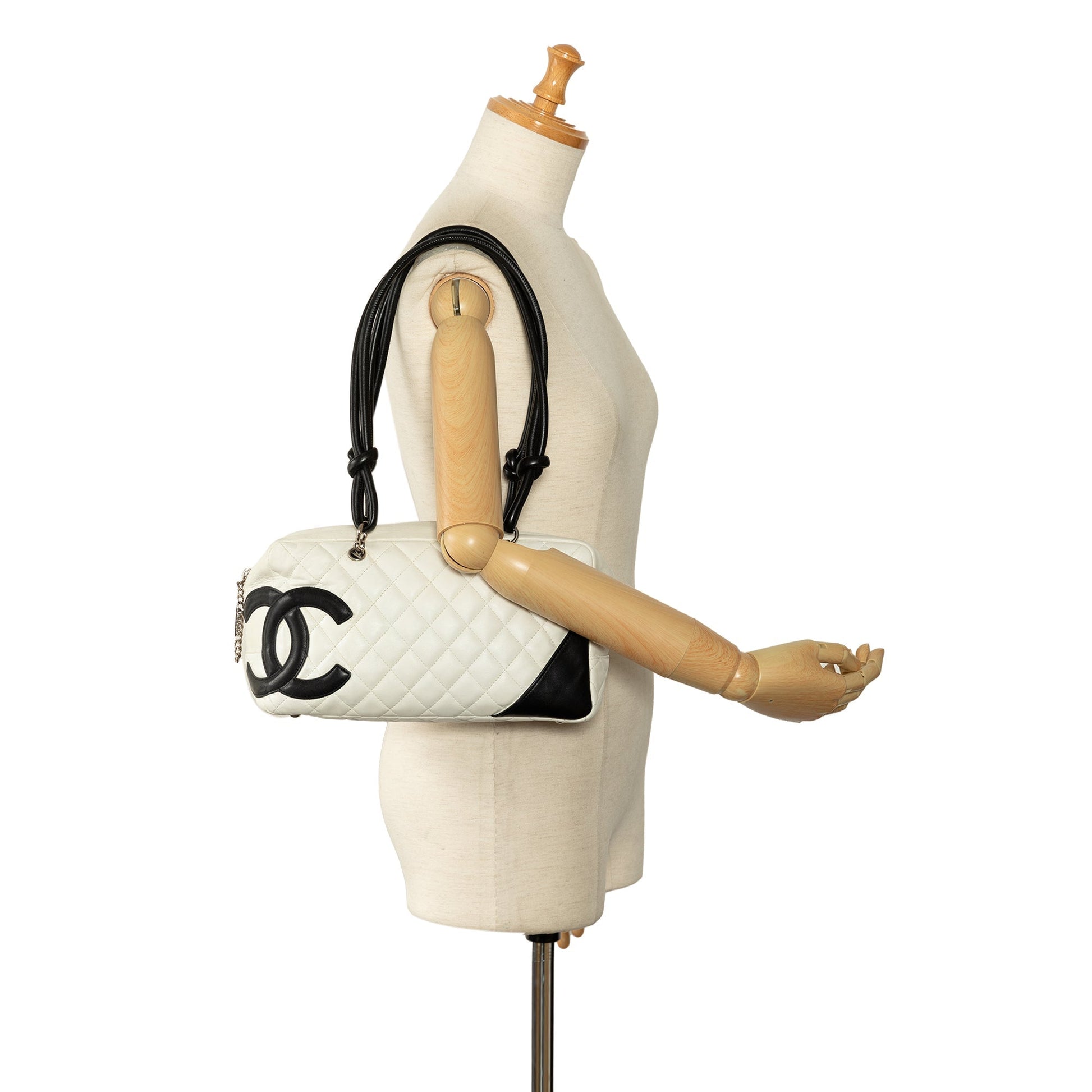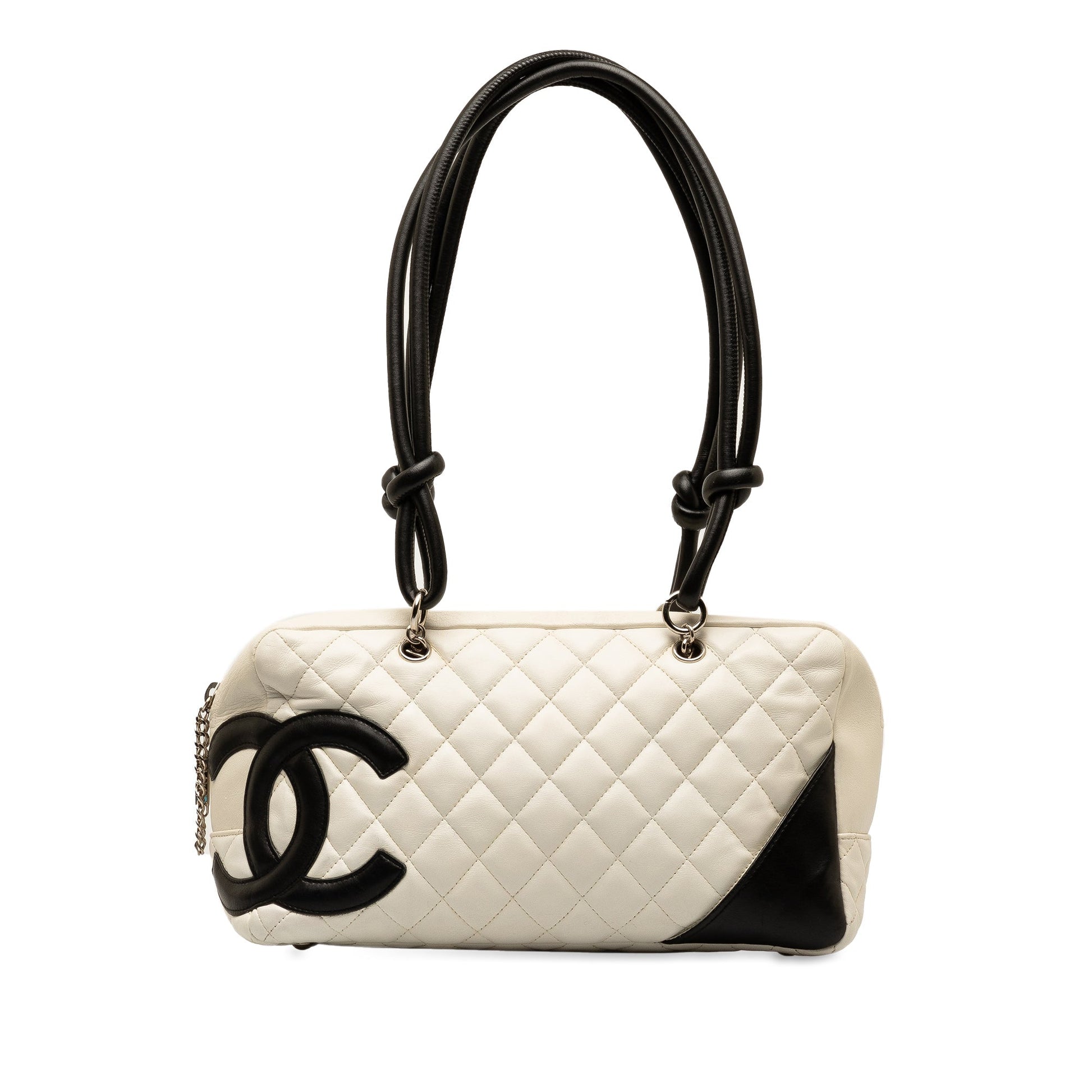 The Cambon Ligne shoulder Bag features a quilted lambskin leather body with interlocking Cs, rolled leather handles, a top zip closure, a back exterior slip pocket, and an interior zip pocket.