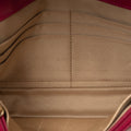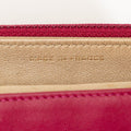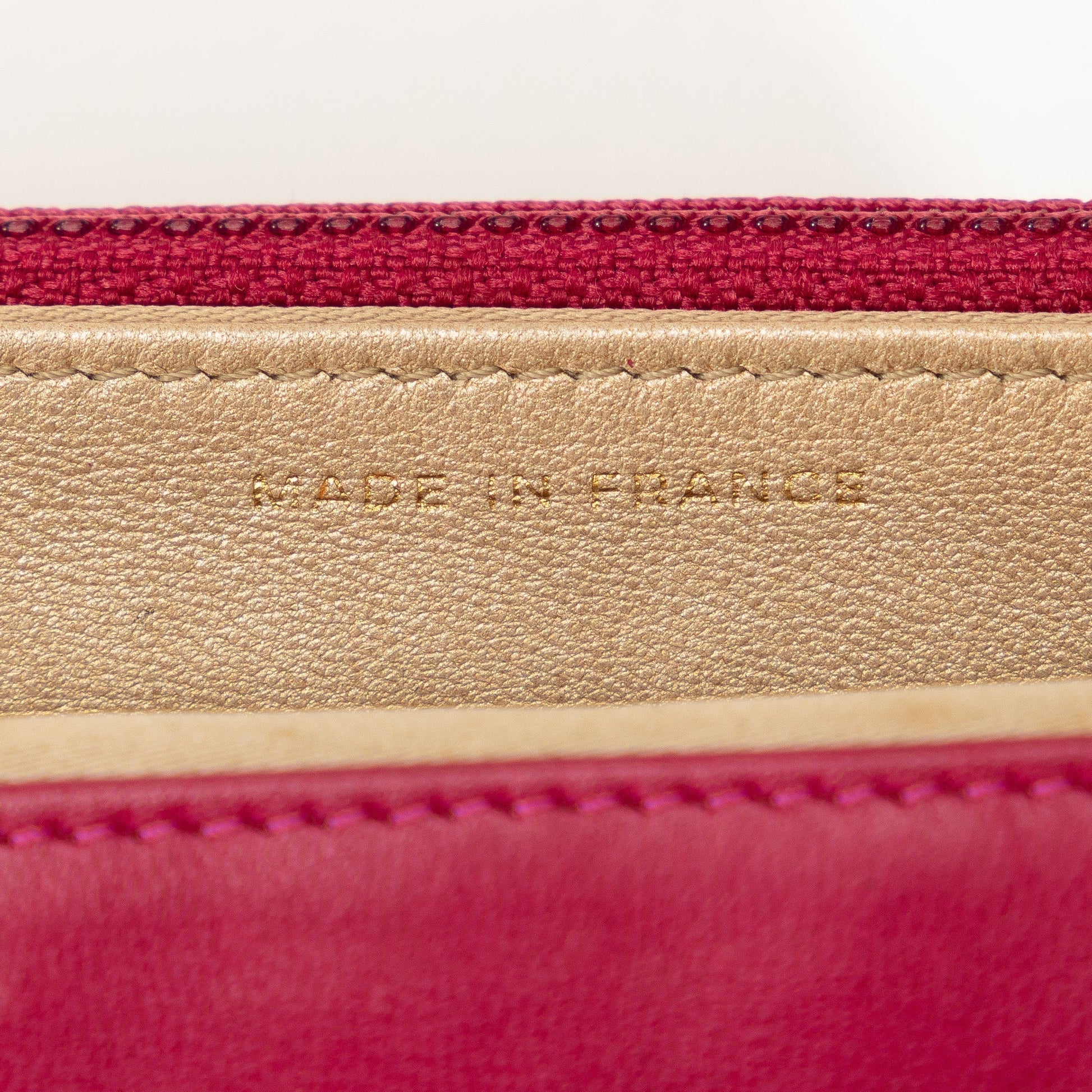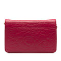 This wallet on chain features an embossed leather body, a leather-woven chain strap, a top flap with magnetic closure, and interior zip and slip pockets.