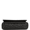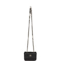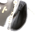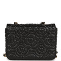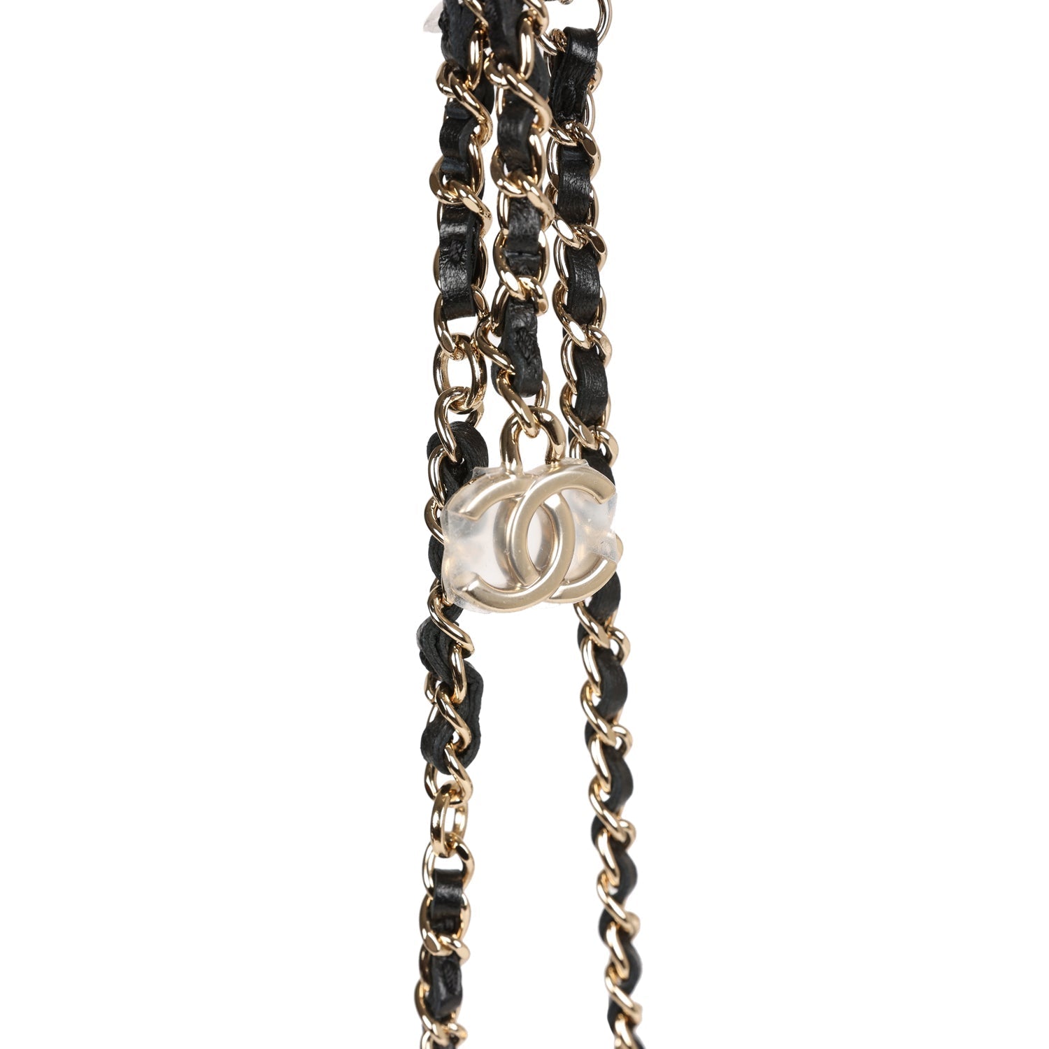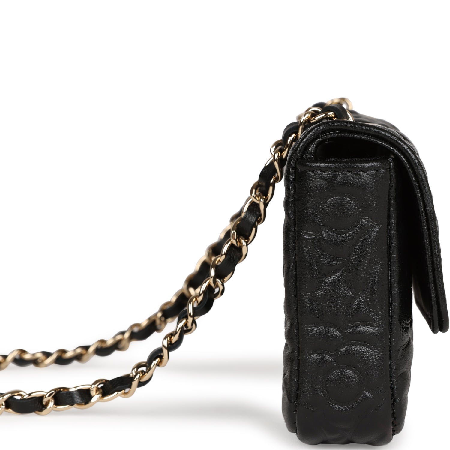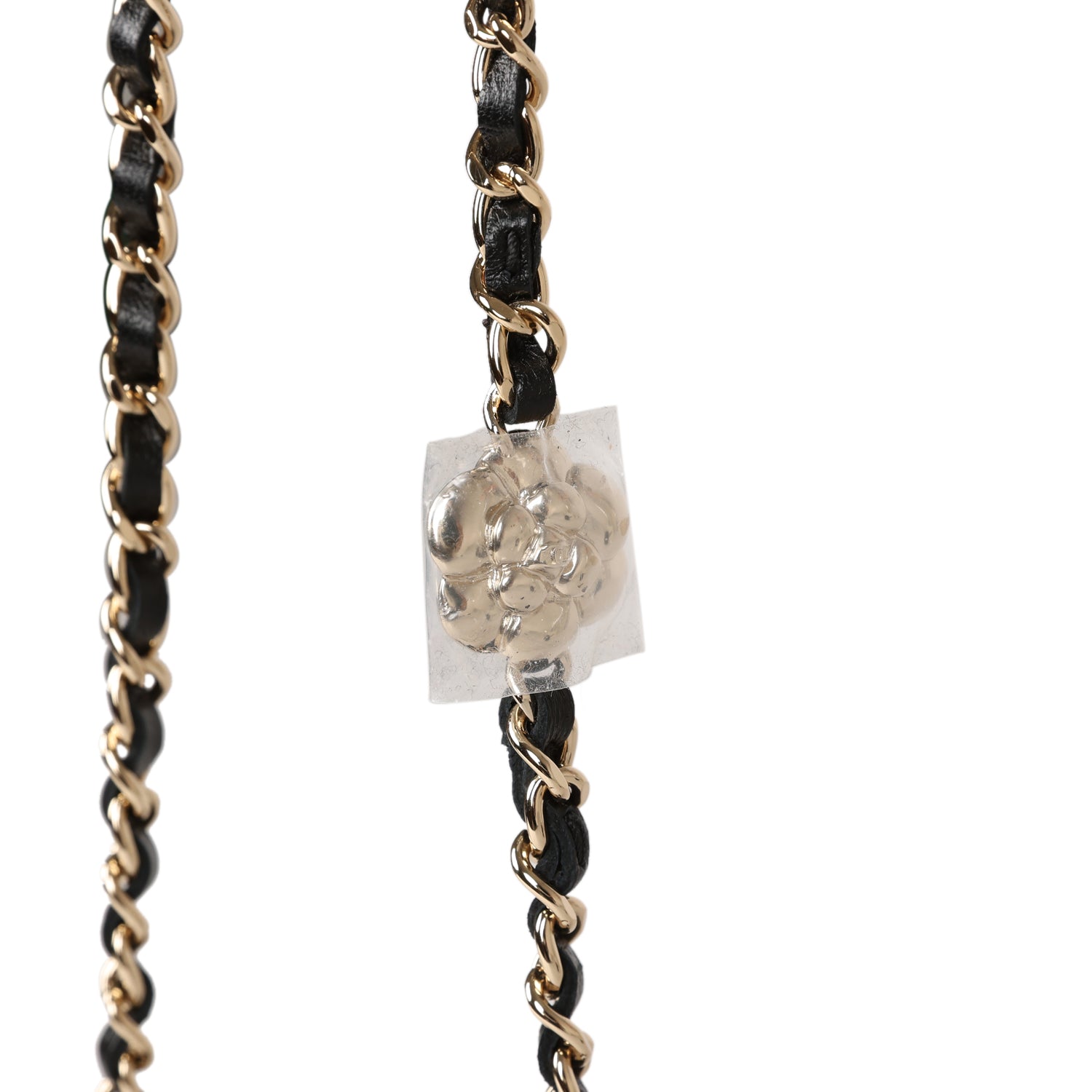 This Camellia Embossed Belt Bag is in Black Lambskin with Light Gold Hardware, tonal stitching, snap closure, and an interwoven black and light gold chain link that acts as a belt.