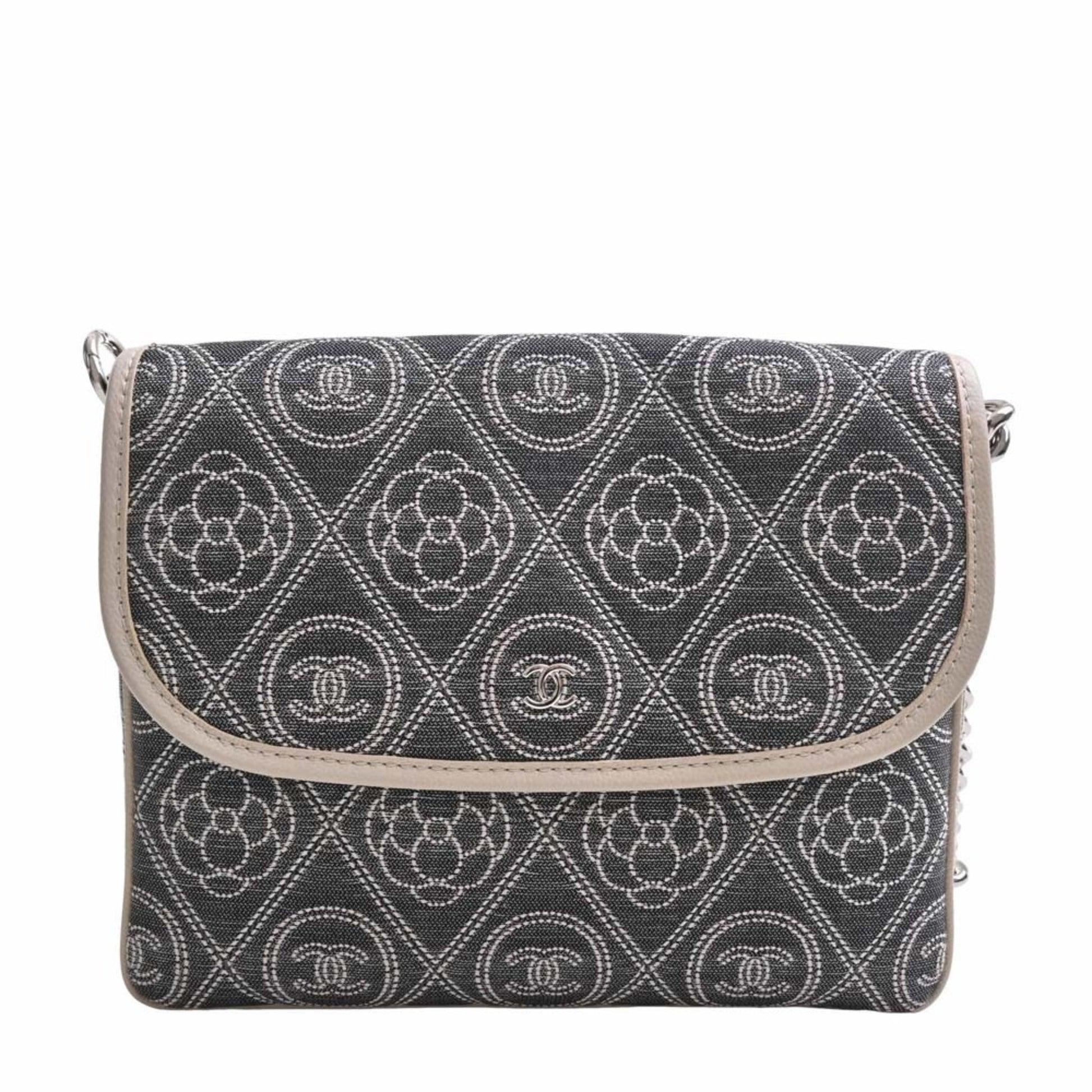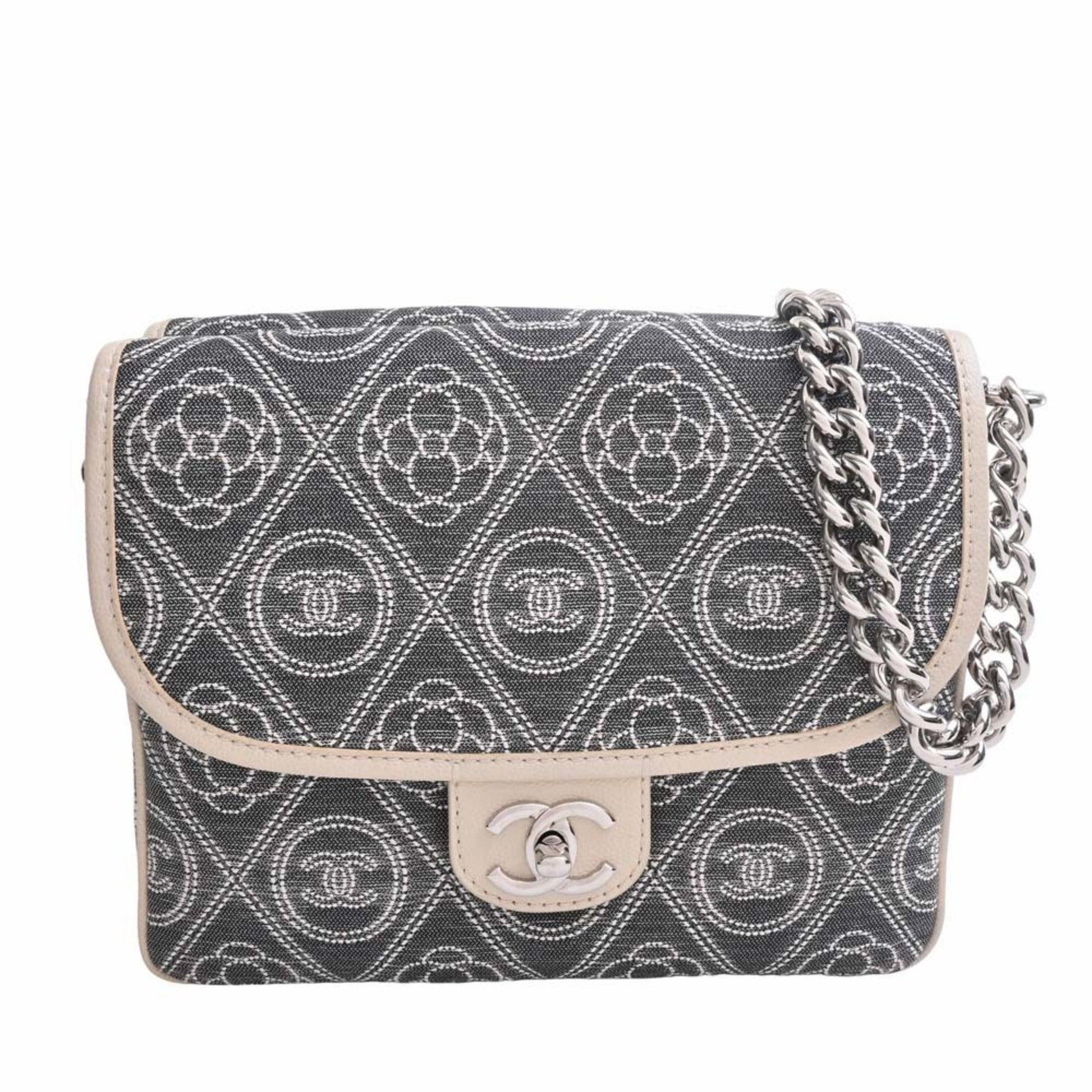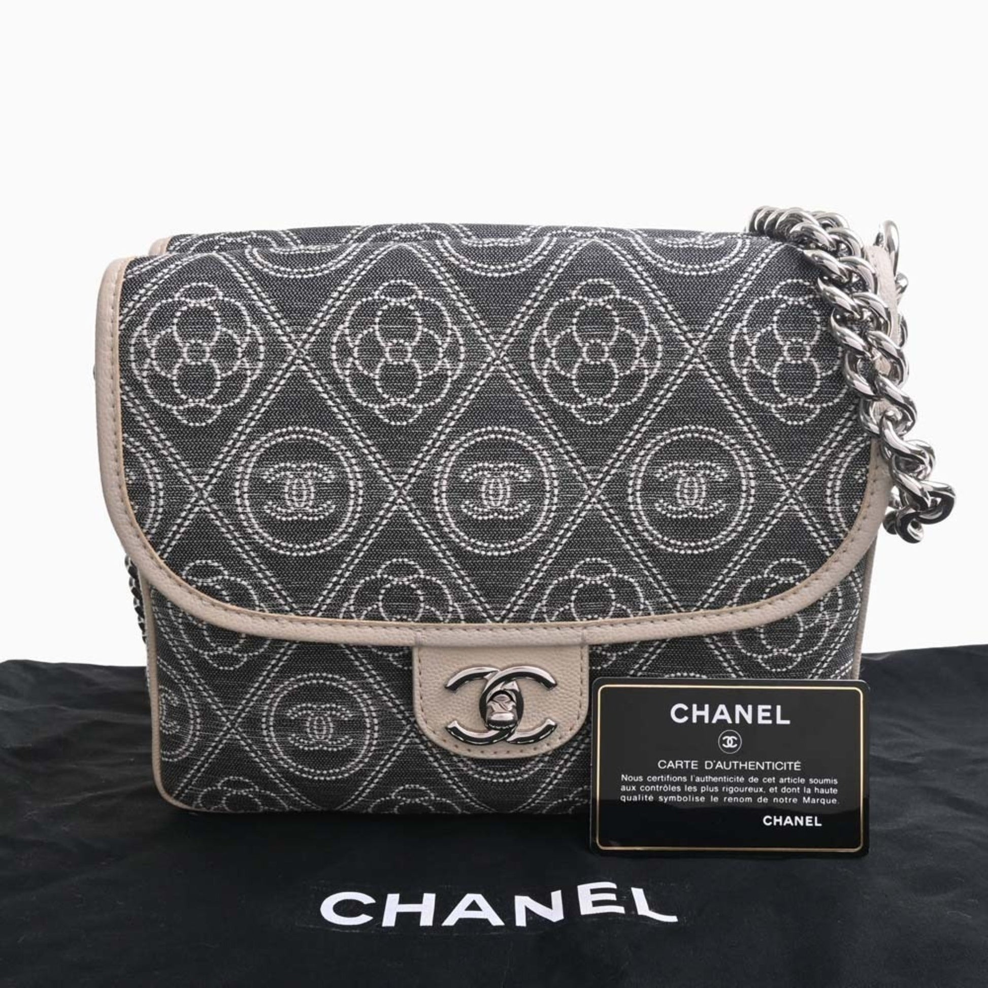 Chanel Canvas Camellia Coco Mark Chain Shoulder Bag Gray Ladies