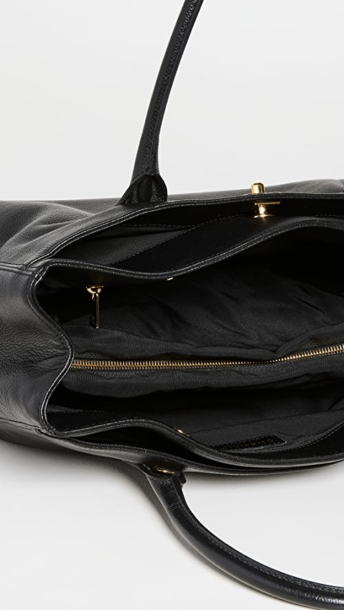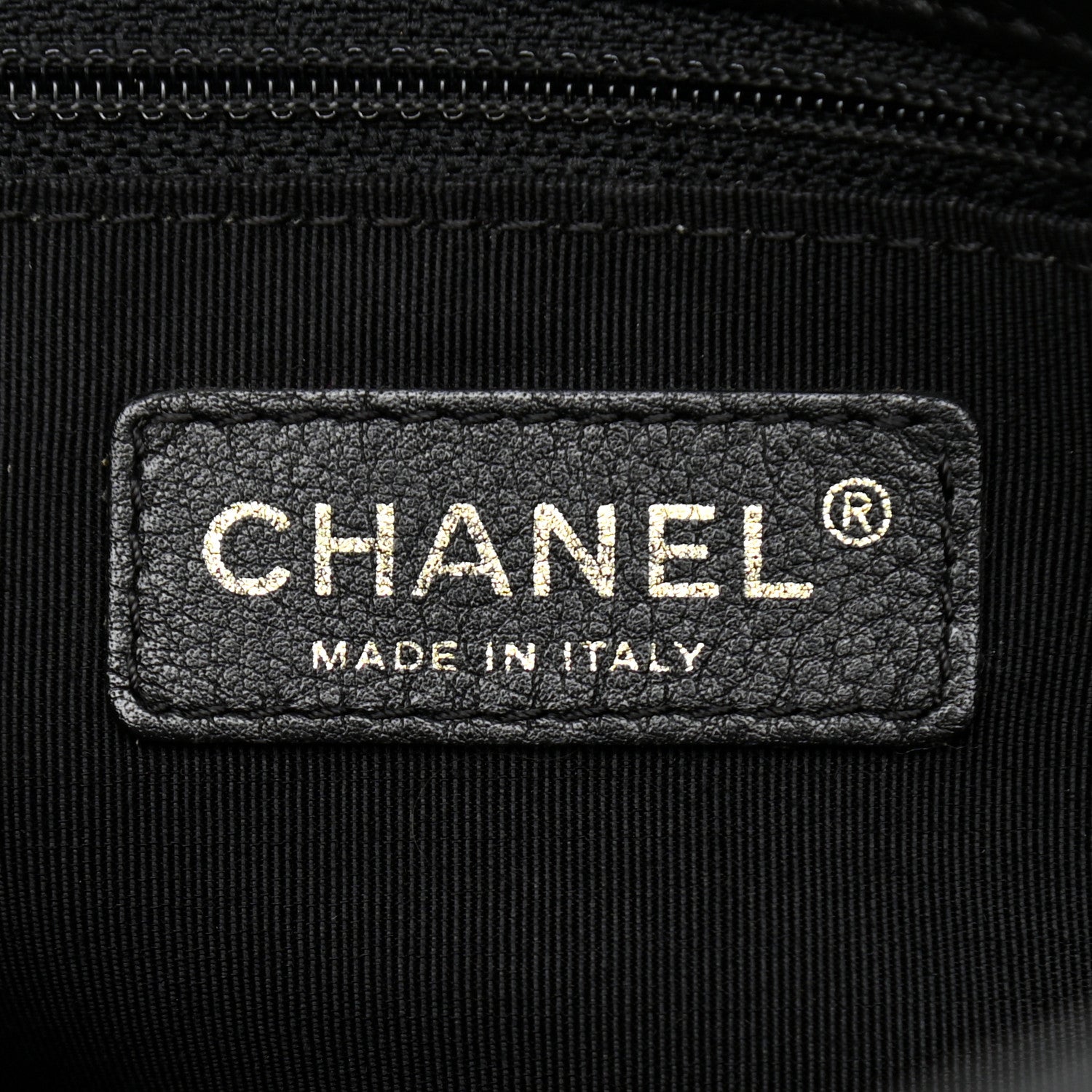 Crafted of Caviar calfskin leather in black. The shoulder bag features rolled leather top handles, and a polished gold Chanel CC turn lock. This opens to a black fabric interior with two zipper pockets