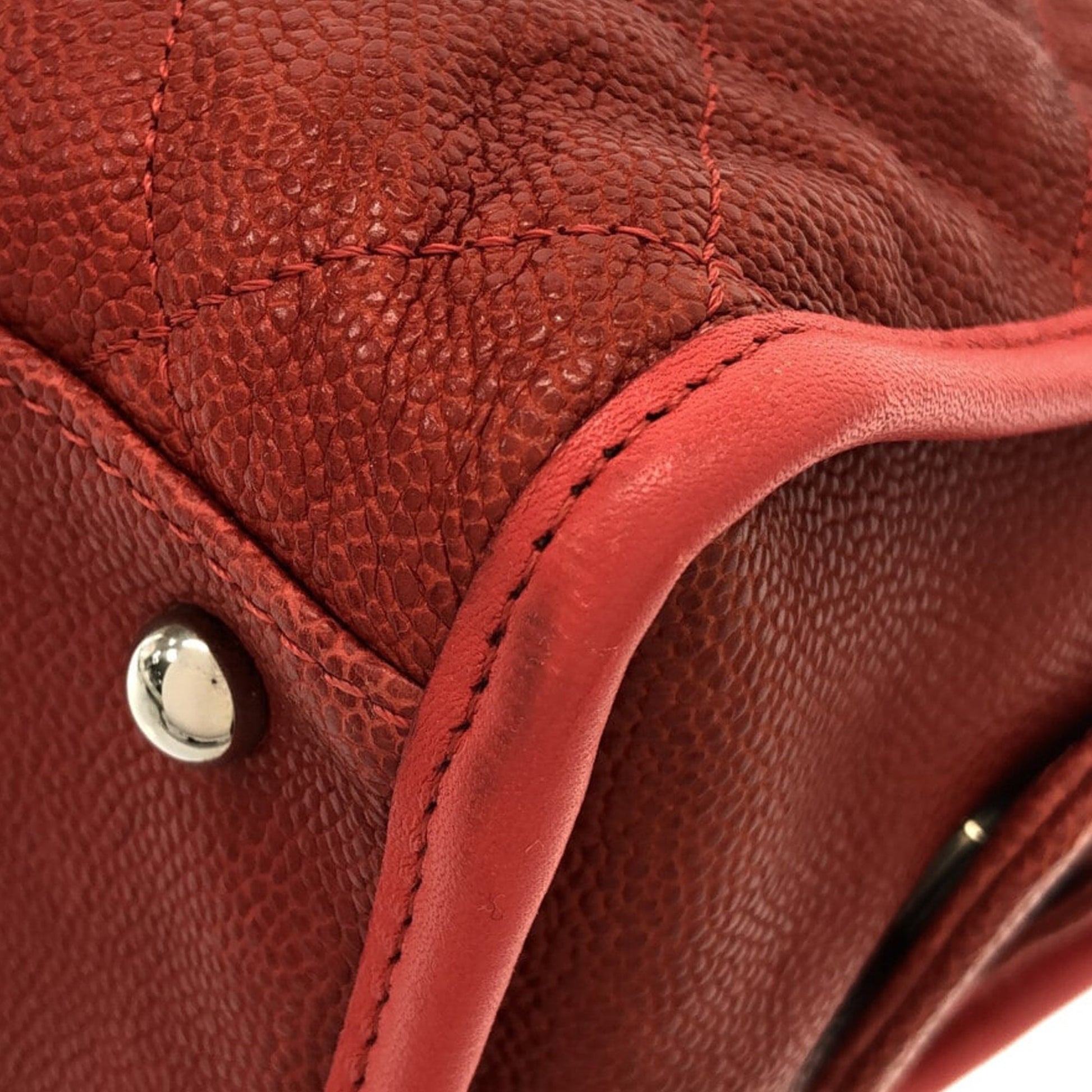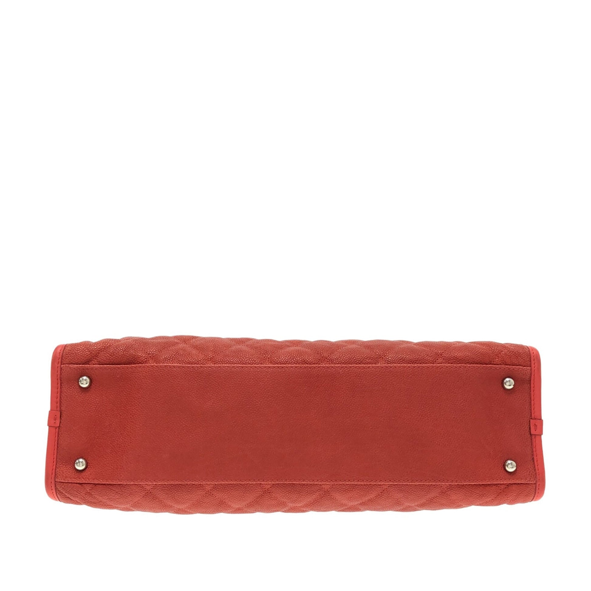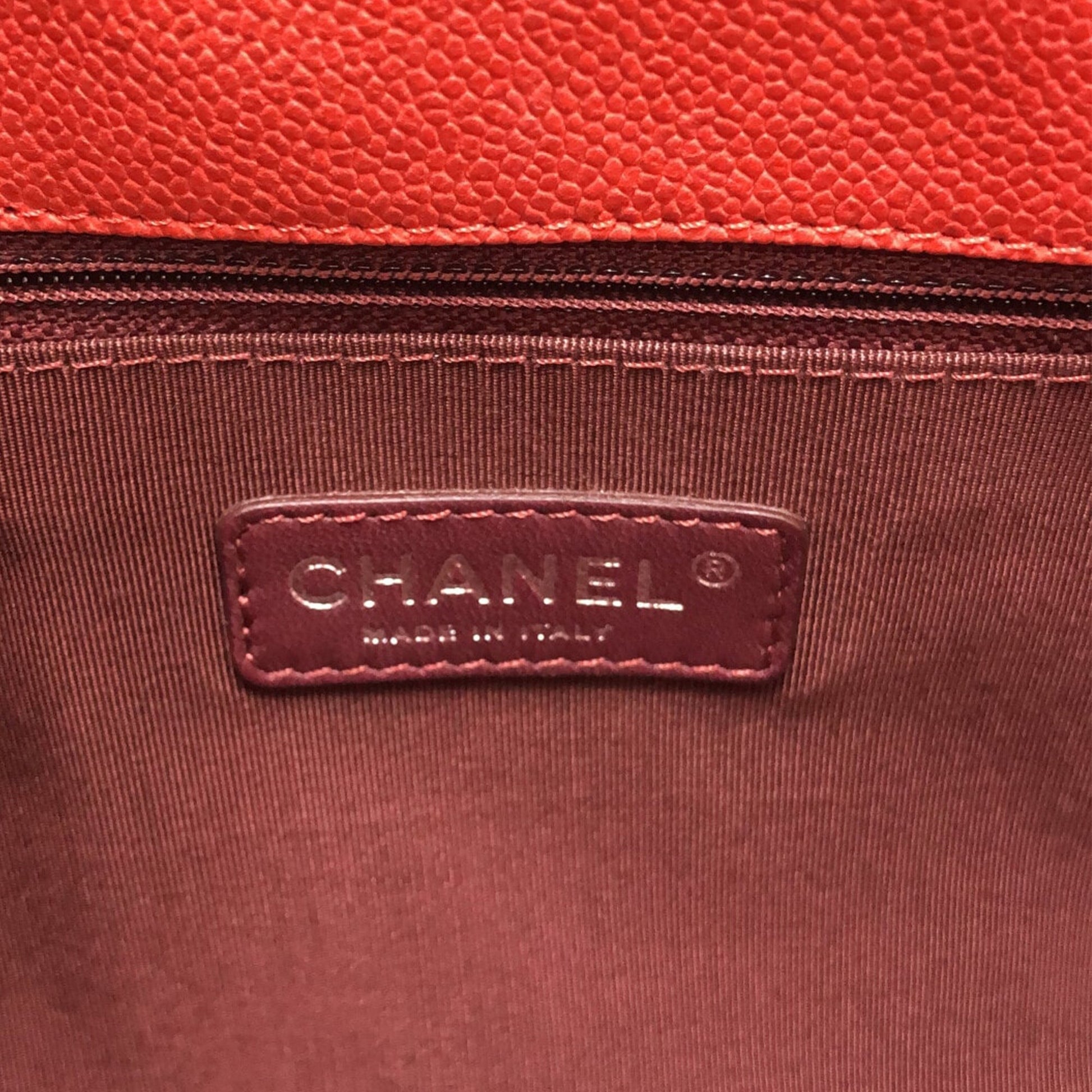This Tote Bag features a caviar leather body, leather woven chain straps, an open top with magnetic snap button closure, an interior zip compartment, and interior zip and slip pockets. Comes with .
